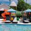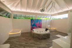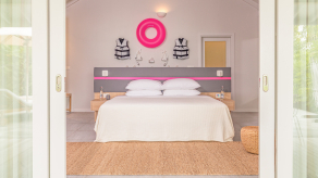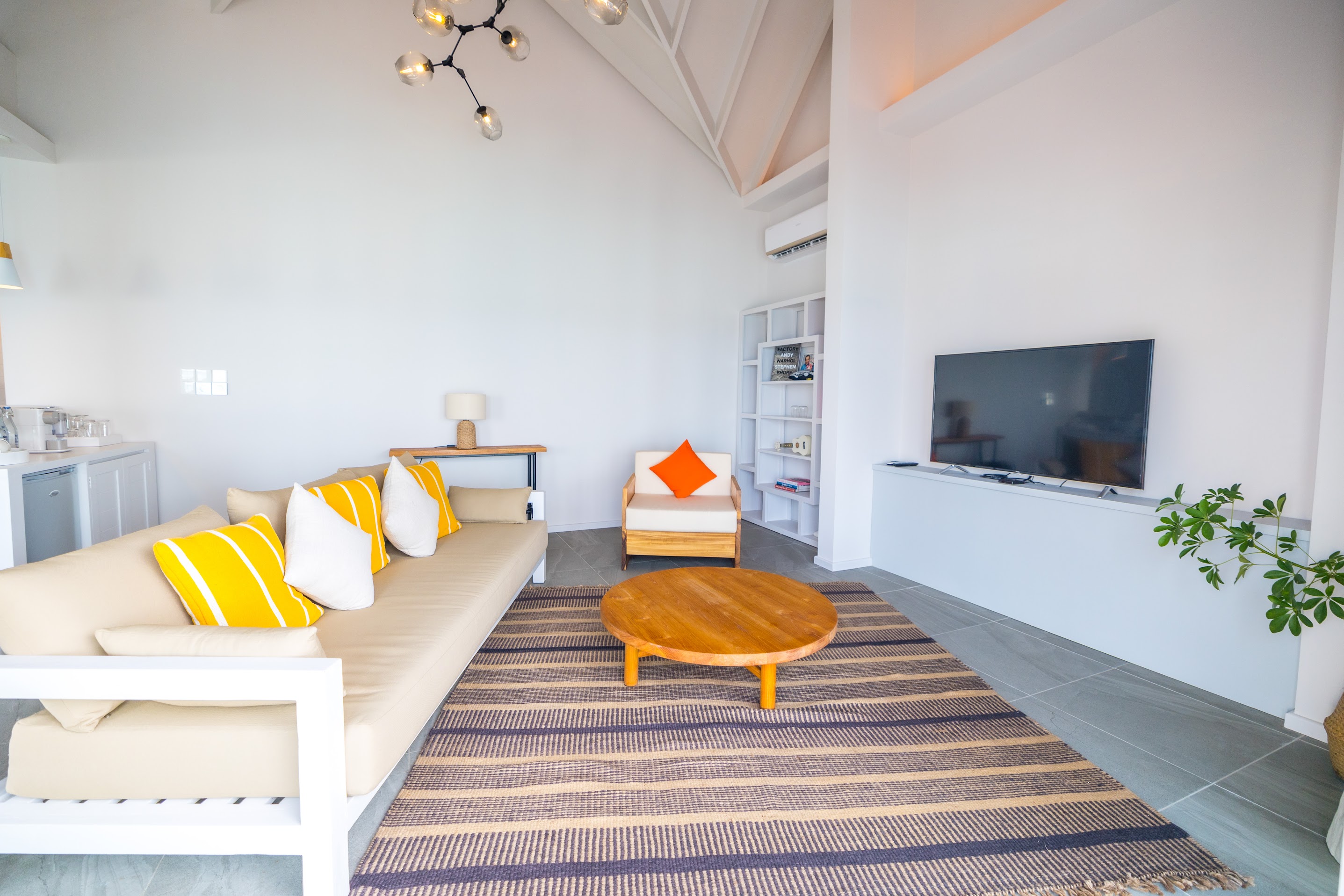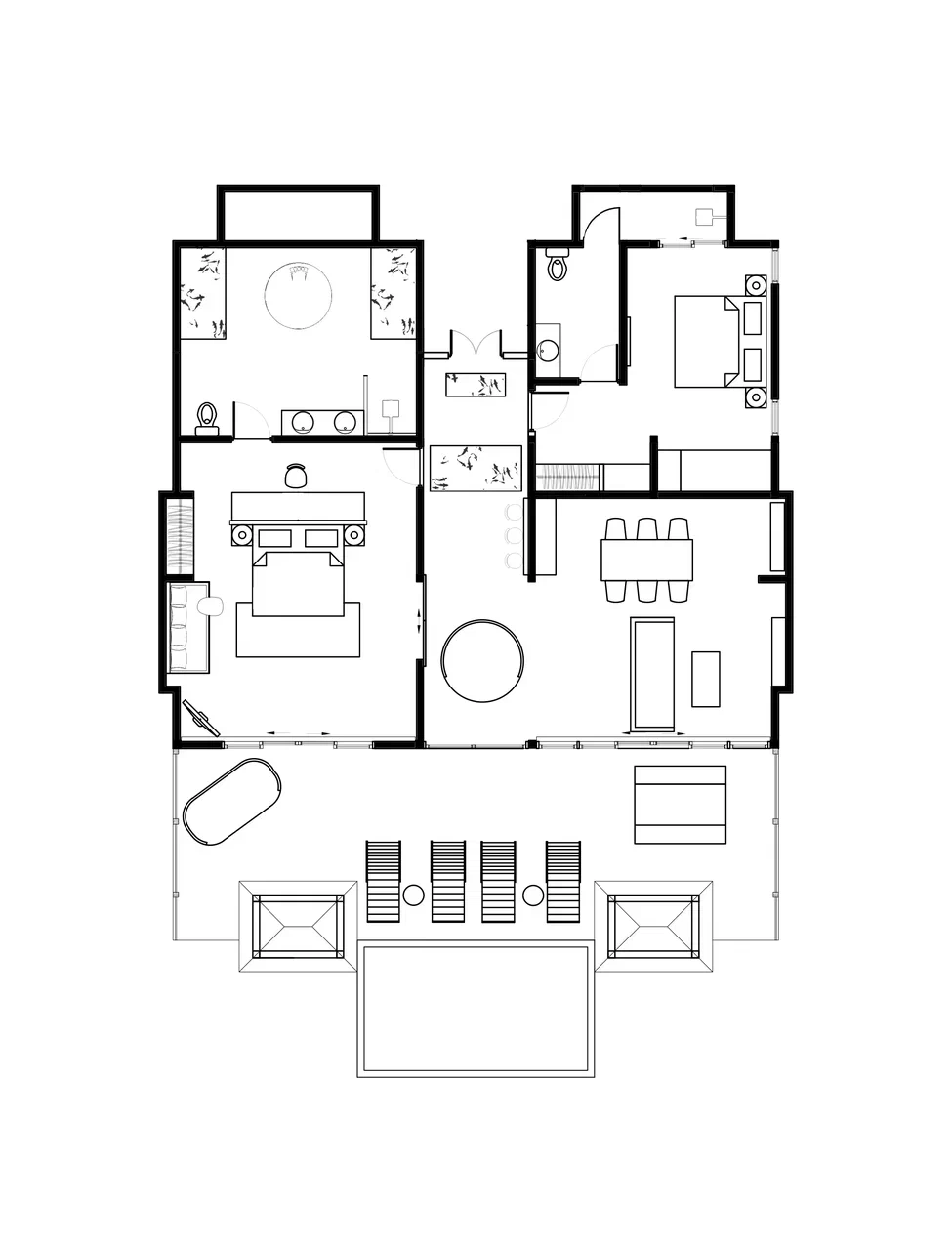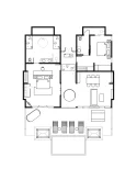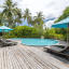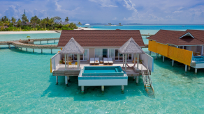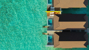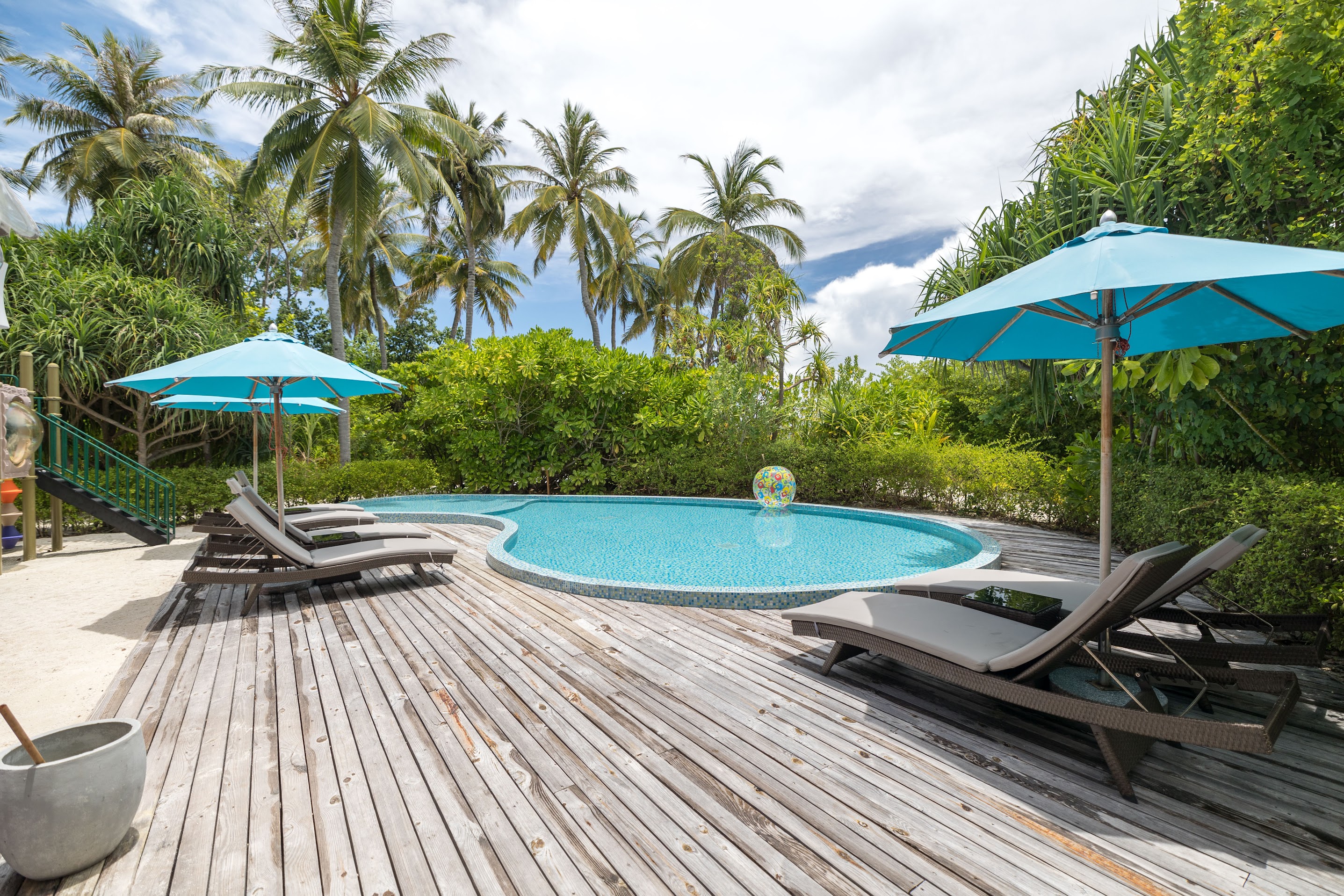 Вилла на воде. 2 спальни (одна – с кроватью king-size, другая – с кроватями twin), гостиная, обеденная зона, бар, 2 ванные комнаты (одна – с ванной и душевой кабиной, другая – с душевой кабиной), терраса с бассейном, беседками и прямым спуском к воде. Гостиная и спальни разделены дверями.