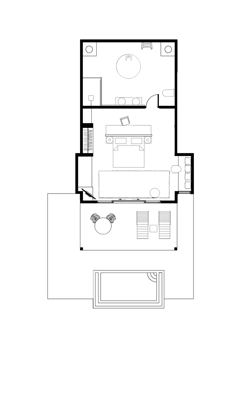 Вилла на берегу. Спальня с кроватью king-size, гостиная зона, ванная комната с ванной и душевой кабиной, терраса с бассейном.