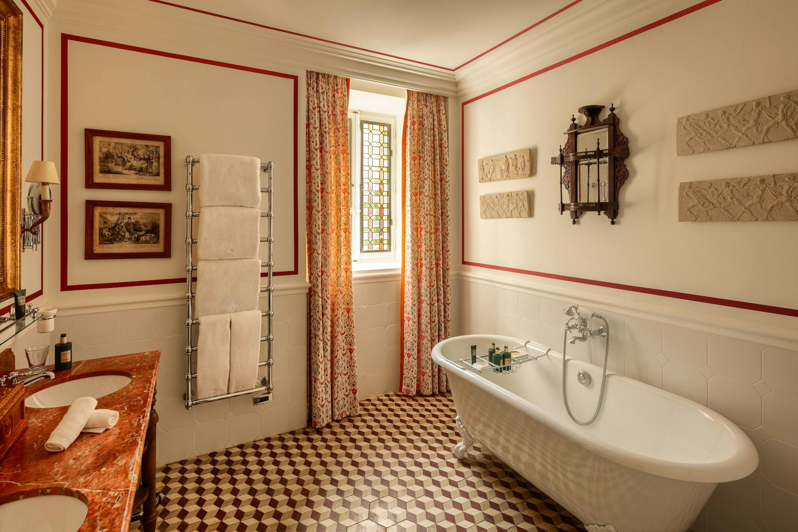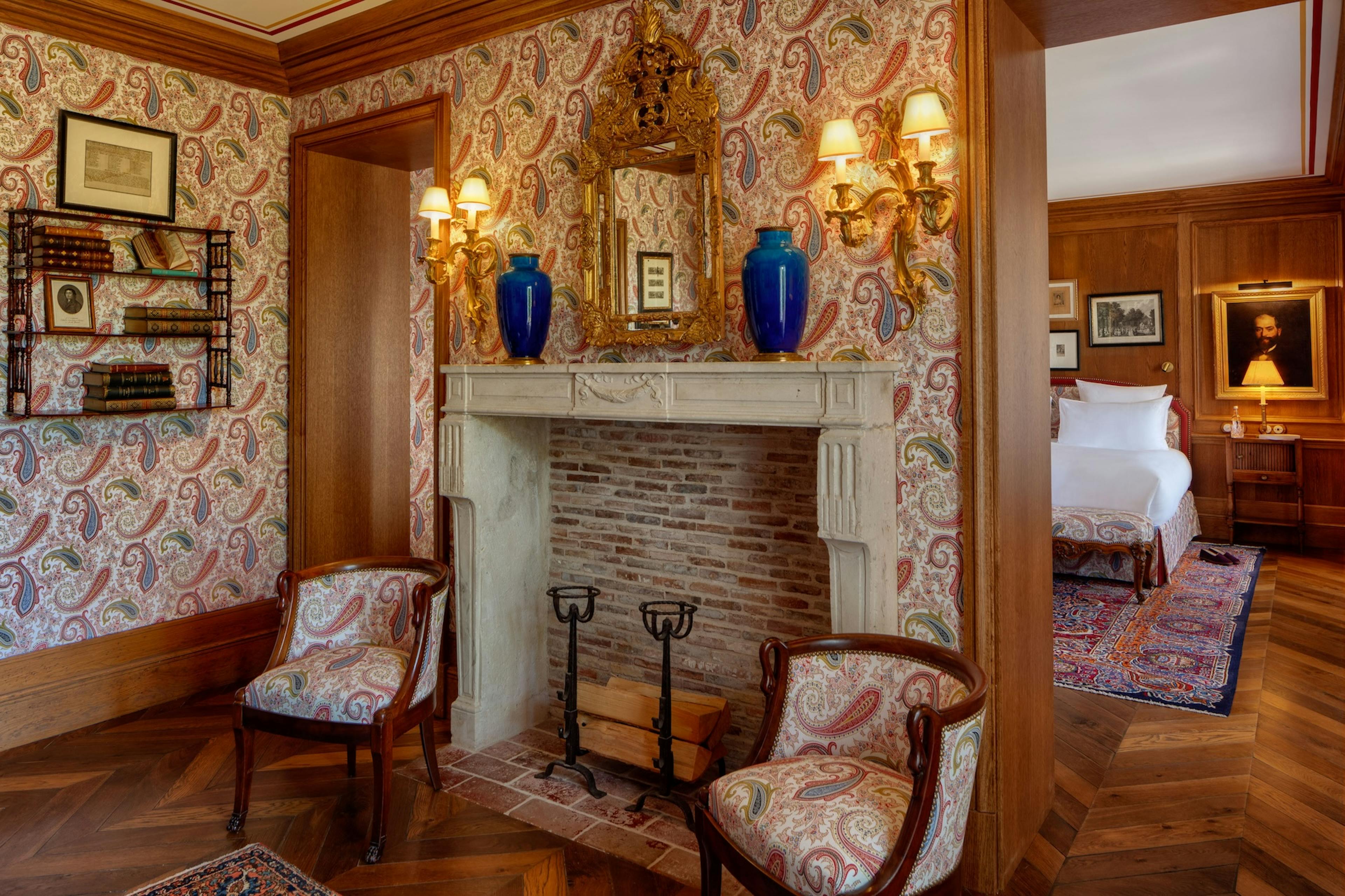Спальня с кроватью king-size и гостиной зоной, ванная комната с ванной или душем. В некоторых номерах есть камин.