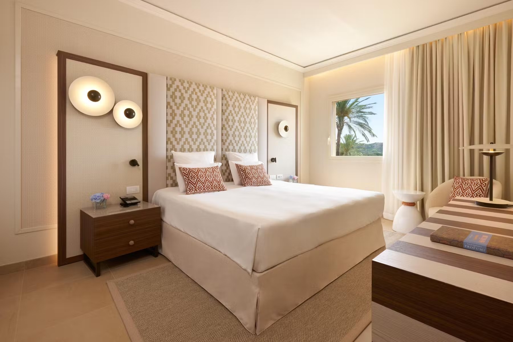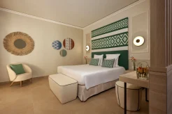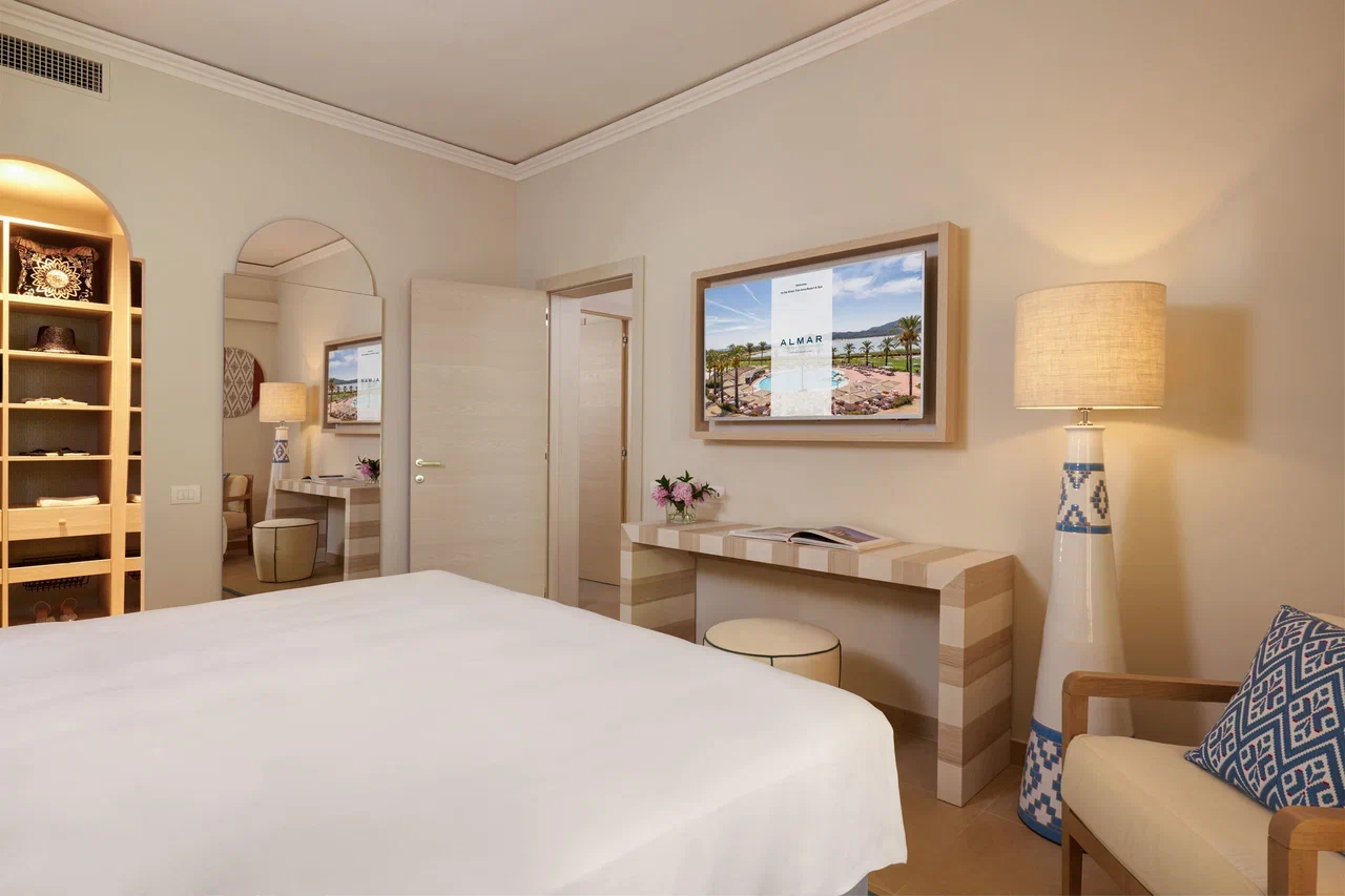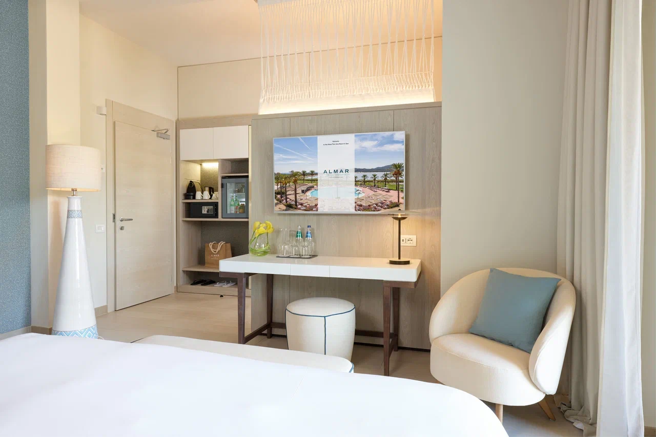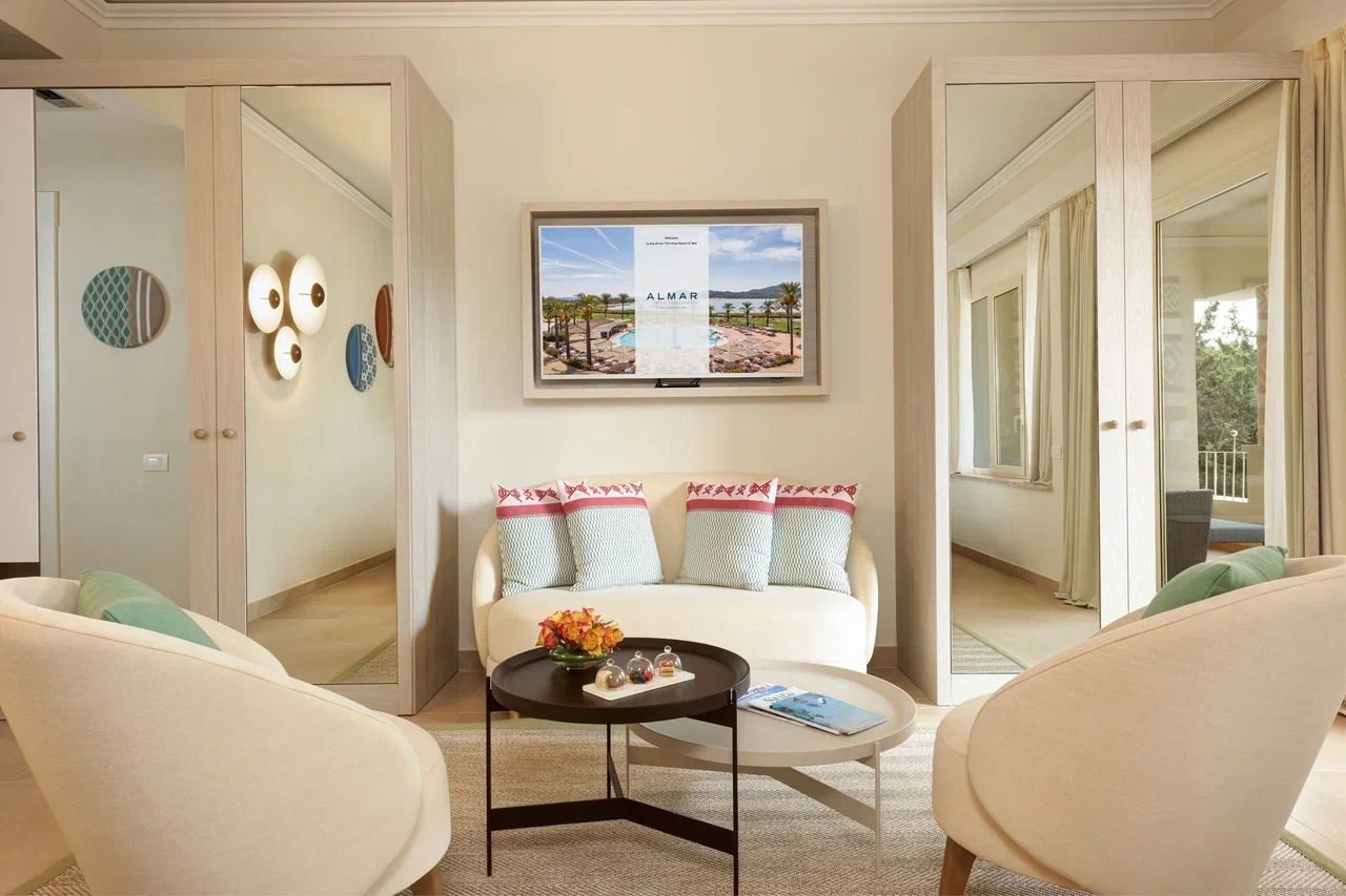 Курорт, входящий в сеть Almar, раскинулся на зелёной территории площадью 11 га на берегу прибрежного солёного озера, где гости могут наблюдать розовых фламинго в их естественной среде обитания. На соседнем мысе возвышается сторожевая башня XVI века – безмолвный страж, напоминающий о богатой истории этих мест. Интерьеры отеля вдохновлены окружающей природой и ремесленными традициями Сардинии. В палитре доминируют оттенки бежевого, бирюзового и шалфейного – цвета моря, песка и средиземноморской растительности. Мебель ручной работы из светлого дерева, бра, стилизованные под традиционные корзины corbule, подушки с плетёным узором и керамические лампы создают атмосферу аутентичного островного дома. В ванных комнатах представлены туалетные принадлежности итальянского бренда профессиональной органической косметики класса люкс Philip Martin’s.
