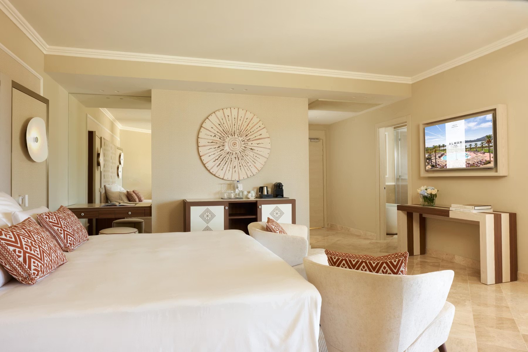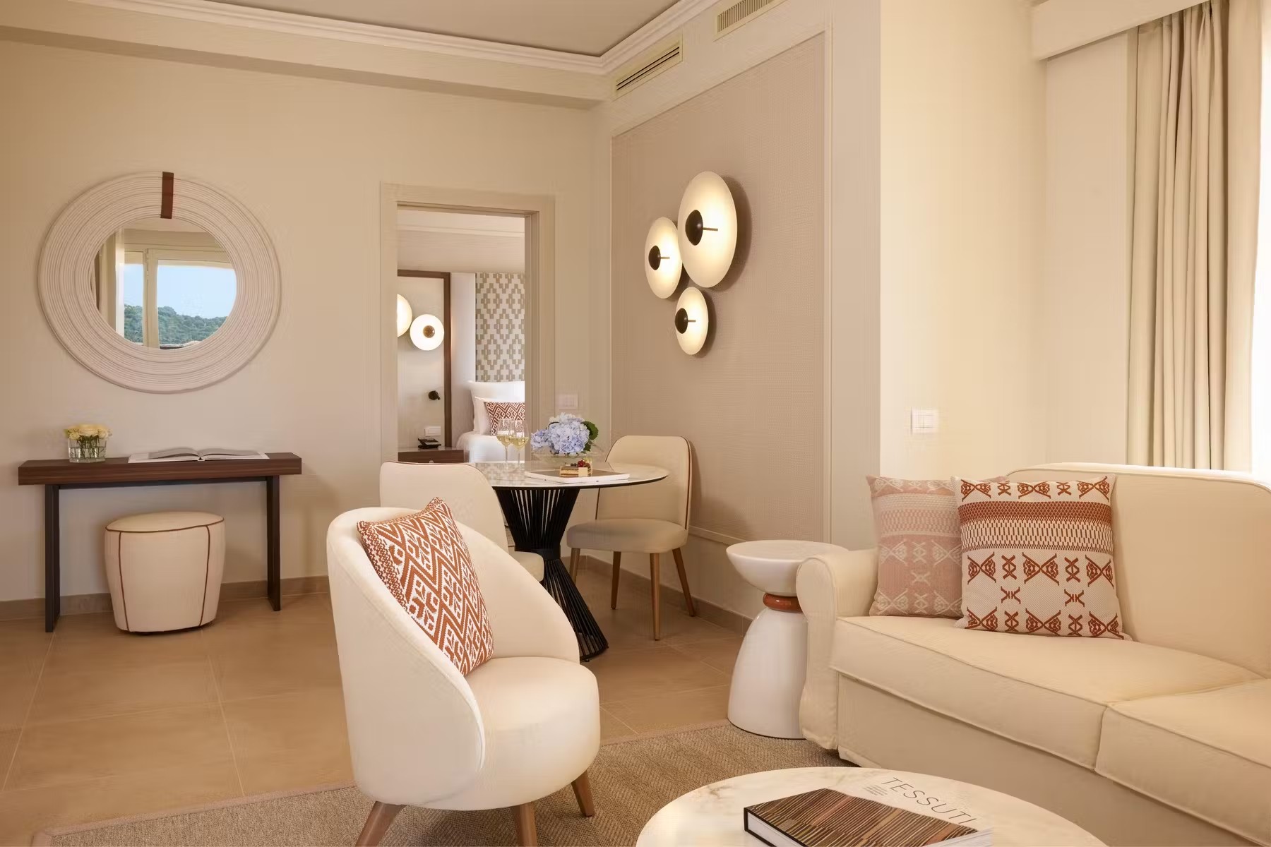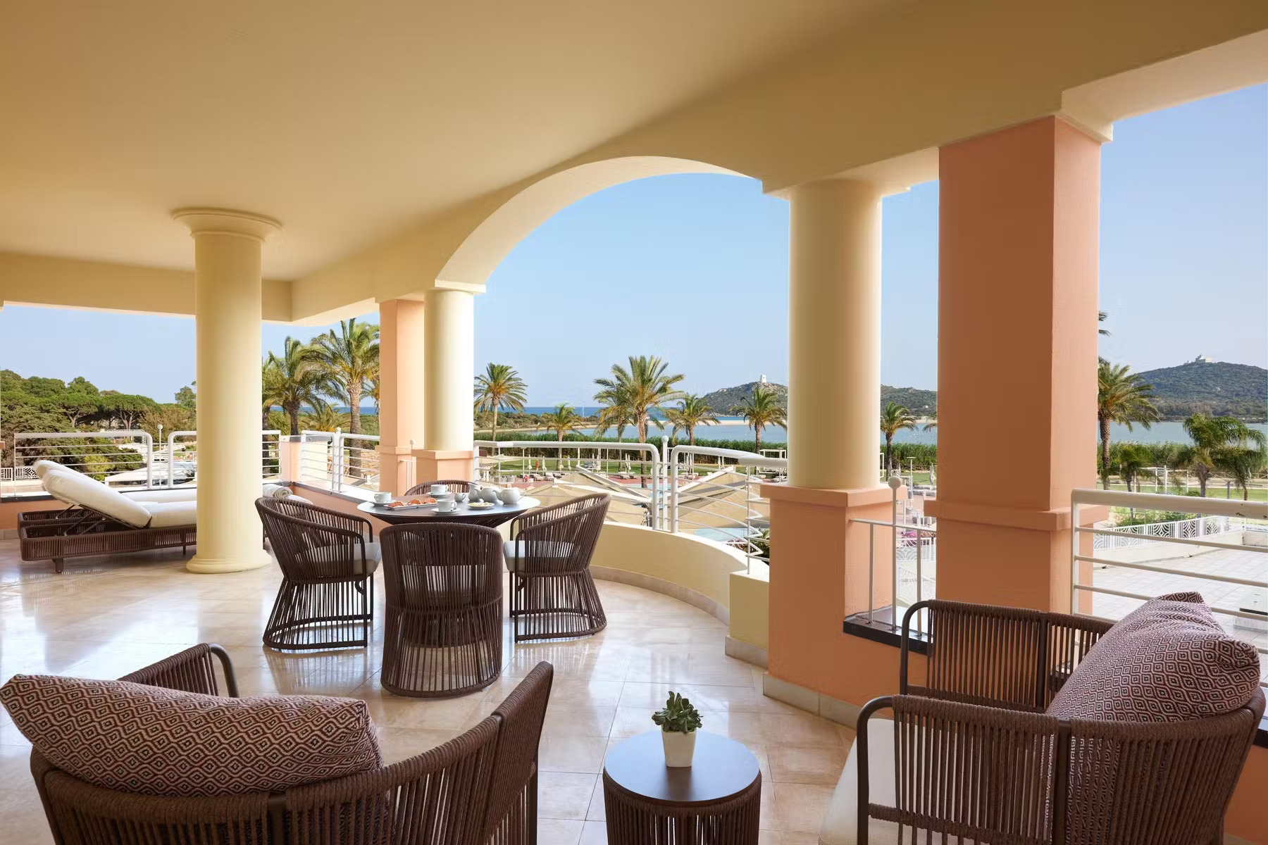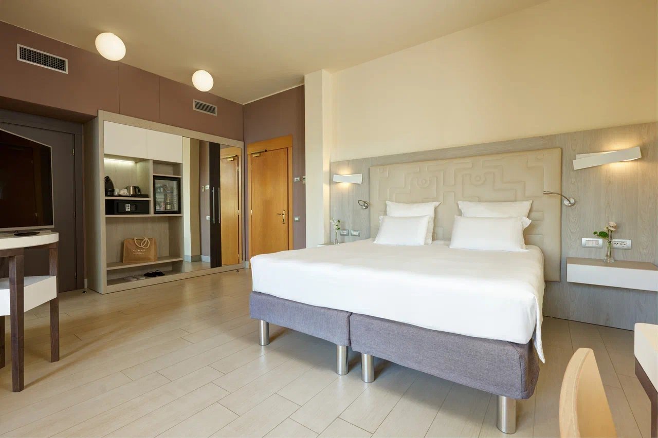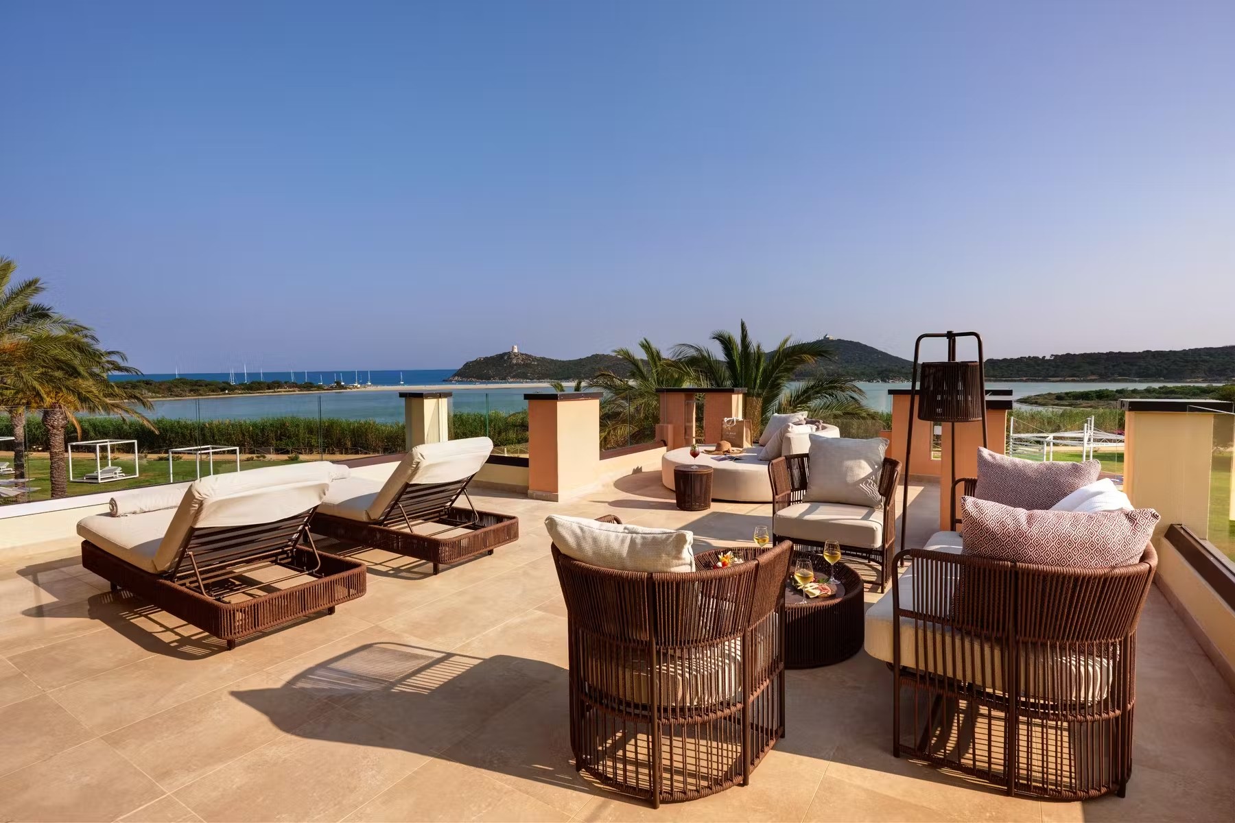 Курорт, входящий в сеть Almar, раскинулся на зелёной территории площадью 11 га на берегу прибрежного солёного озера, где гости могут наблюдать розовых фламинго в их естественной среде обитания. На соседнем мысе возвышается сторожевая башня XVI века – безмолвный страж, напоминающий о богатой истории этих мест. Интерьеры отеля вдохновлены окружающей природой и ремесленными традициями Сардинии. В палитре доминируют оттенки бежевого, бирюзового и шалфейного – цвета моря, песка и средиземноморской растительности. Мебель ручной работы из светлого дерева, бра, стилизованные под традиционные корзины corbule, подушки с плетёным узором и керамические лампы создают атмосферу аутентичного островного дома. В ванных комнатах представлены туалетные принадлежности итальянского бренда профессиональной органической косметики класса люкс Philip Martin’s.