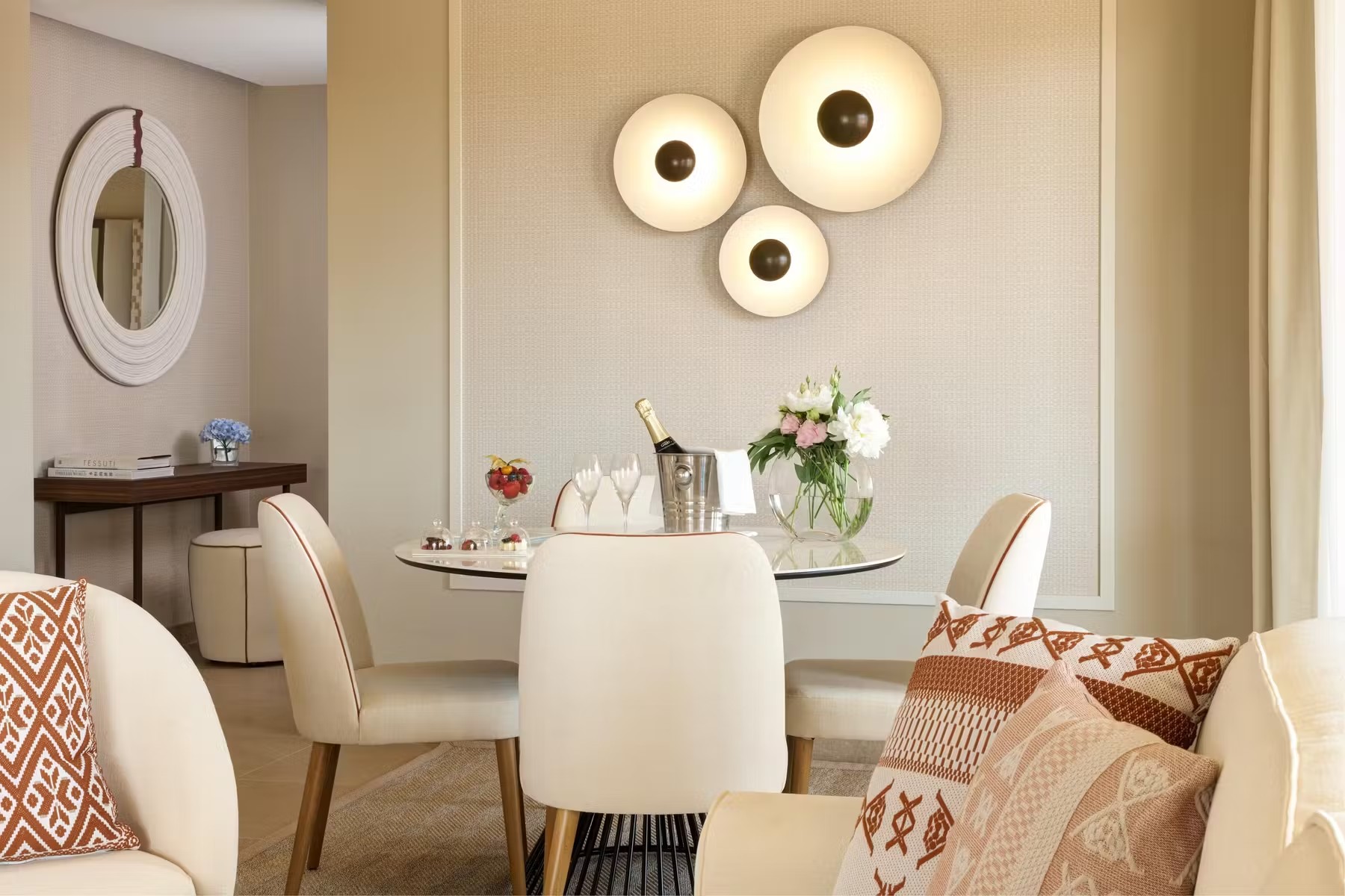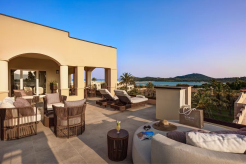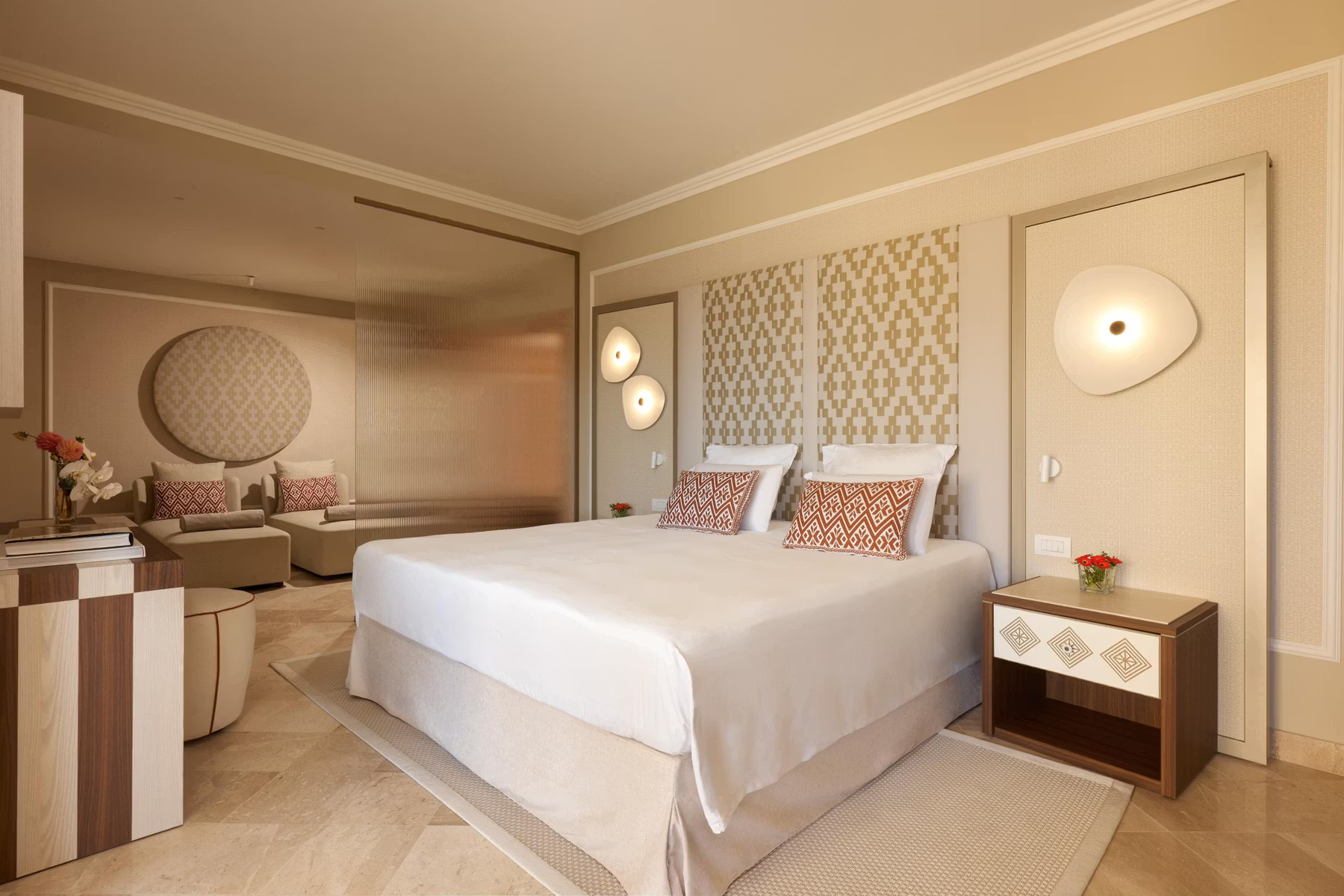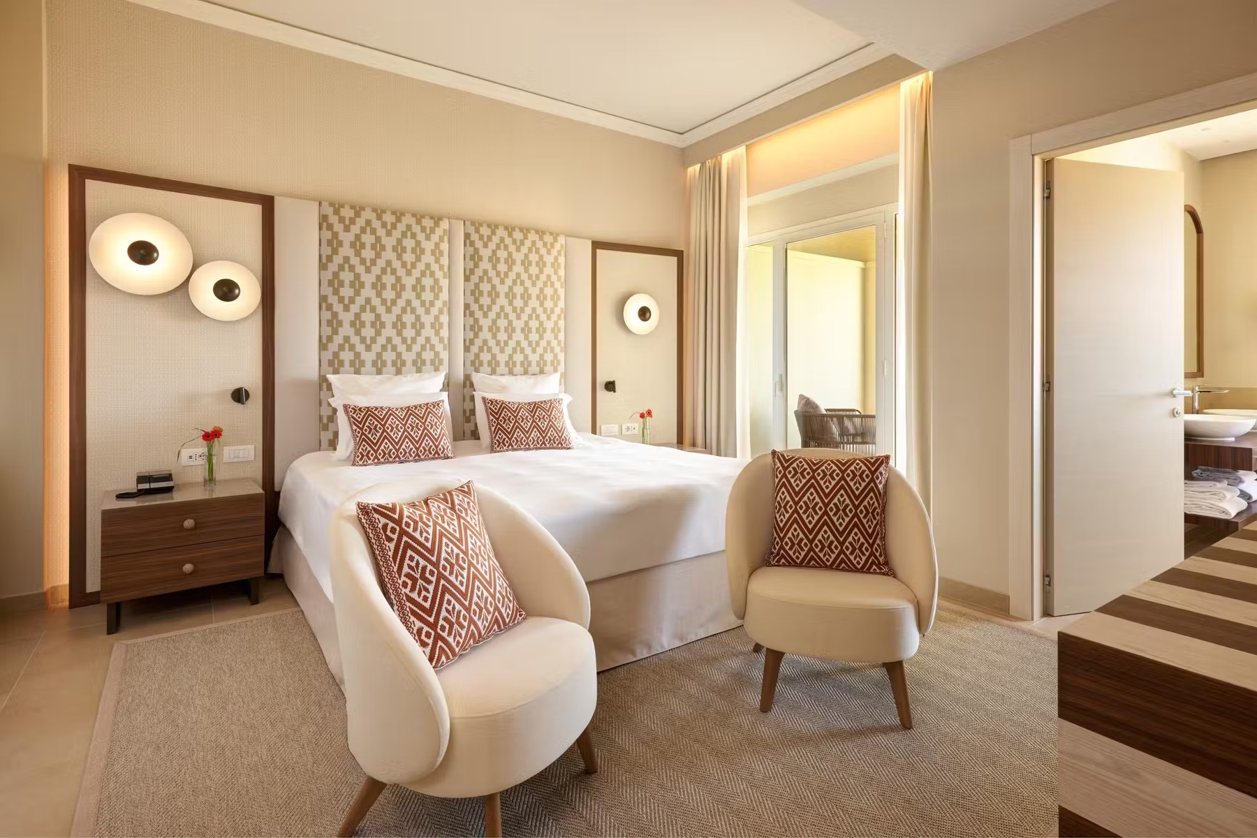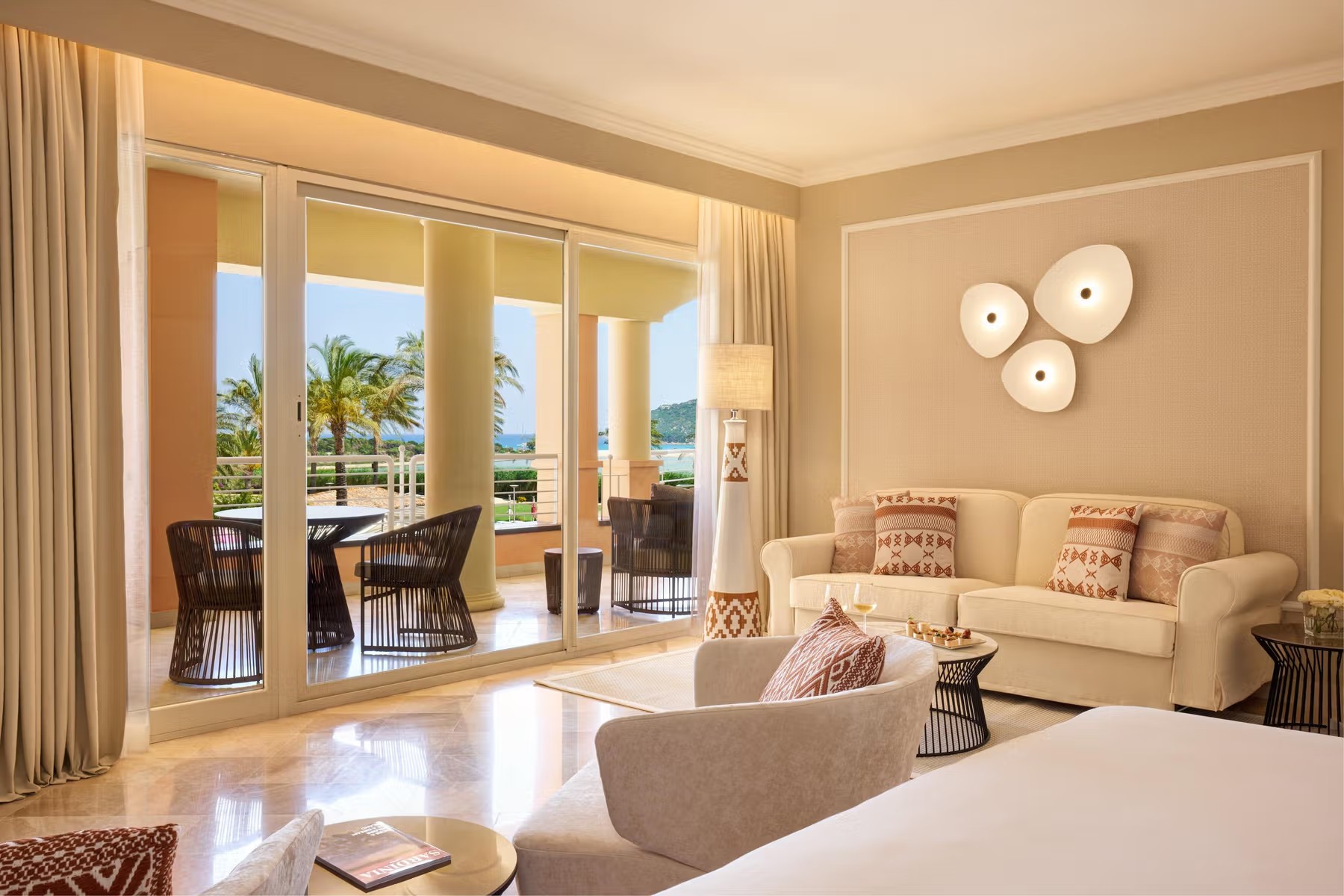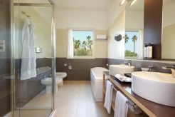Курорт, входящий в сеть Almar, раскинулся на зелёной территории площадью 11 га на берегу прибрежного солёного озера, где гости могут наблюдать розовых фламинго в их естественной среде обитания. На соседнем мысе возвышается сторожевая башня XVI века – безмолвный страж, напоминающий о богатой истории этих мест. Интерьеры отеля вдохновлены окружающей природой и ремесленными традициями Сардинии. В палитре доминируют оттенки бежевого, бирюзового и шалфейного – цвета моря, песка и средиземноморской растительности. Мебель ручной работы из светлого дерева, бра, стилизованные под традиционные корзины corbule, подушки с плетёным узором и керамические лампы создают атмосферу аутентичного островного дома. В ванных комнатах представлены туалетные принадлежности итальянского бренда профессиональной органической косметики класса люкс Philip Martin’s.