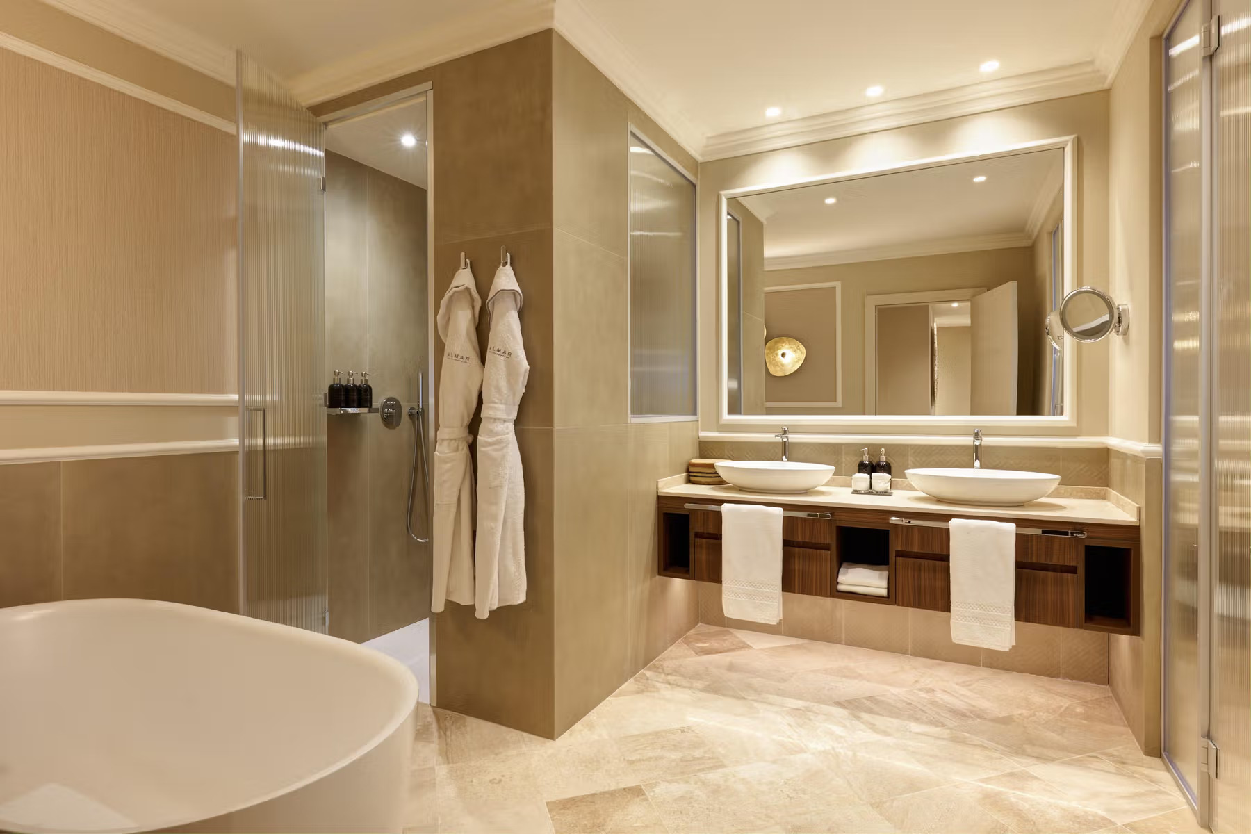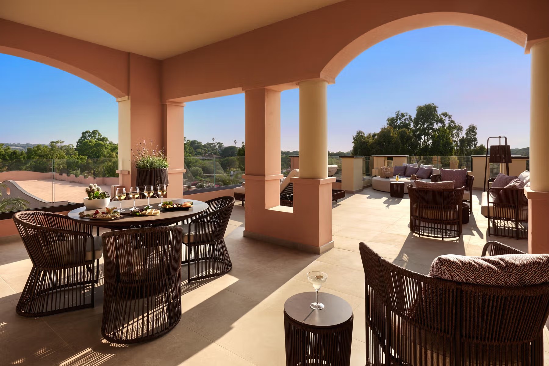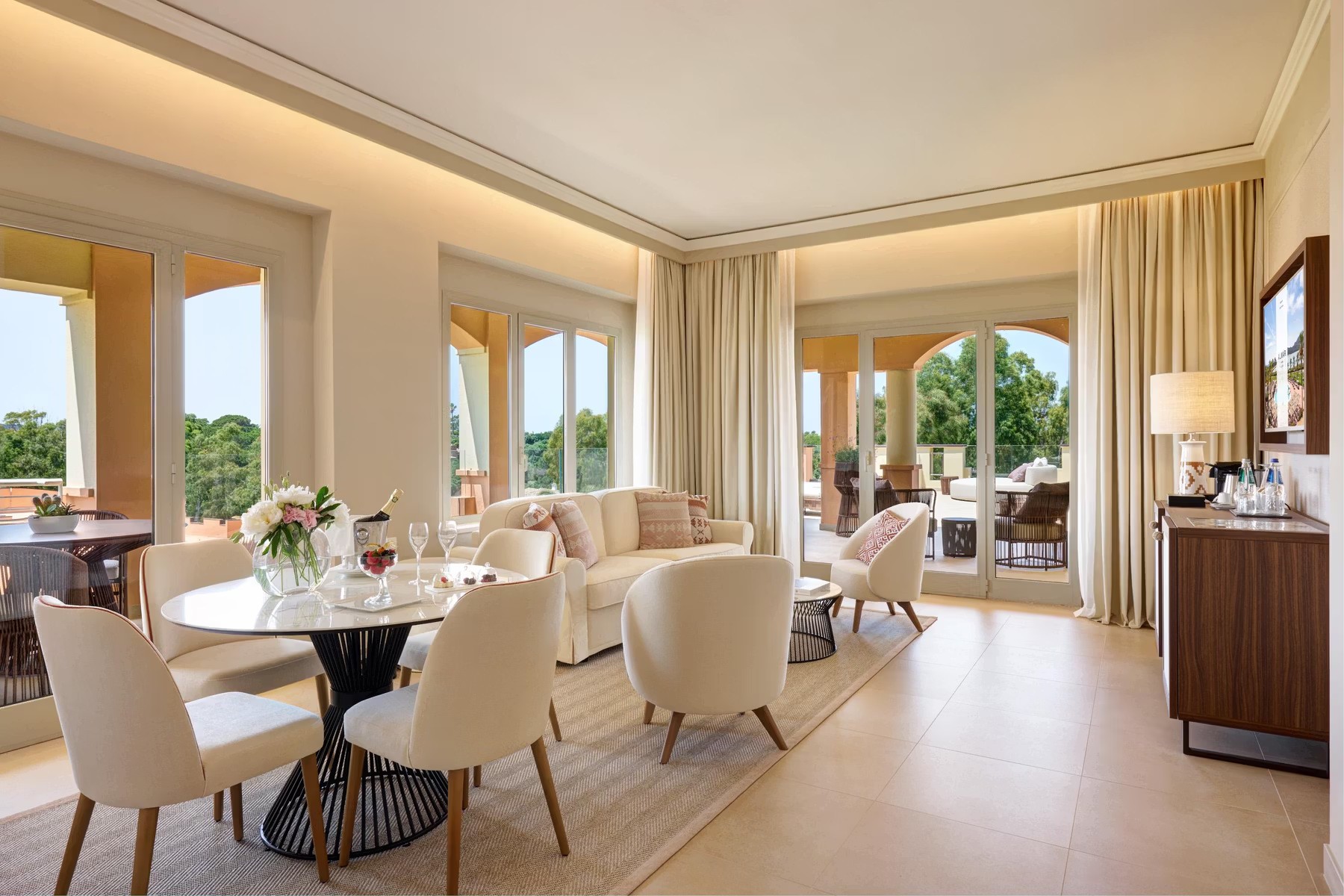 Спальня с кроватью king-size, гостиная с обеденной зоной, гардеробная, 2 ванные комнаты (одна – с ванной и душевой кабиной, другая – с душевой кабиной), сауна, 2 массажные кровати, терраса. Гостиная и спальня разделены дверью.