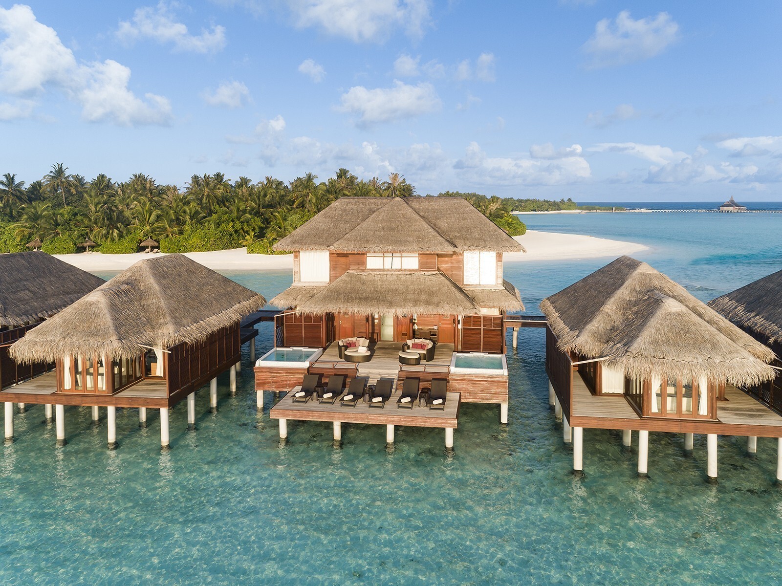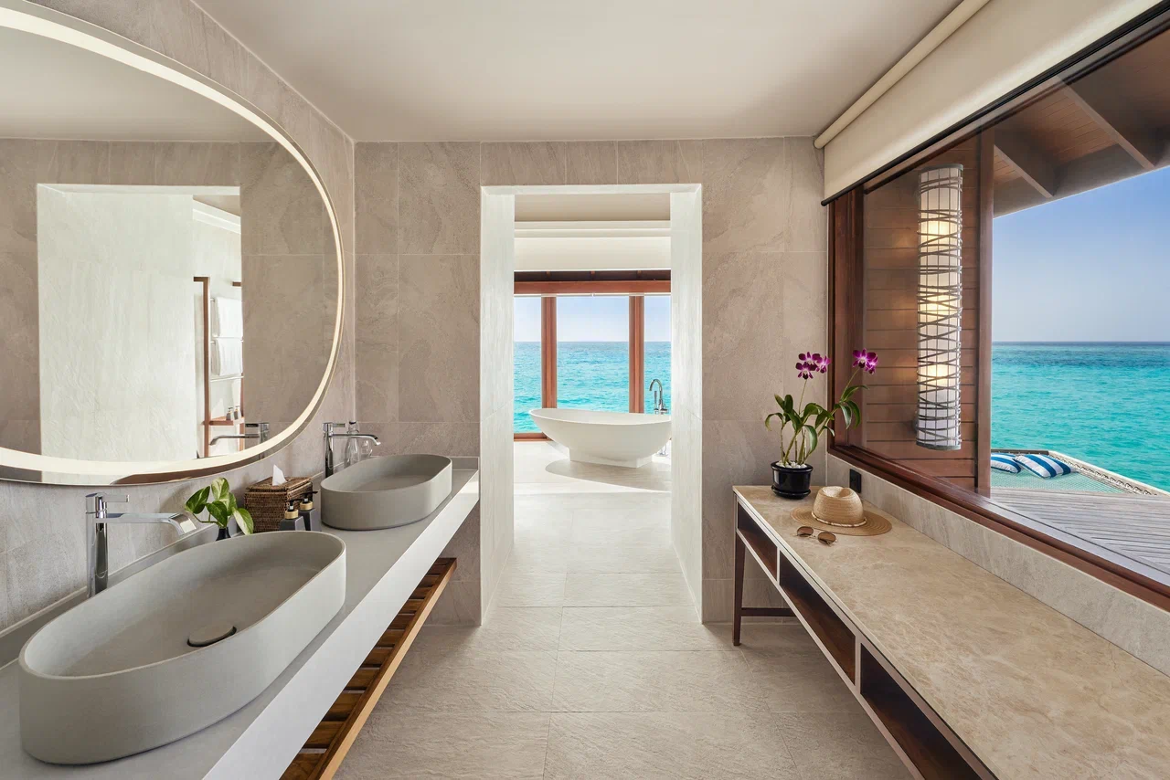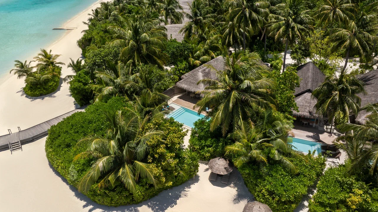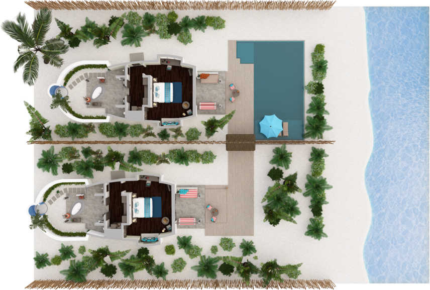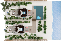 2 соединённые виллы на берегу. 2 спальни с кроватями king-size, 2 гардеробные, 2 ванные комнаты с ванной и душевой кабиной на открытом воздухе, 2 душа на открытом воздухе, терраса с бассейном.