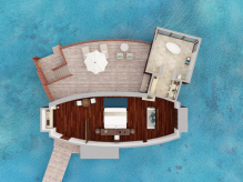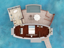 Вилла на воде. Спальня с кроватью king-size, гостиная зона, ванная комната с ванной и душевой кабиной, душ на открытом воздухе, терраса с бассейном и прямым спуском к воде.
