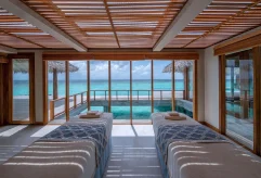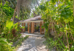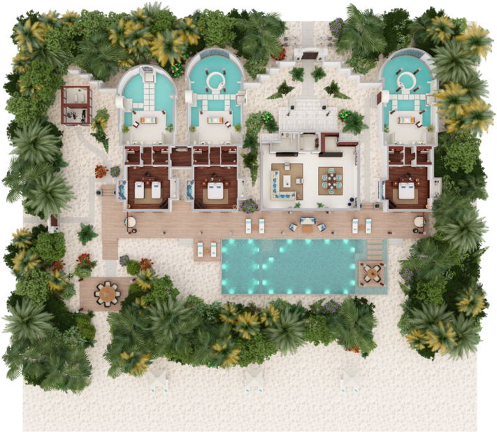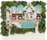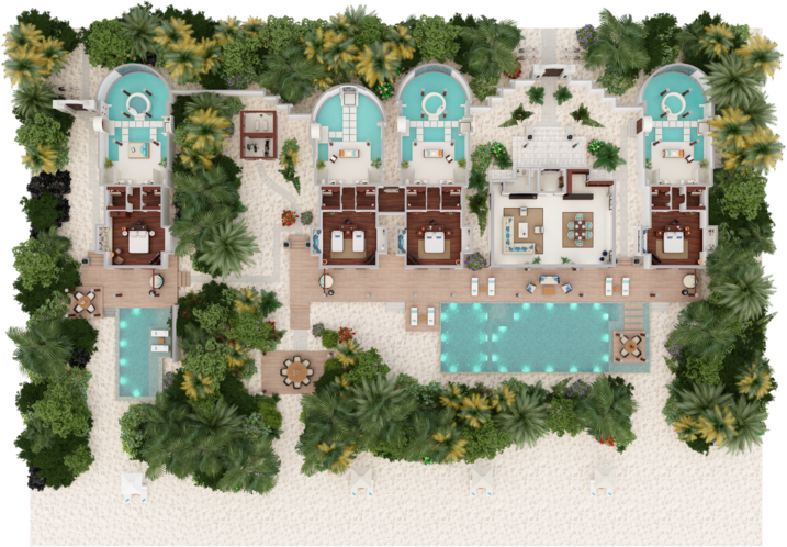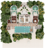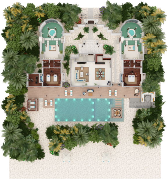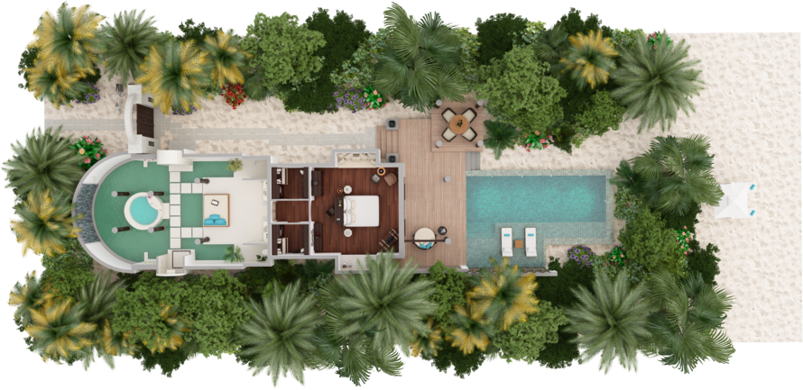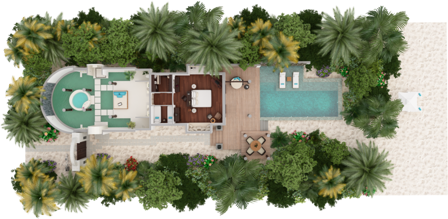 Вилла на берегу. 2 спальни (одна – с кроватью king-size, другая – с кроватями twin), гостиная с обеденной зоной, кухня, 2 гардеробные, 2 ванные комнаты (каждая с душевой кабиной и ванной и душем на открытом воздухе), гостевой туалет, тренажёрный зал, павильон для спа-процедур, терраса с бассейном и беседкой. Гостиная и спальни разделены дверями.