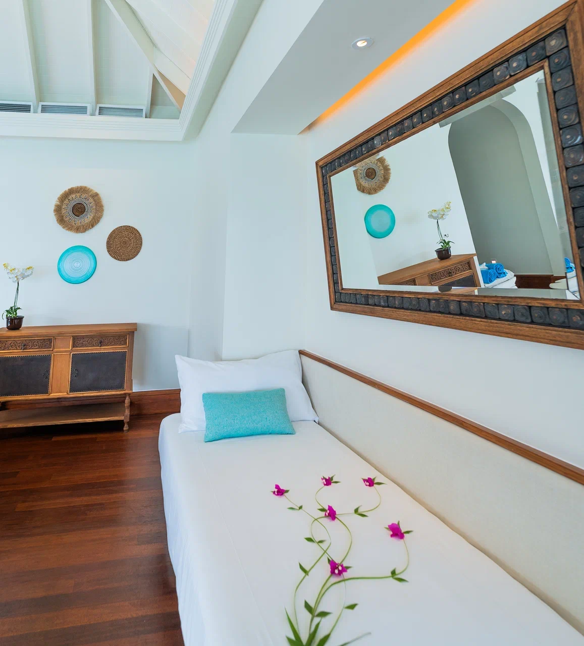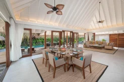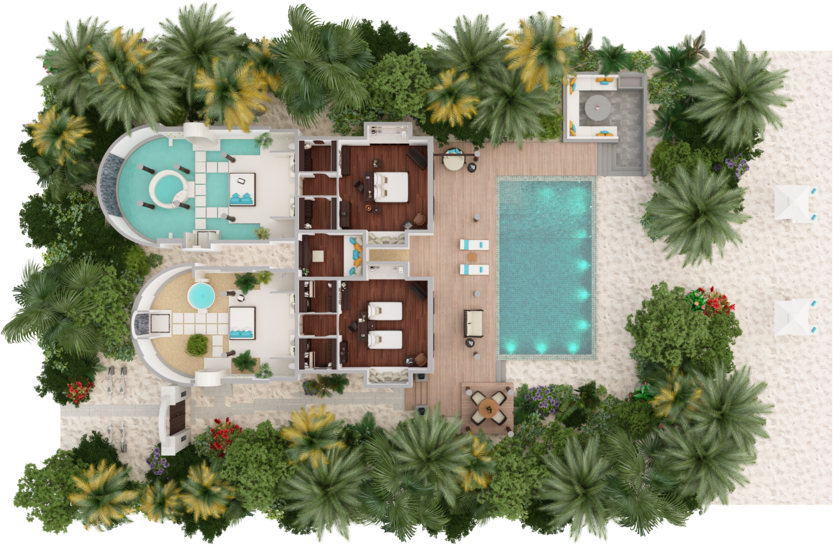 2 соединённые виллы на берегу категорий Three Bedroom Beach Pool Residence и Beach Pool Villa. 4 спальни, 4 ванные комнаты, 1 гостевой туалет.