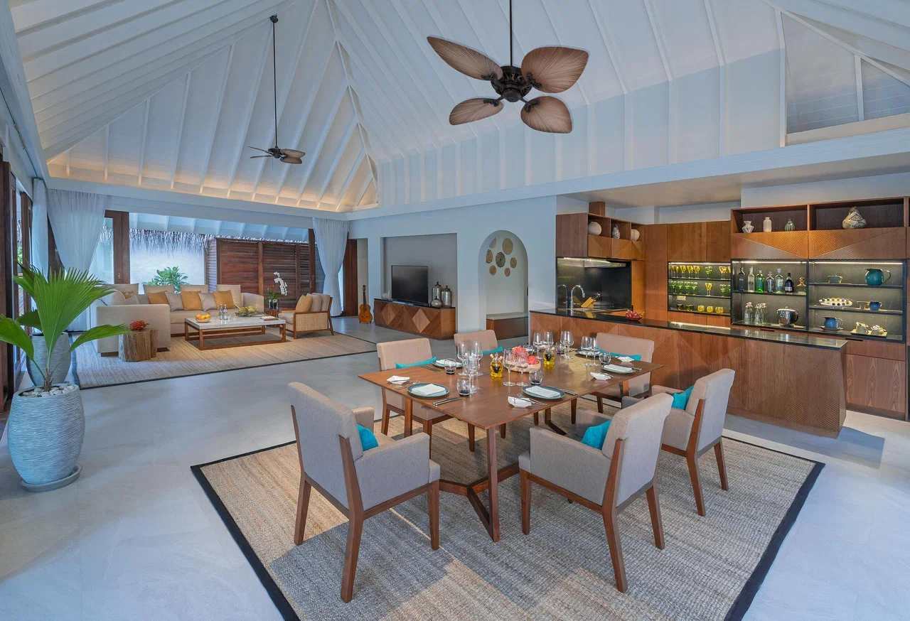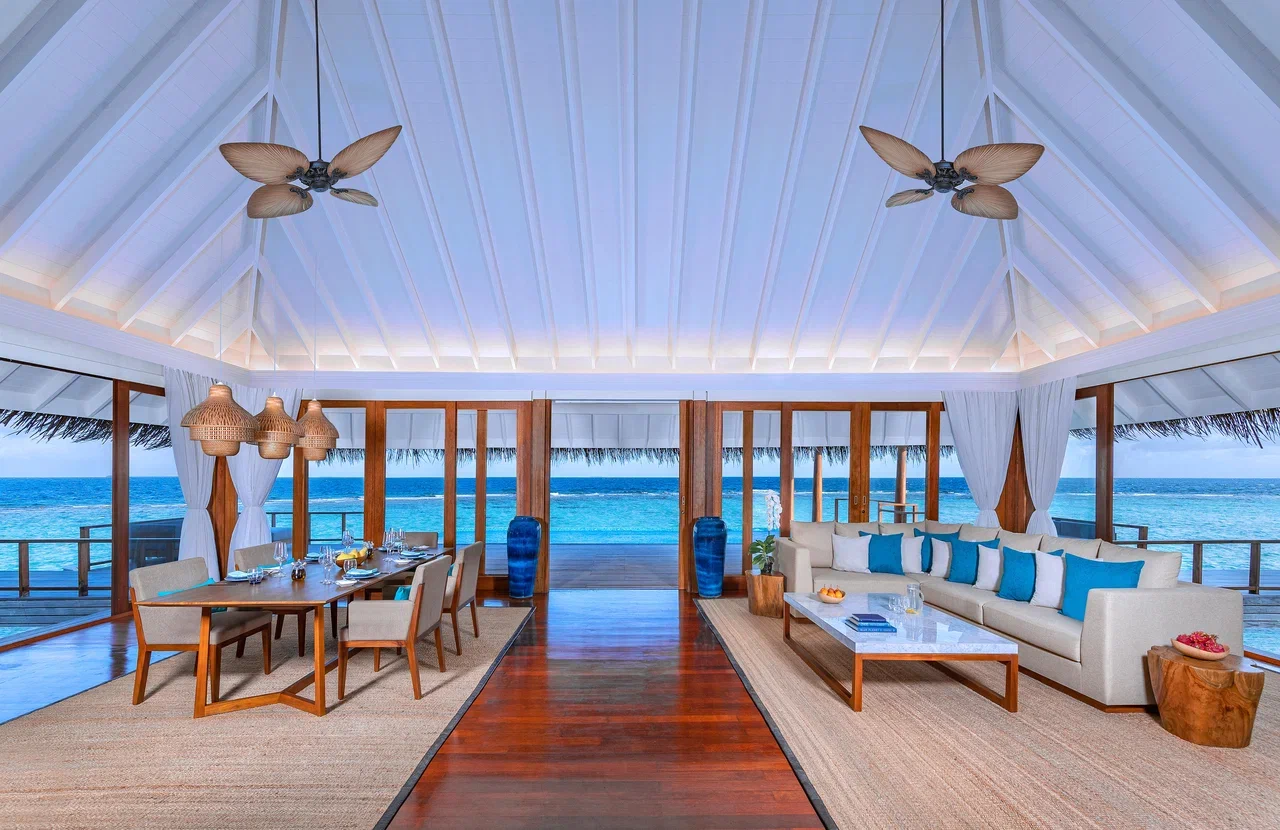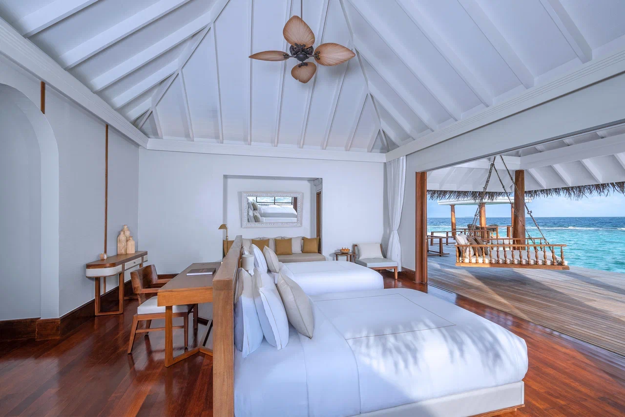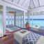 Вилла на воде. 2 спальни (одна – с кроватью king-size, другая – с кроватями twin), гостиная с обеденной зоной, кухня, 2 гардеробные, 2 ванные комнаты (каждая с душевой кабиной и ванной и душем на открытом воздухе), гостевой туалет, тренажёрный зал, комната для спа-процедур, терраса с бассейном, беседкой и прямым спуском к воде. Гостиная и спальни разделены дверями.