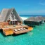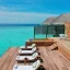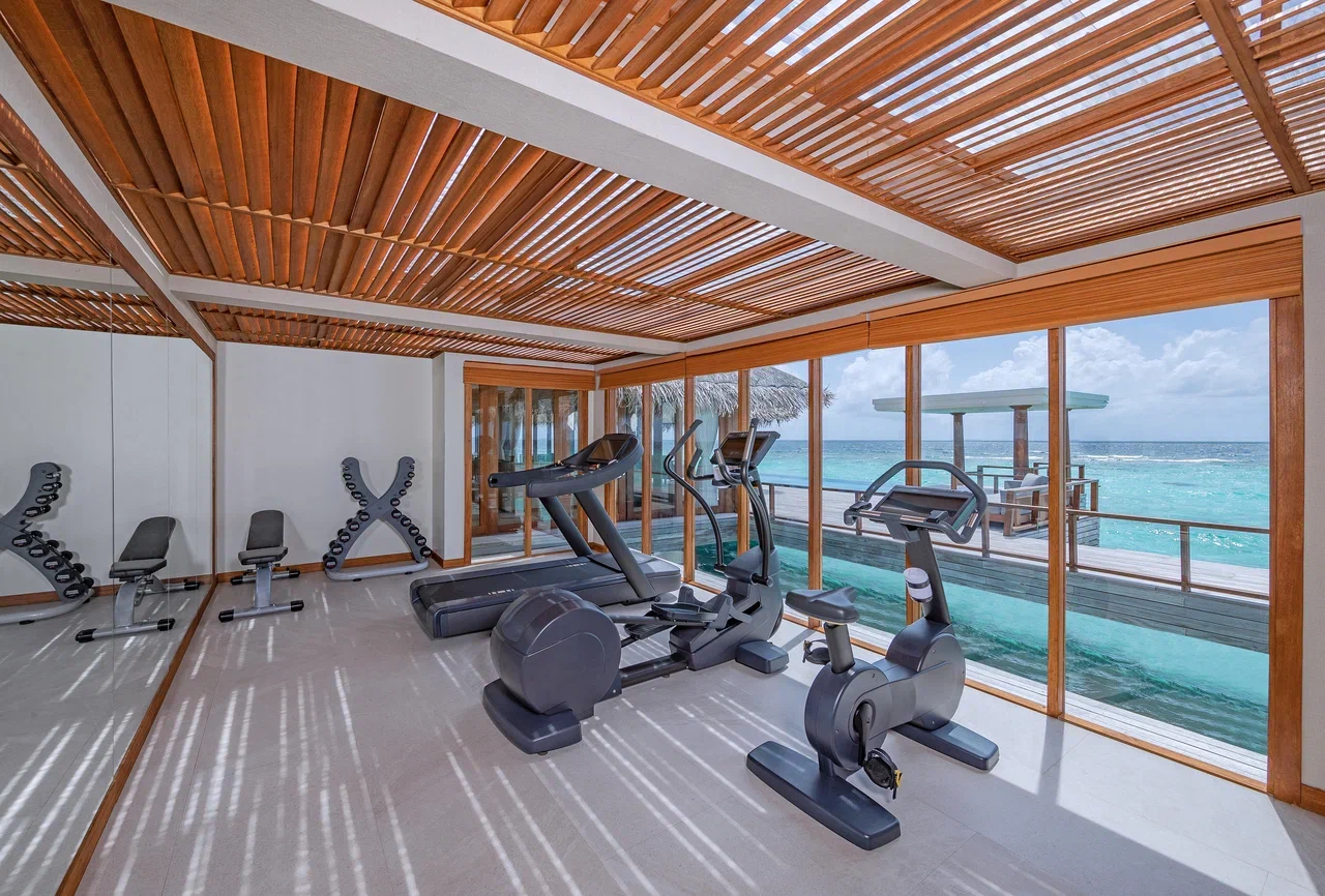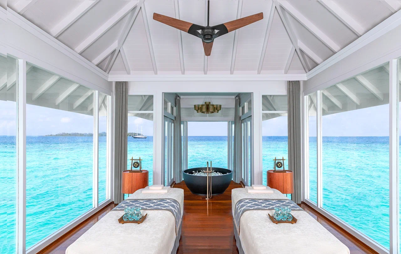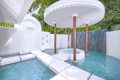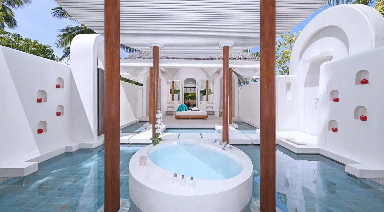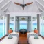 Вилла на воде. 2 спальни (одна – с кроватью king-size, другая – с кроватями twin), гостиная с обеденной зоной, кухня, 2 гардеробные, 2 ванные комнаты (каждая с душевой кабиной и ванной и душем на открытом воздухе), гостевой туалет, тренажёрный зал, комната для спа-процедур, терраса с бассейном, беседкой и прямым спуском к воде. Гостиная и спальни разделены дверями.