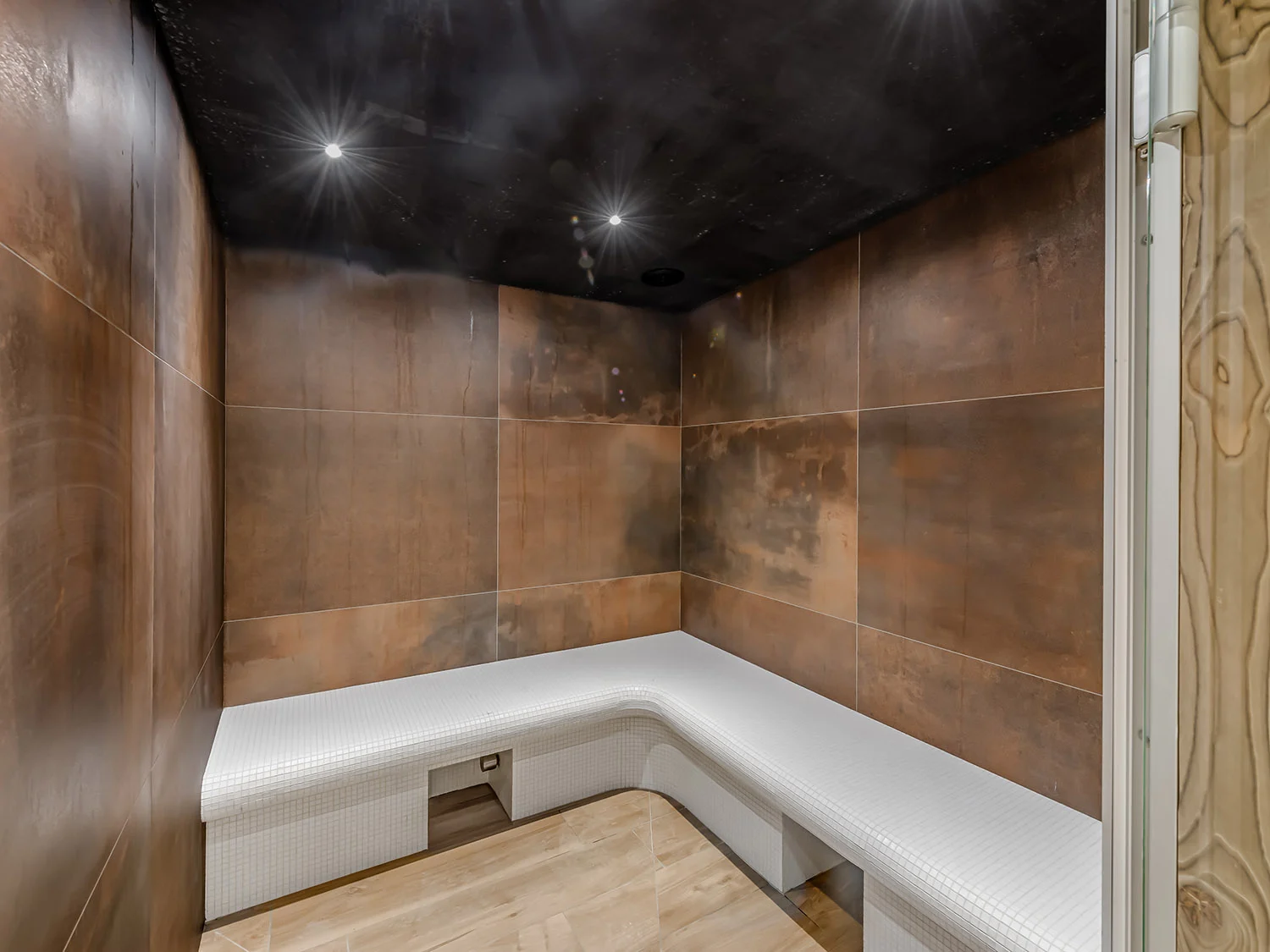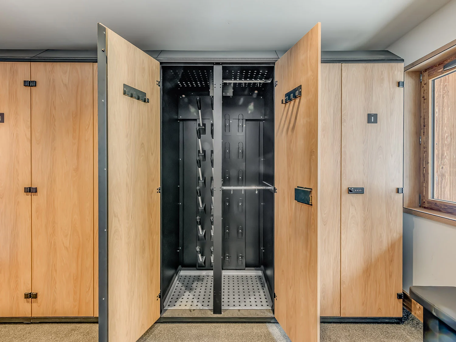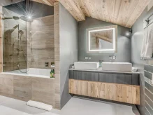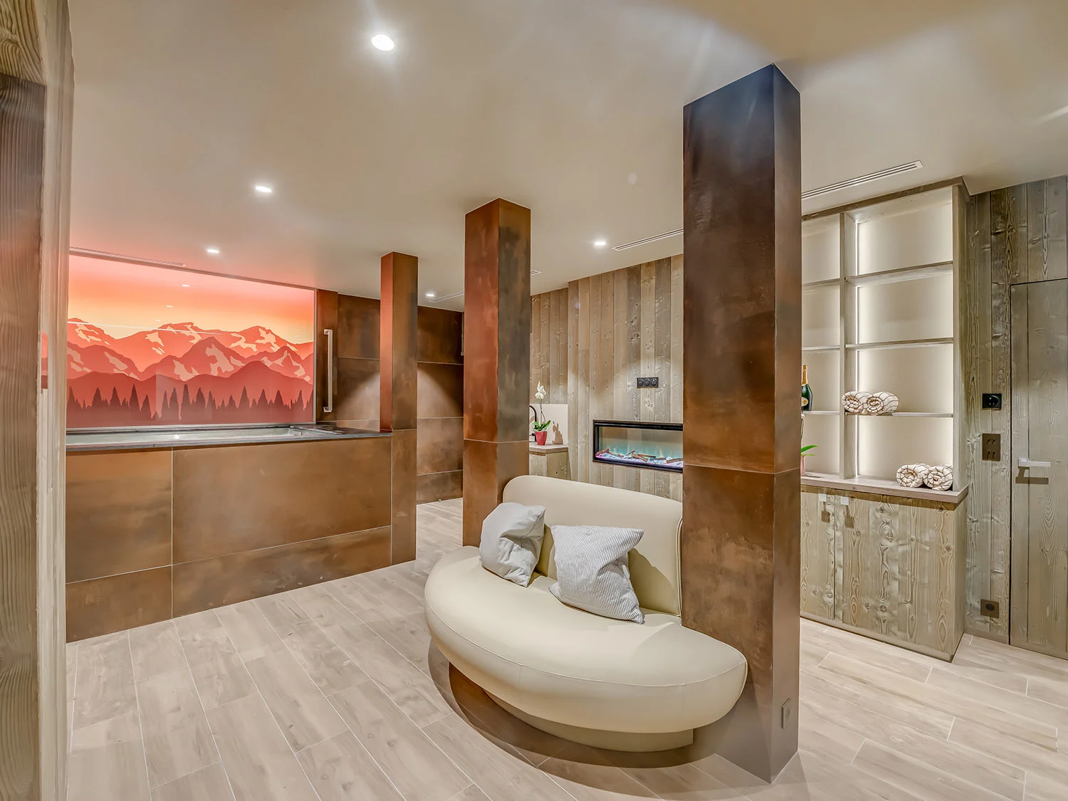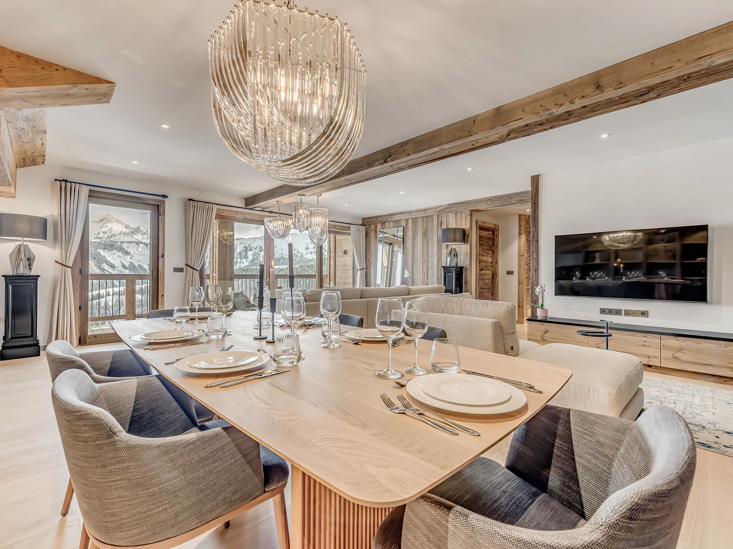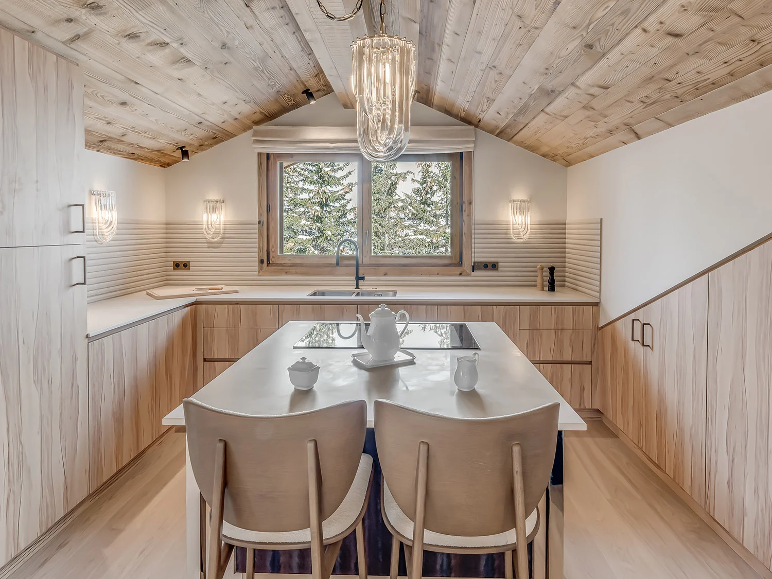 Это трёхэтажный пентхаус с просторной кухней-гостиной открытой планировки с камином и тремя спальнями, каждая с собственной ванной комнатой. Интерьеры выполнены в современном альпийском стиле, с использованием натуральных материалов – дерева и камня, стекла и металла. Из больших панорамных окон открываются захватывающие виды на горные склоны.
