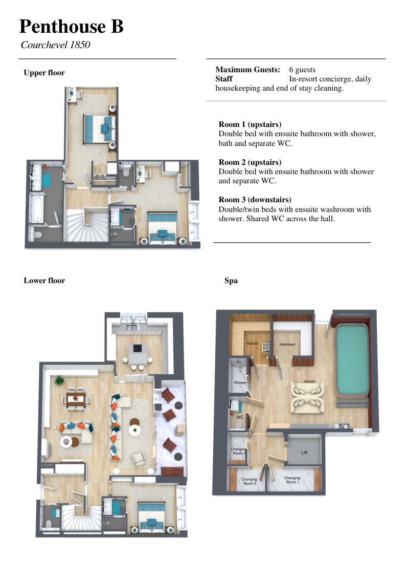 Трёхэтажный пентхаус, расположен в Куршевеле 1850. 3 спальни (две – с кроватями king-size, одна – с кроватью king-size или кроватями twin), гостиная с обеденной зоной, кухня, 3 ванные комнаты. Гостиная и спальни разделены дверями.