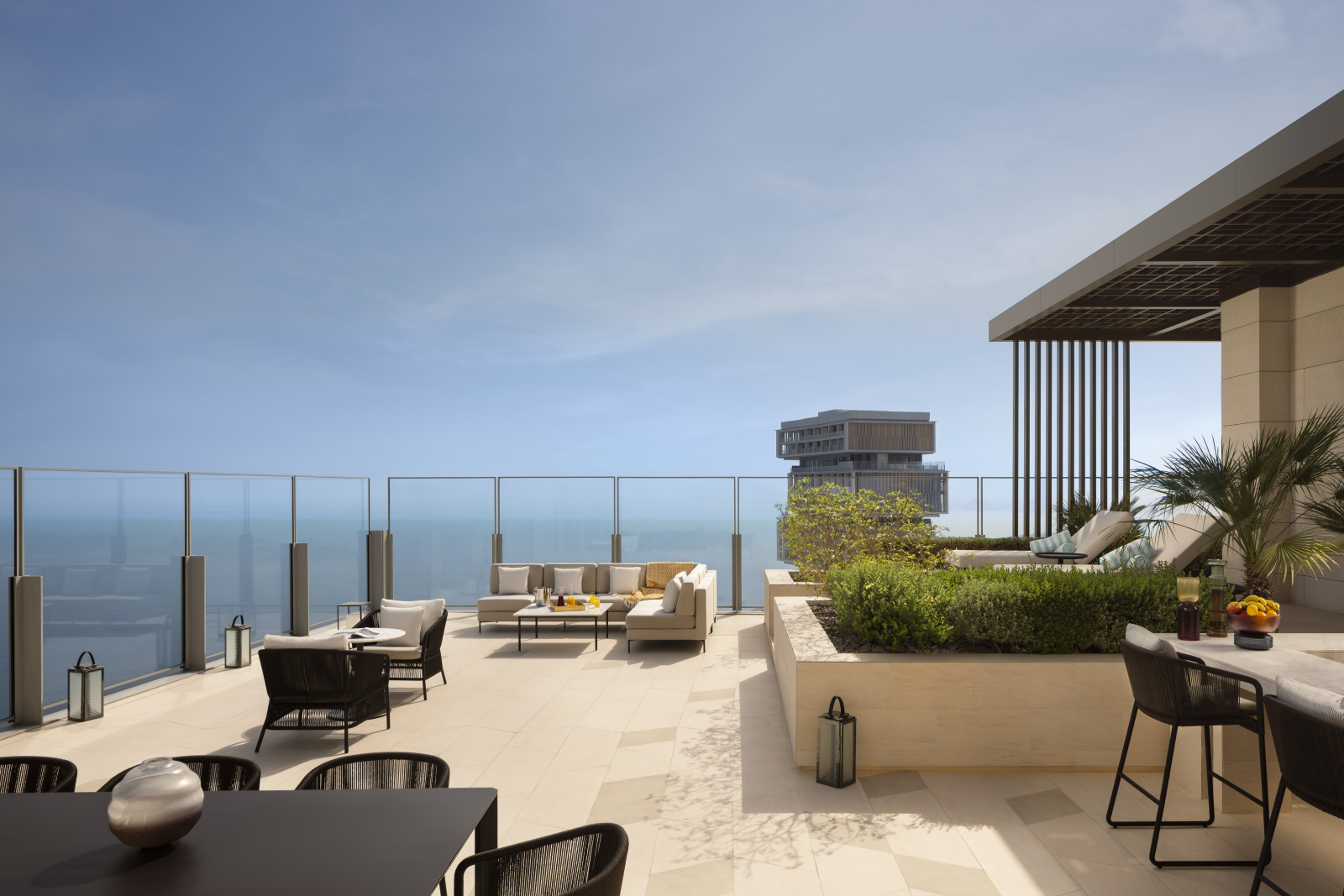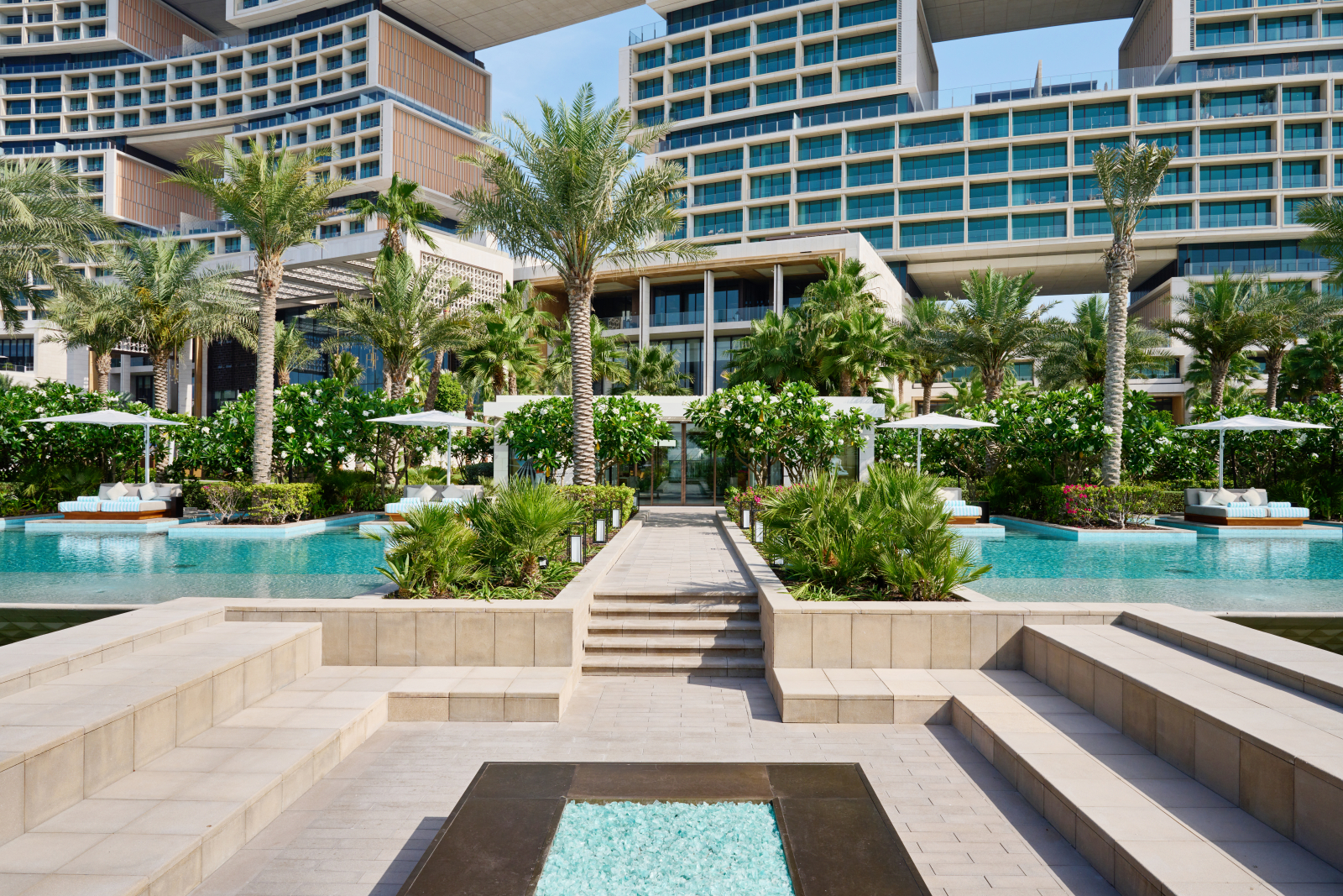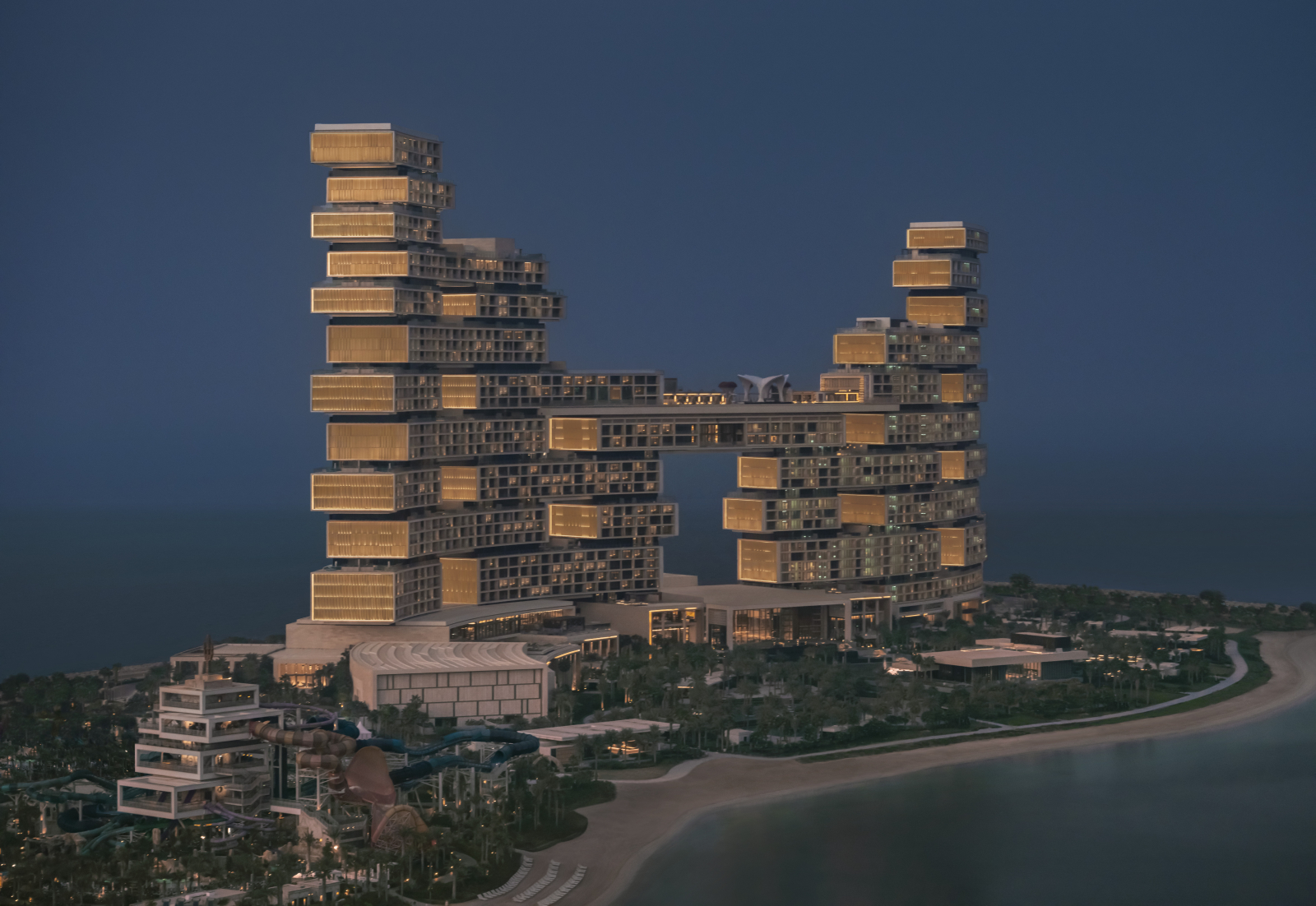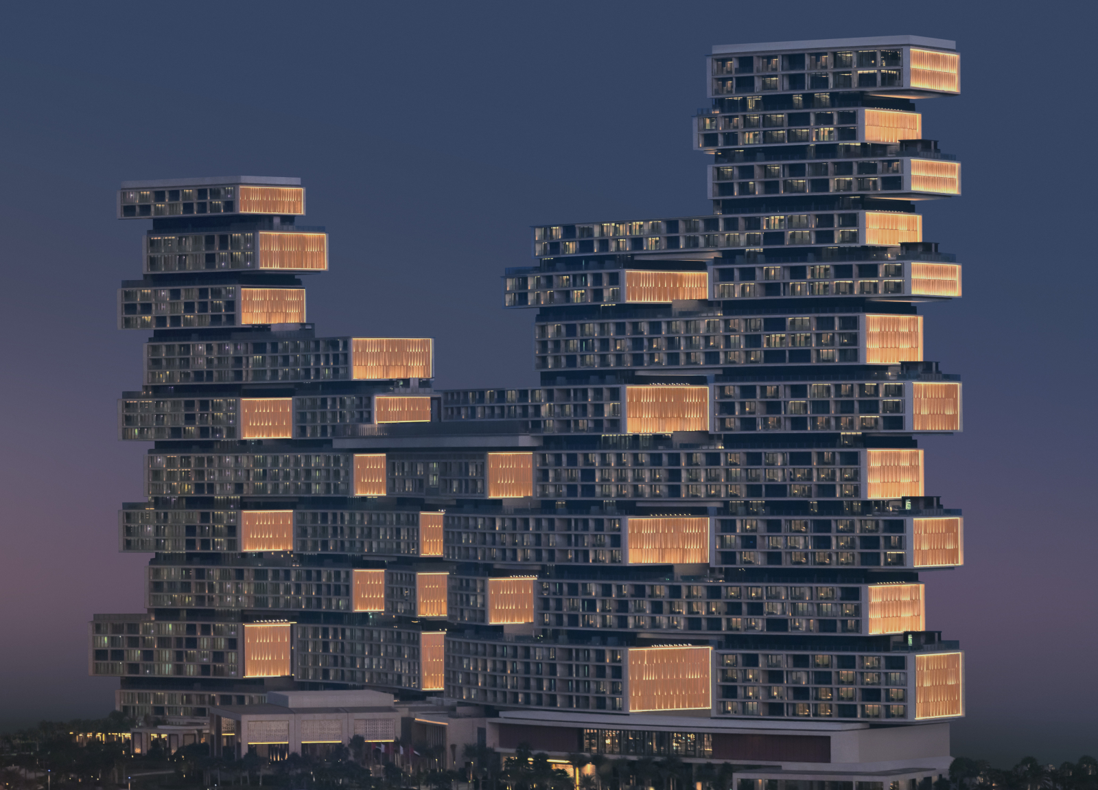 Входящий в международную сеть Atlantis Resorts гостиничной группы Kerzner International Atlantis The Royal является воплощением смелого архитектурного замысла. Комплекс, разработанный нью-йоркским бюро Kohn Pedersen Fox, представляет собой монументальное сооружение длиной 500 м и высотой 178 м, чья динамичная композиция из смещённых объёмов вызывает ассоциации с игрой «Тетрис». Уникальные «небесные» проёмы между корпусами трансформированы в многоуровневые террасы с висячими садами, водными каскадами и приватными бассейнами. Общественные пространства превращены в галереи современного искусства с впечатляющими инсталляциями от именитых дизайнеров.