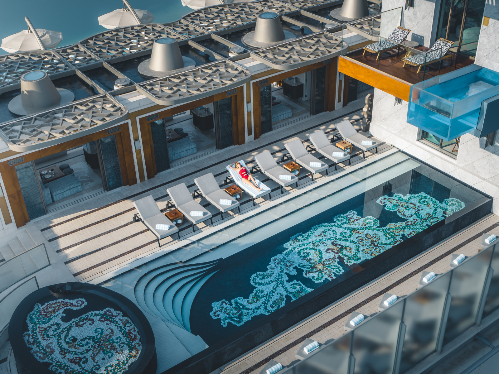 760 номеров, 10 ресторанов, 3 бара, кондитерская, частный песчаный пляж, пляжный клуб, открытый бассейн, инфинити-бассейн на крыше с панорамным видом на Персидский залив, спа-центр, клиника эстетической медицины Aeon Clinic, тренажёрный зал, центр водных видов спорта, аквапарк, океанариум, теннисный корт, детский клуб, бутики, экскурсионное бюро, бизнес-центр, конференц-залы, вертолётная площадка, бесплатная частная парковка.