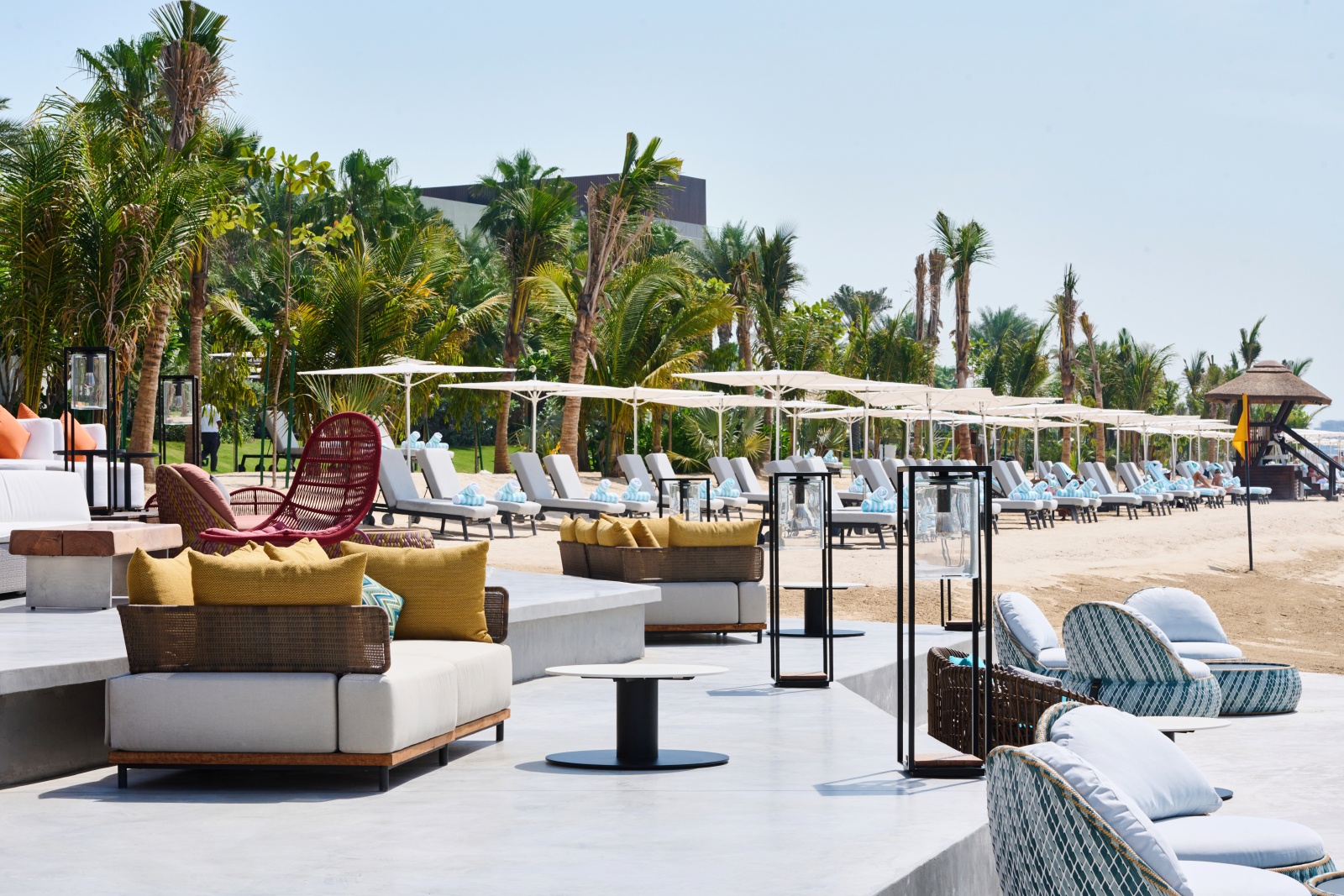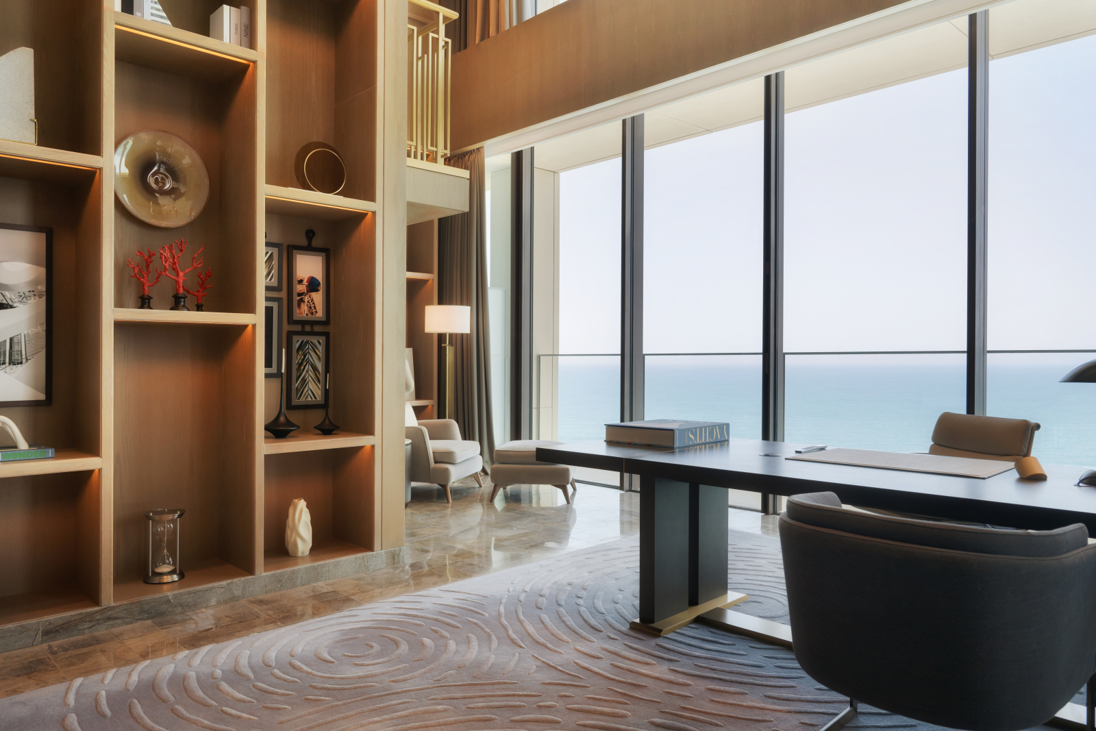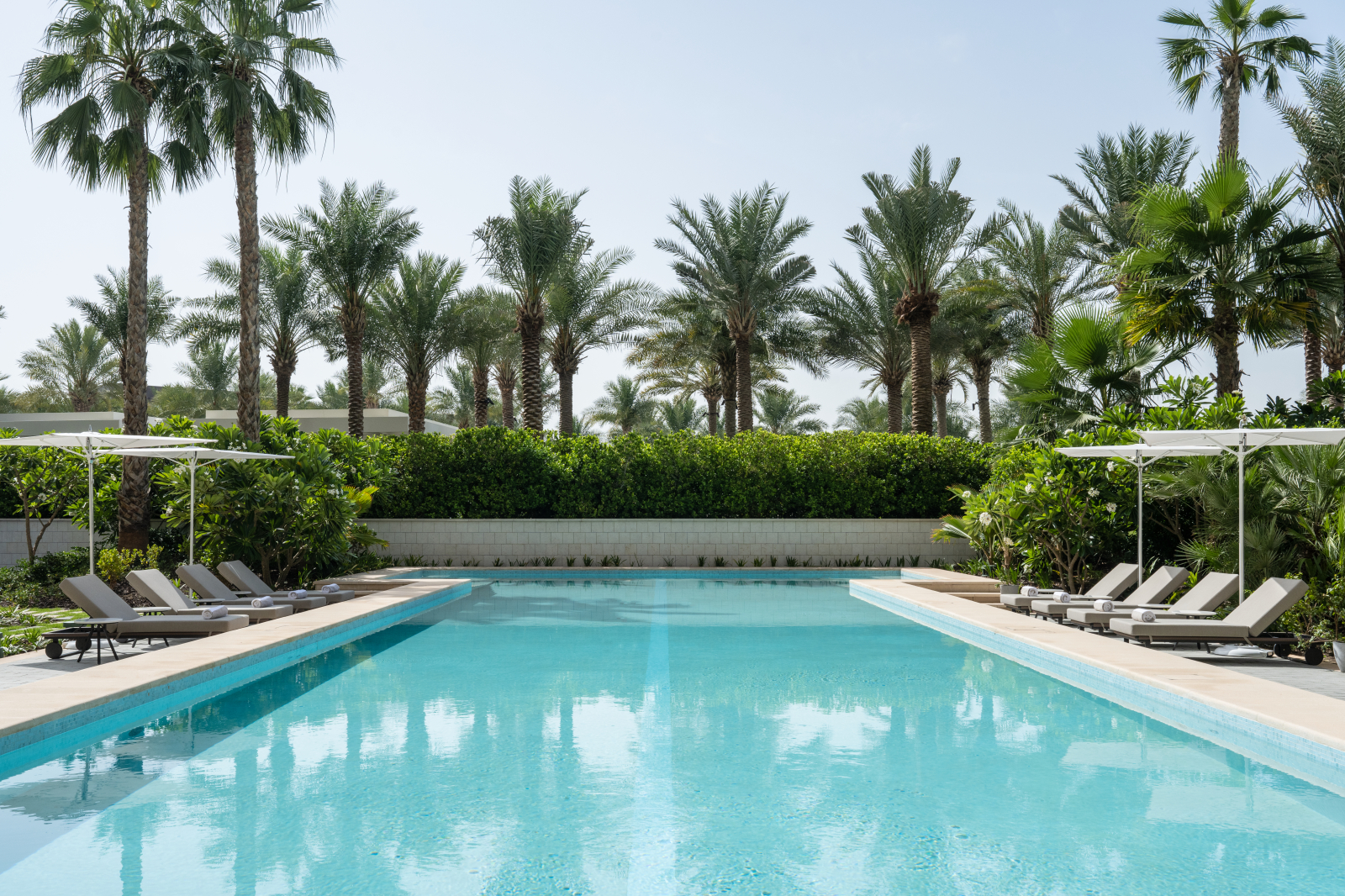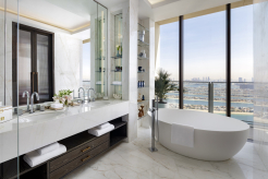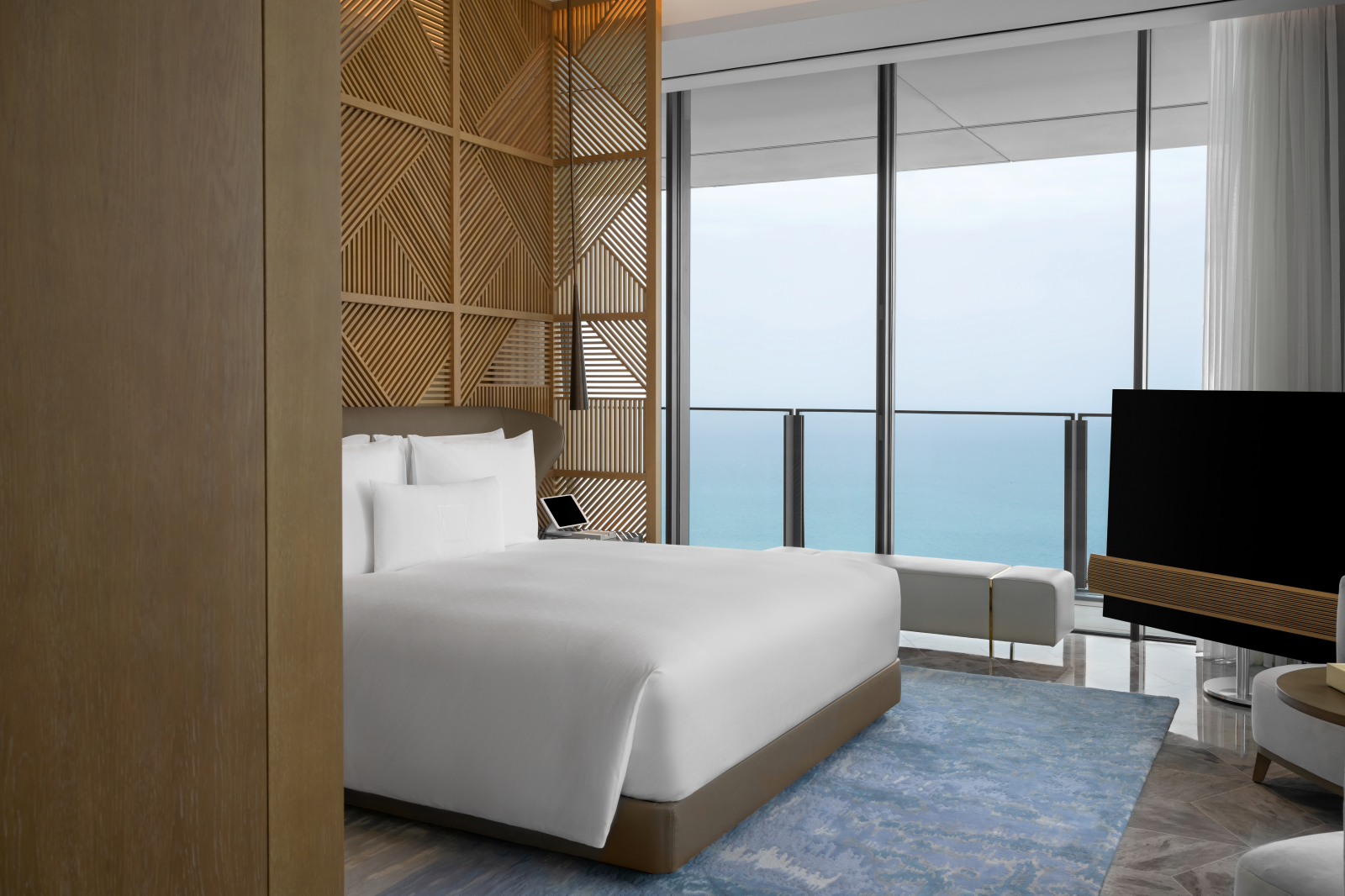 Номера и люксы выдержаны в палитре прибрежного ландшафта – от цвета песка до лазури Персидского залива. Каждый содержит в себе детали высочайшего качества: парфюмерные средства Hermès и Acqua di Parma, элитный текстиль Frette и Graff, персонализированное меню подушек и ортопедические матрасы ручной работы Hypnos. Круглосуточное персональное обслуживание обеспечивает профессиональный штат батлеров.