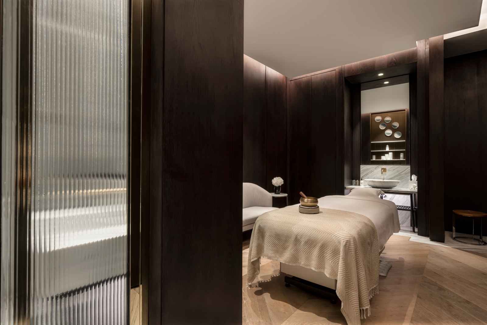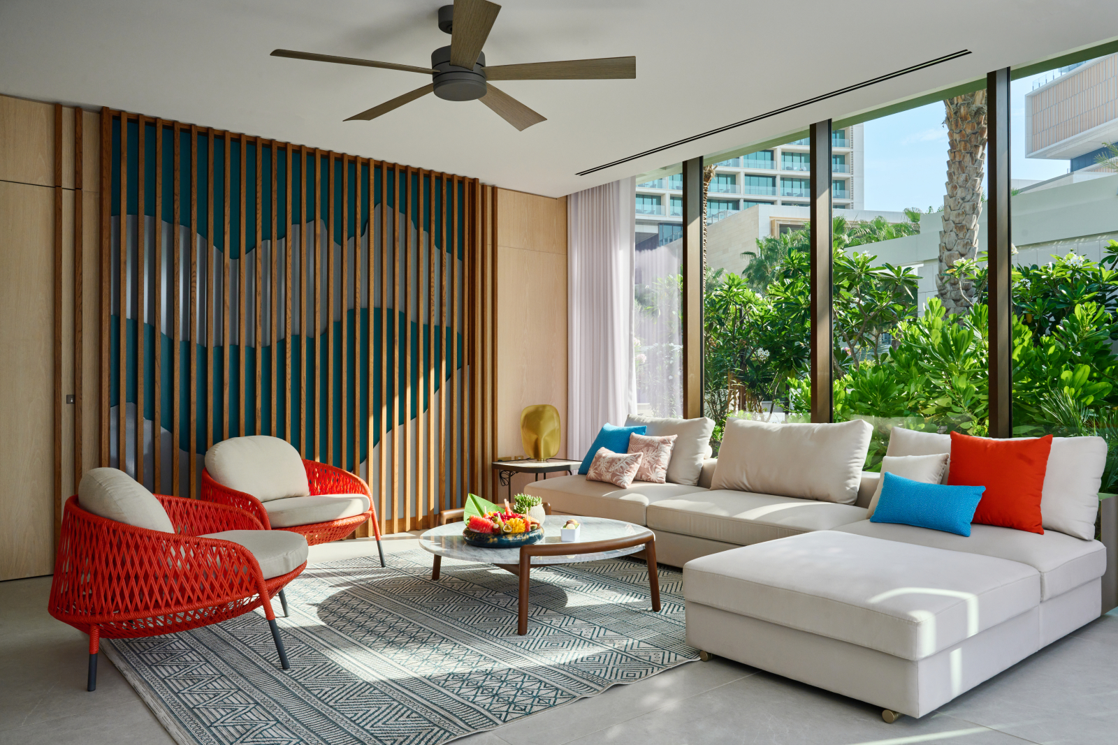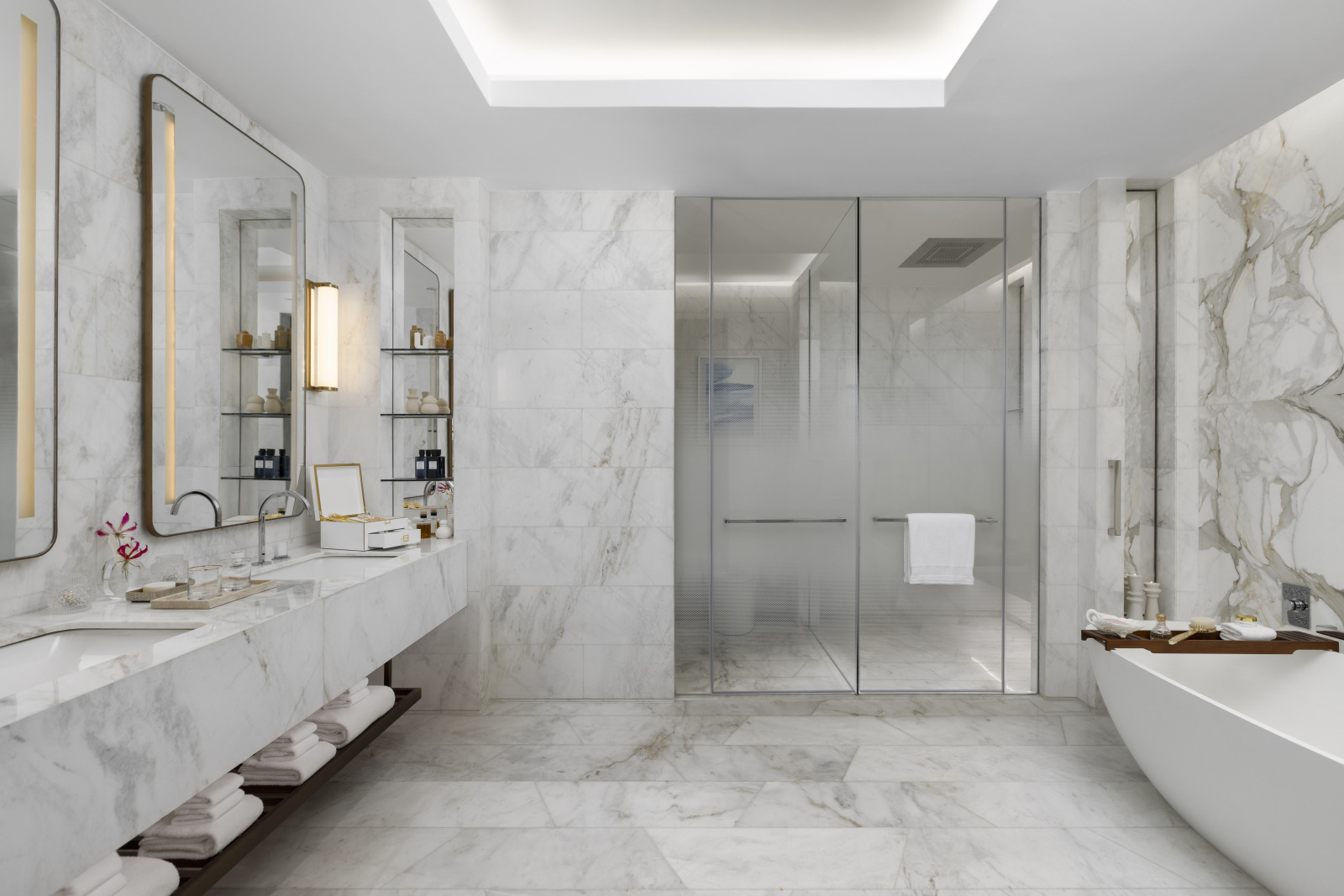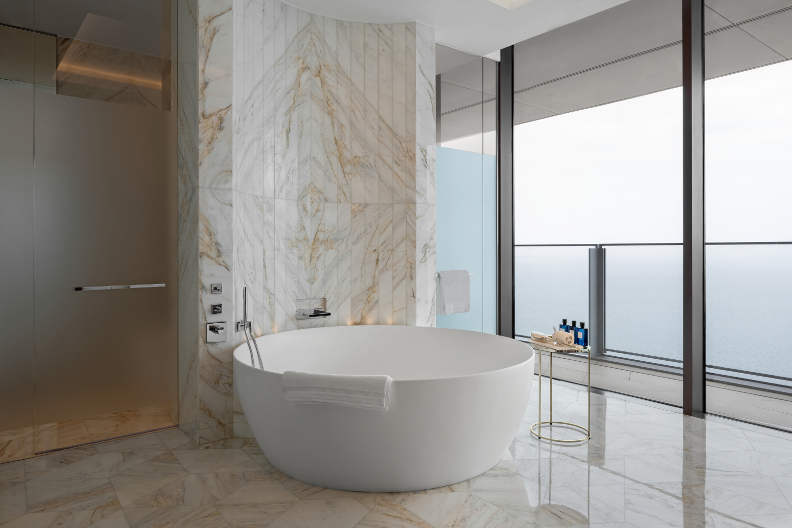 Номера и люксы выдержаны в палитре прибрежного ландшафта – от цвета песка до лазури Персидского залива. Каждый содержит в себе детали высочайшего качества: парфюмерные средства Hermès и Acqua di Parma, элитный текстиль Frette и Graff, персонализированное меню подушек и ортопедические матрасы ручной работы Hypnos. Круглосуточное персональное обслуживание обеспечивает профессиональный штат батлеров.