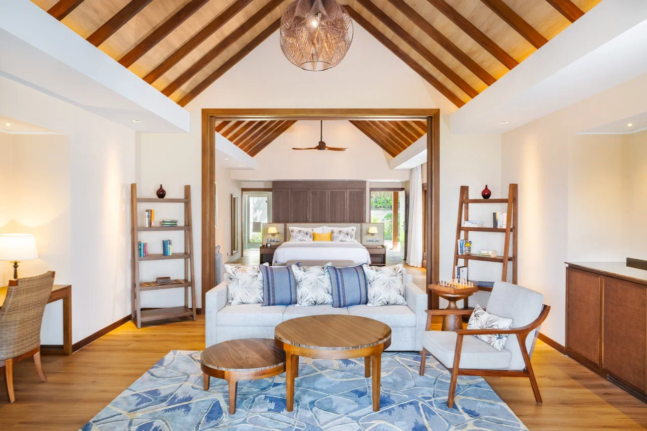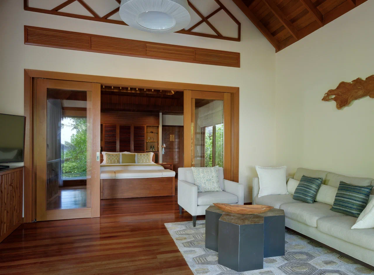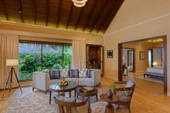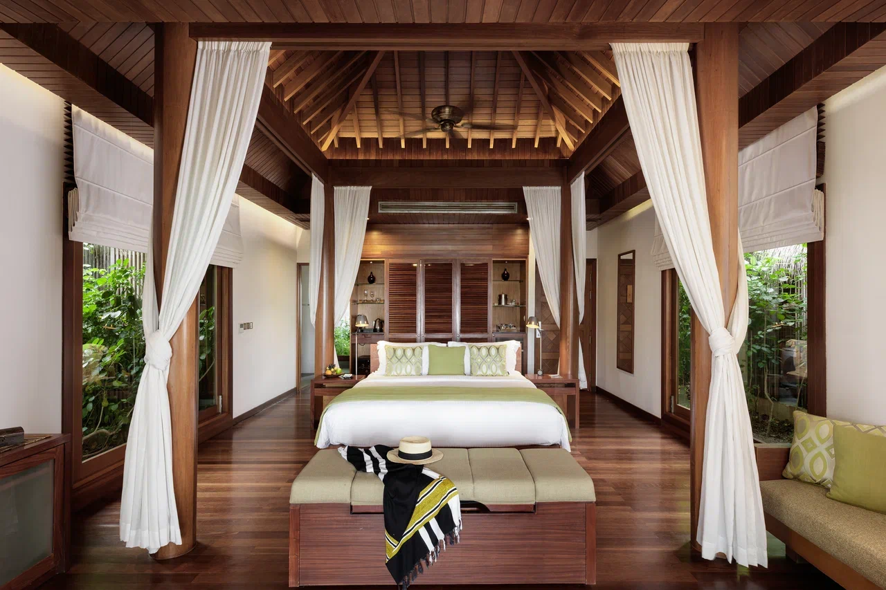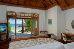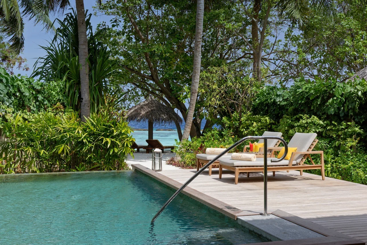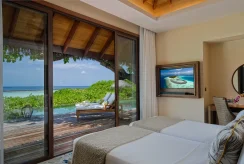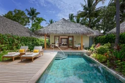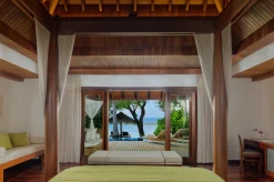 Вилла на берегу. 2 спальни (одна – с кроватью king-size, другая – с кроватями twin), 2 ванные комнаты (каждая с ванной и душевой кабиной), душ на открытом воздухе, терраса с обеденной зоной на открытом воздухе, качелями и бассейном. Гостиная и спальни разделены дверями.