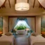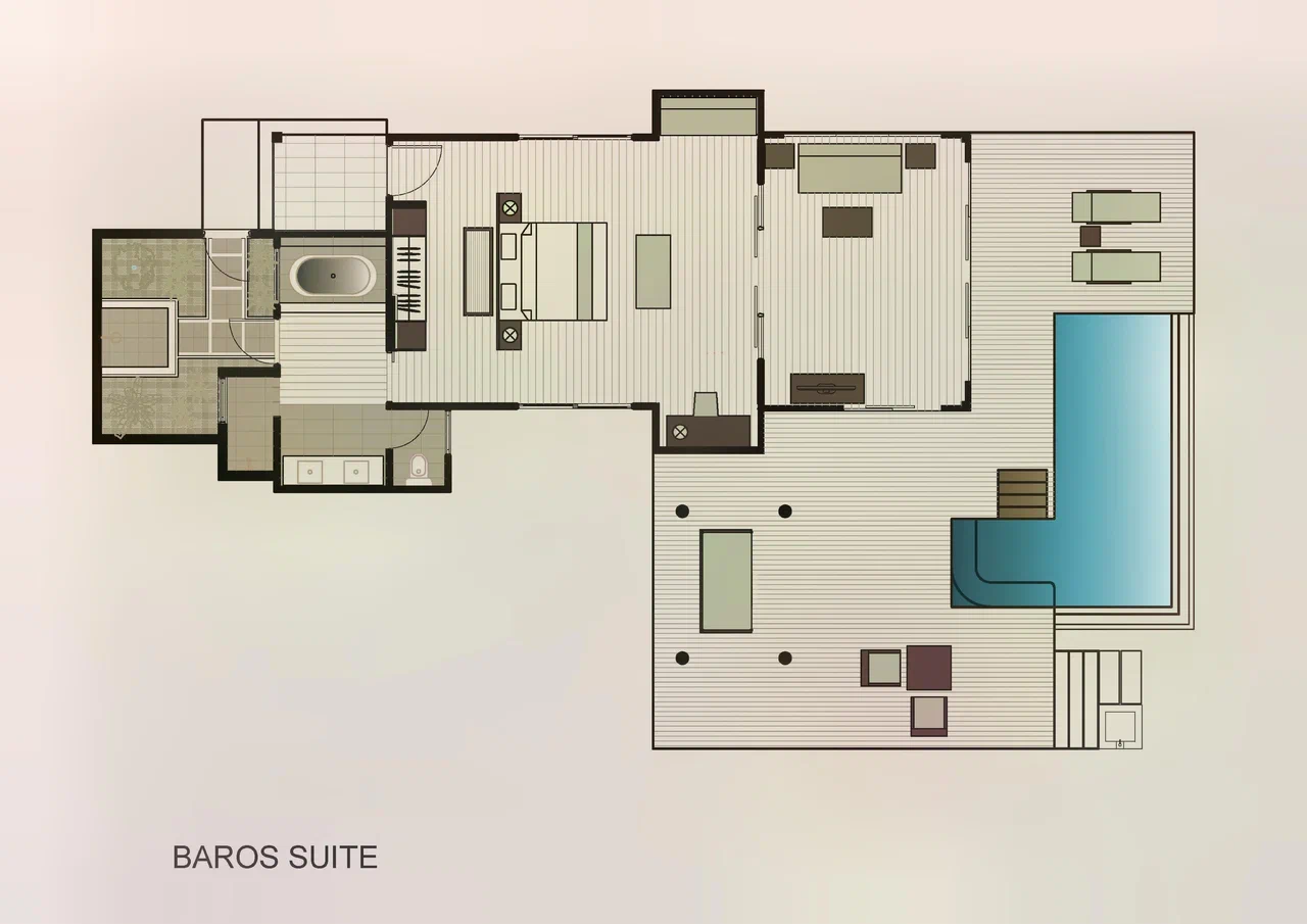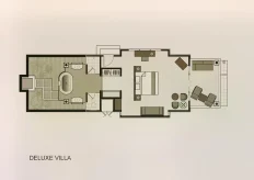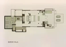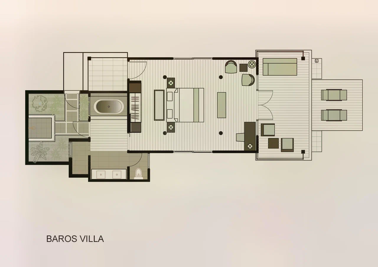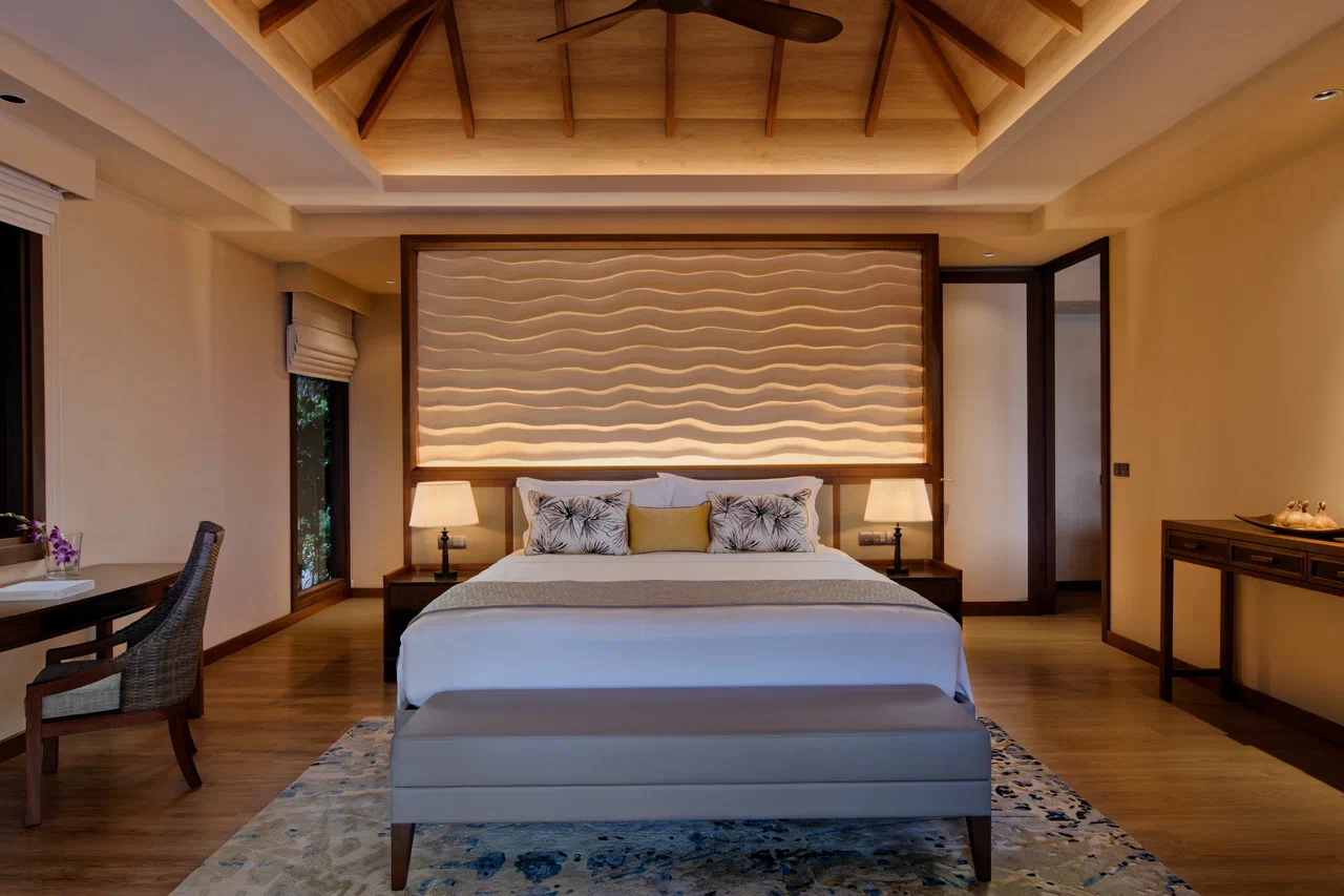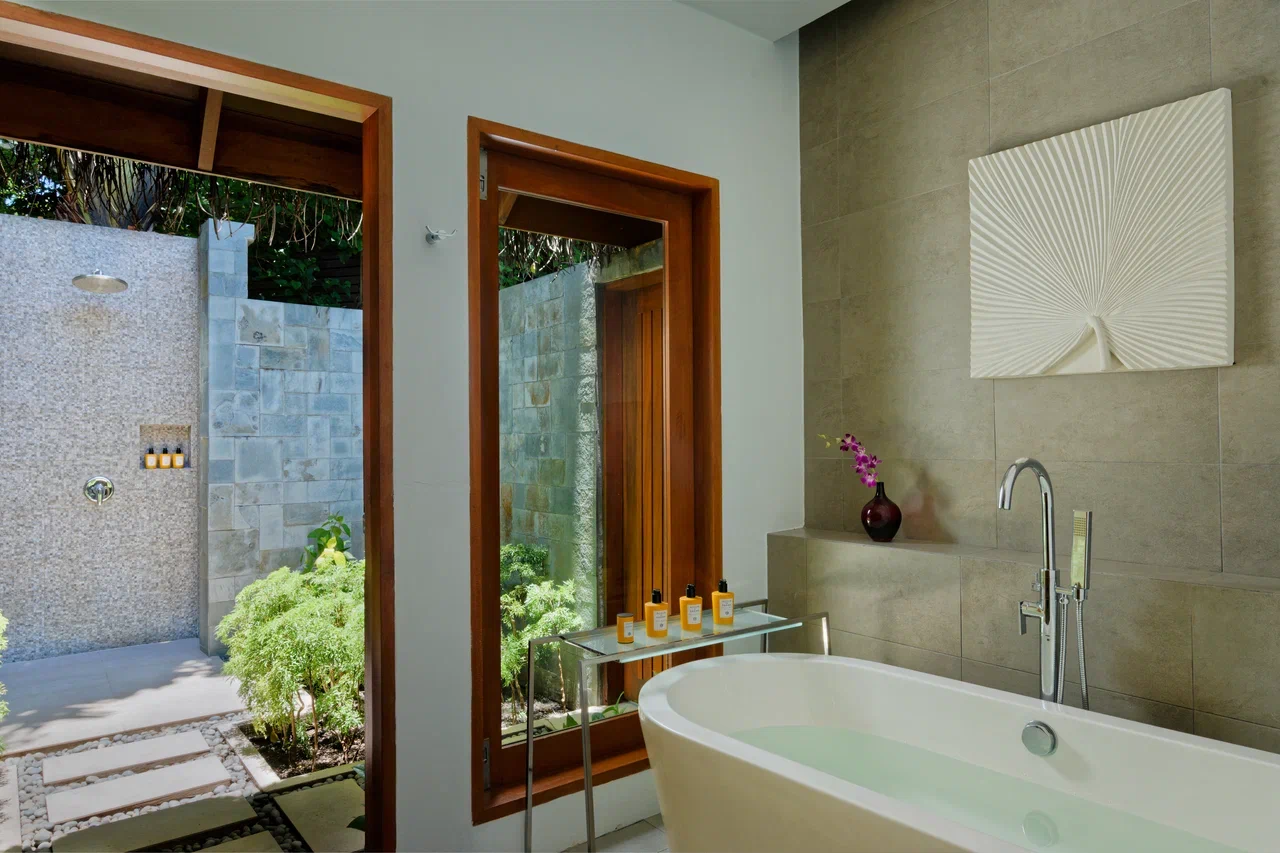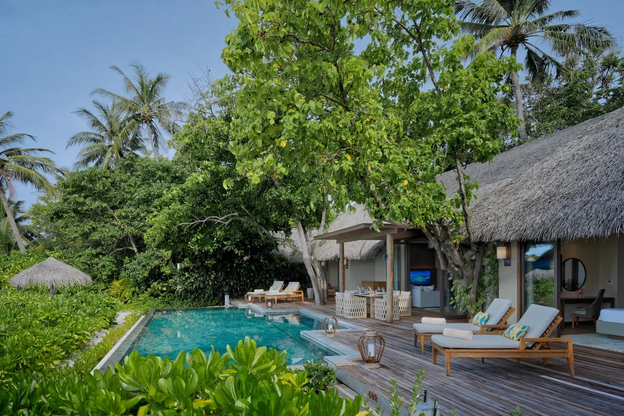 Вилла на берегу. 2 спальни (одна – с кроватью king-size, другая – с кроватями twin), 2 ванные комнаты (каждая с ванной и душевой кабиной), душ на открытом воздухе, терраса с обеденной зоной на открытом воздухе, качелями и бассейном. Гостиная и спальни разделены дверями.