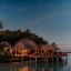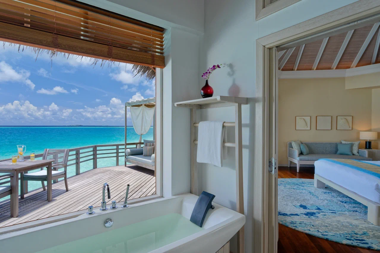 Вилла на воде. Спальня с кроватью king-size, гостиная зона, ванная комната с ванной, терраса с обеденной зоной на открытом воздухе, прямой спуск к воде.