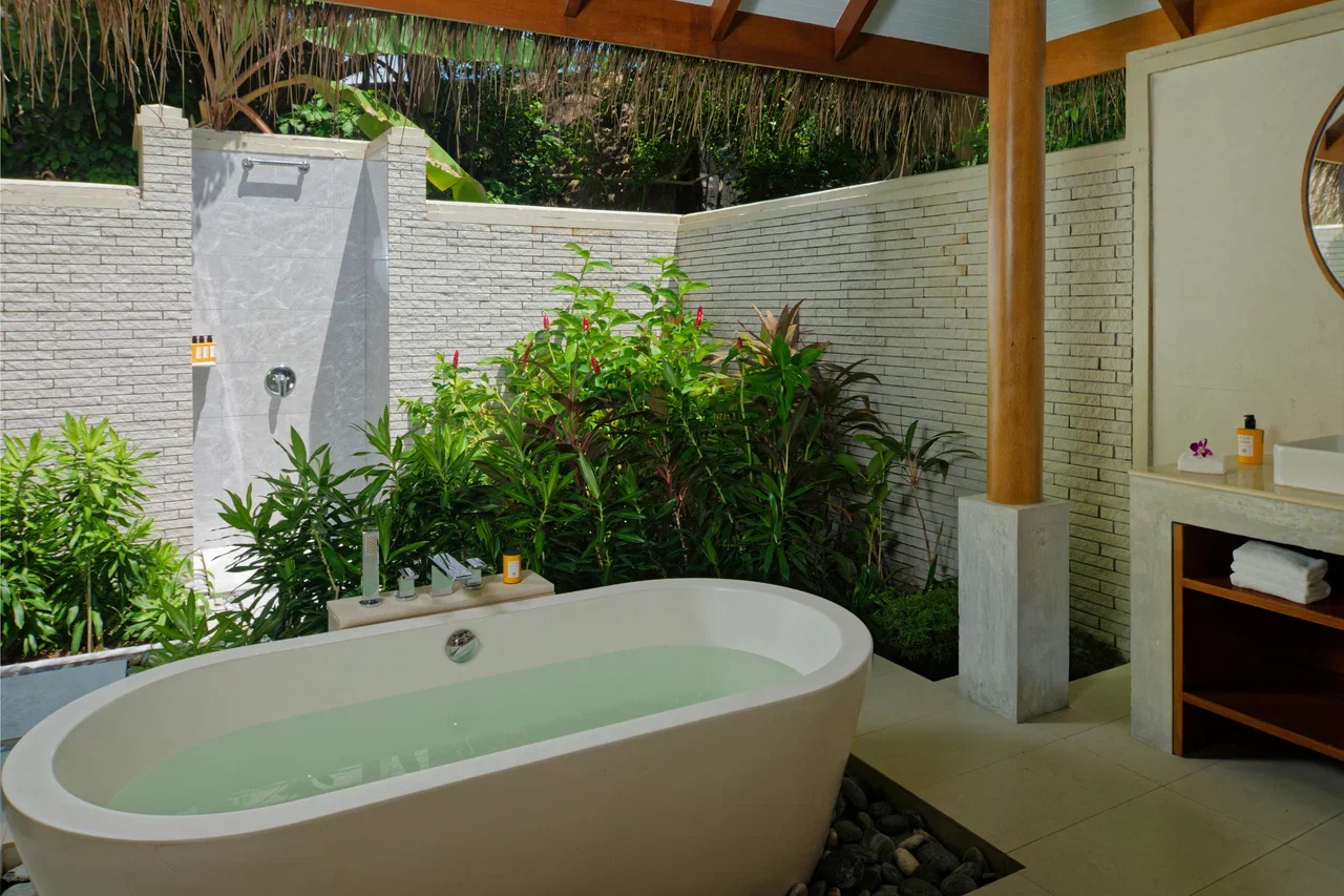 Вилла на берегу. Спальня с кроватью king-size, гостиная зона, ванная комната с ванной и душевой кабиной, душ на открытом воздухе, терраса с бассейном.