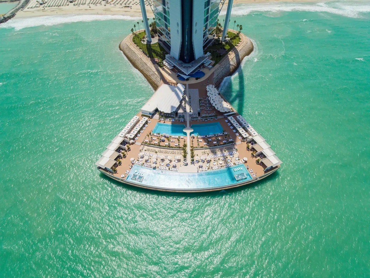 Отель стоит на отдельном острове, соединённом мостиком с основной территорией «экосистемы» Jumeirah, куда входят комплекс Madinat, виллы Malakiya, виллы Beit Al Bahar, Jumeirah Beach Hotel, множество бассейнов, кафе и ресторанов, восточный базар Souk Madinat, водный парк развлечений Wild Wadi. На расположенной над водой террасе отеля площадью 10 тыс. кв. м размещены два инфинити-бассейна, ресторан SAL, пляж с пляжными домиками и шезлонгами. Ресторан французской и итальянской кухни Al Muntaha на 27-м этаже небоскрёба удостоен звезды Michelin. Меню ресторана L’Olivo разработано обладателем двух звёзд Michelin Андреа Мильяччо. В пляжном клубе Summersalt, где играют диджеи и можно арендовать частную беседку, работает ресторан латиноамериканской кухни, а коктейли готовят эксперты миксологии. Из роскошного спа-центра Talise Spa на 18-м этаже отеля открывается вид на море; в HWH Studio занятия йогой проводит известный инструктор Эдриэнн Эверетт.