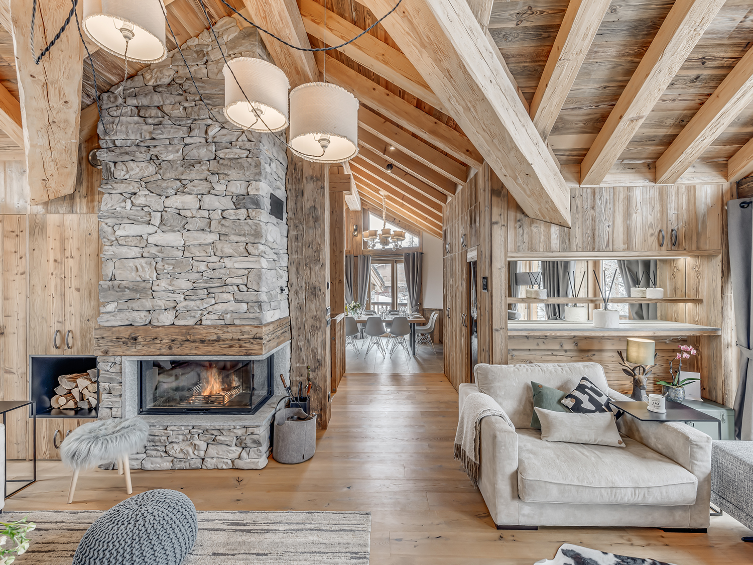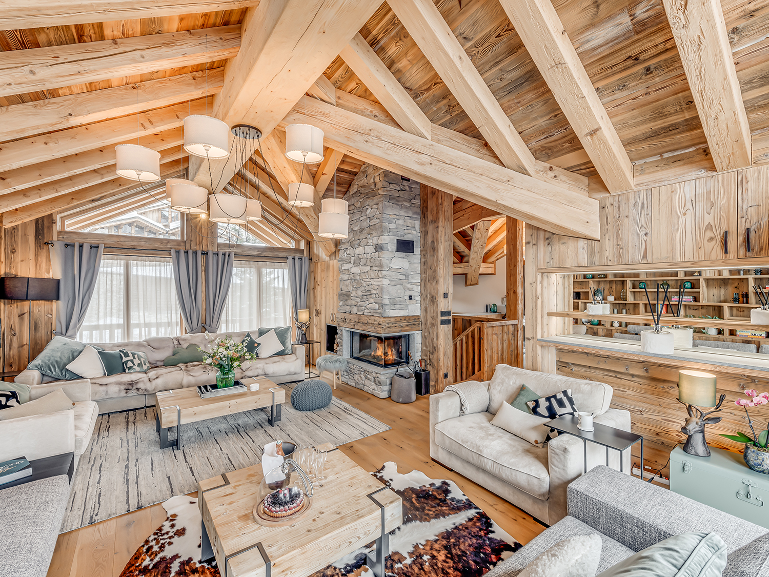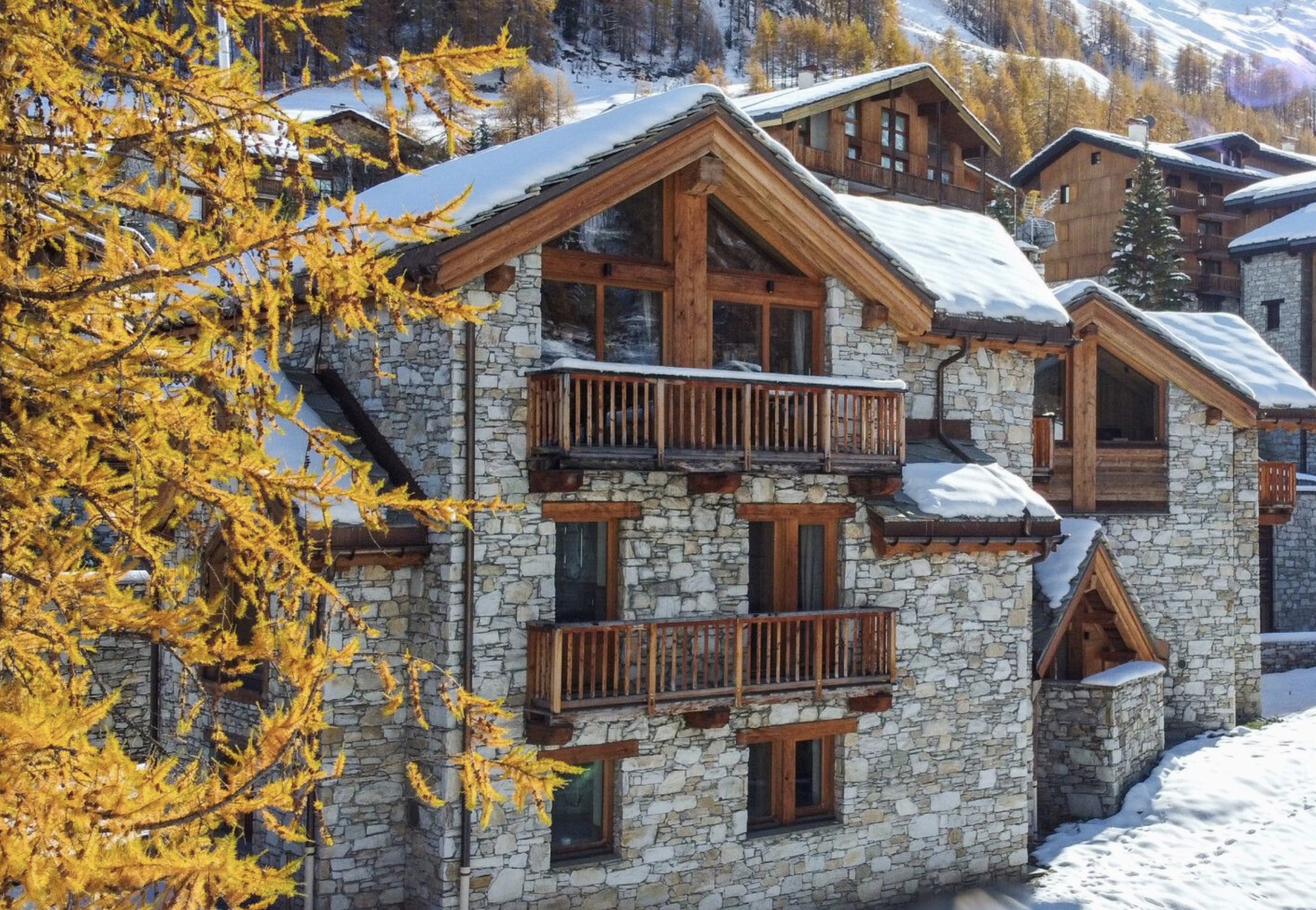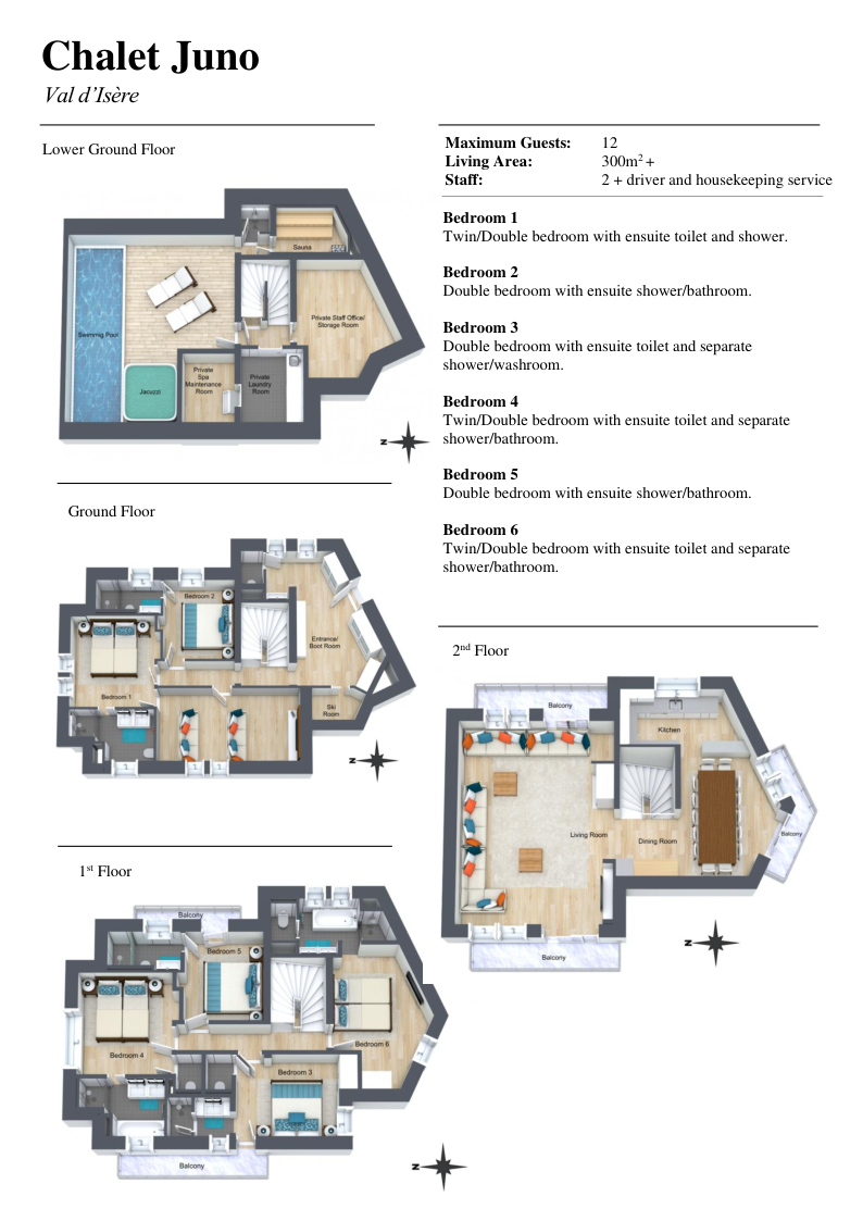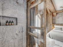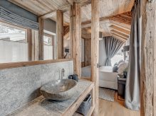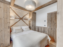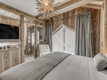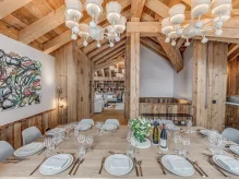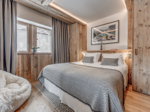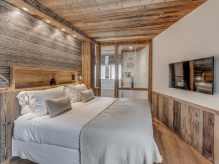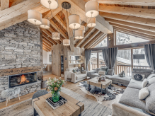 Четырёхэтажное шале. 6 спален (три – с кроватями king-size, три – с кроватями king-size или twin), гостиная с камином и обеденной зоной, кухня, 6 ванных комнат, 4 балкона. Гостиная и спальни разделены дверями. Прямой выход на склоны.