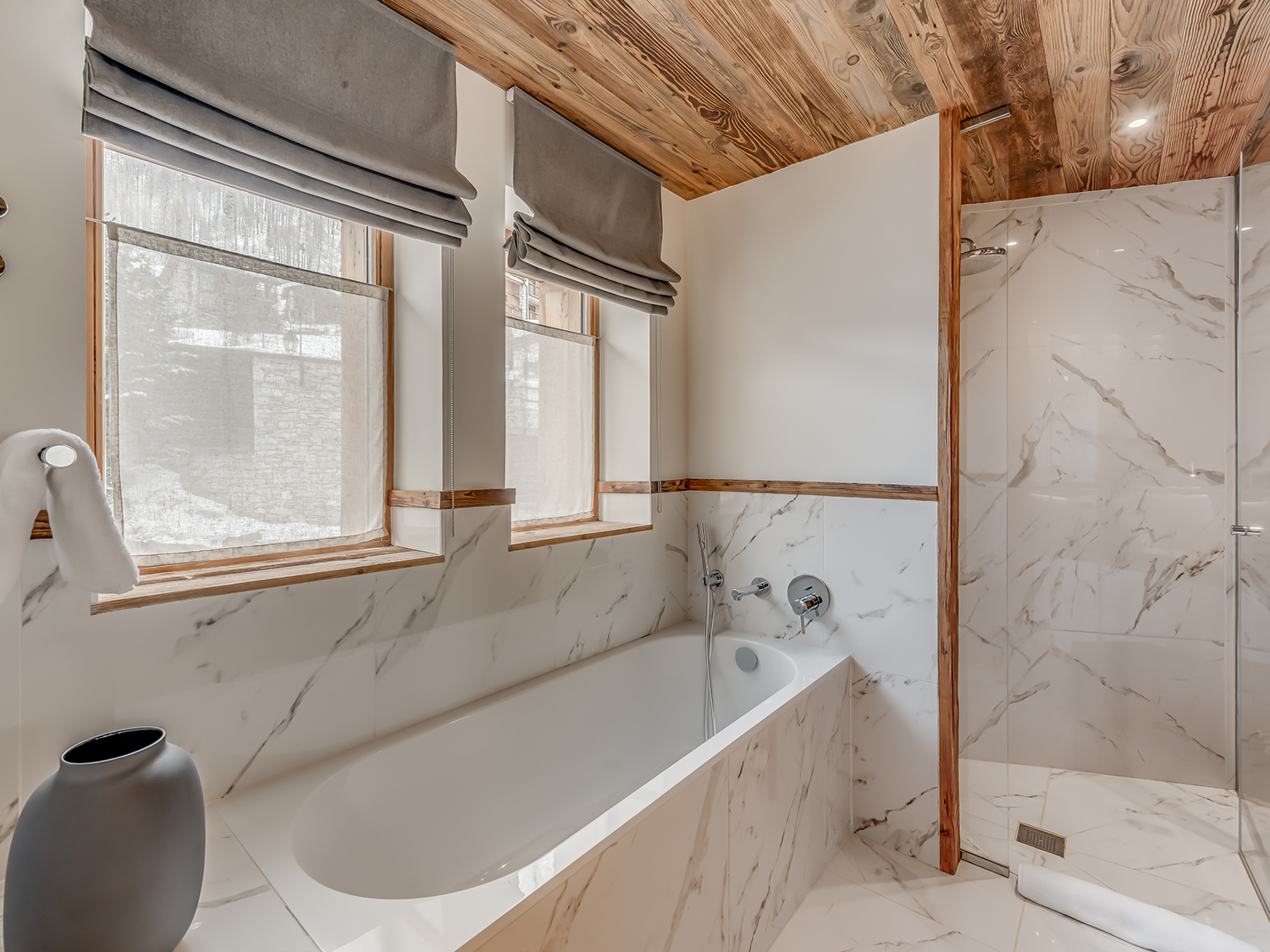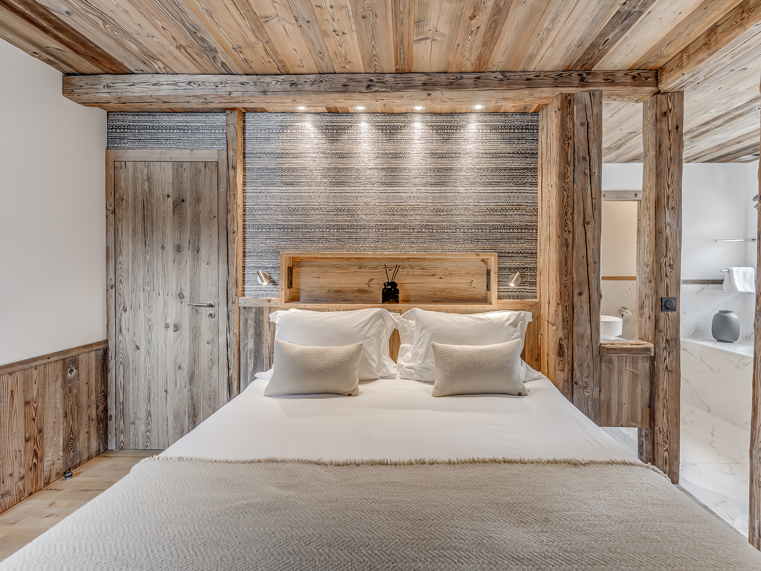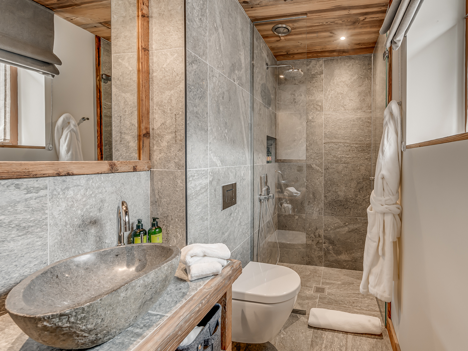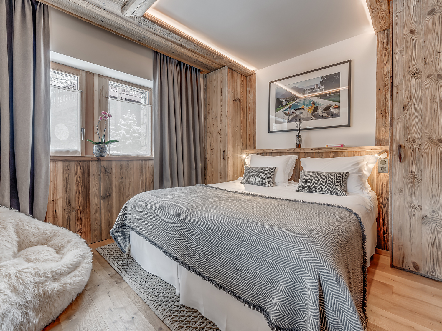 Четырёхэтажное шале. 6 спален (три – с кроватями king-size, три – с кроватями king-size или twin), гостиная с камином и обеденной зоной, кухня, 6 ванных комнат, 4 балкона. Гостиная и спальни разделены дверями. Прямой выход на склоны.