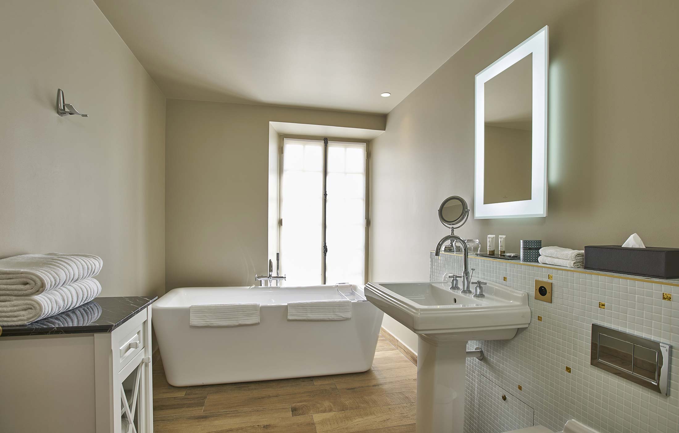 Спальня с кроватью king-size или кроватями twin, гостиная зона, ванная комната с ванной и душевой кабиной.