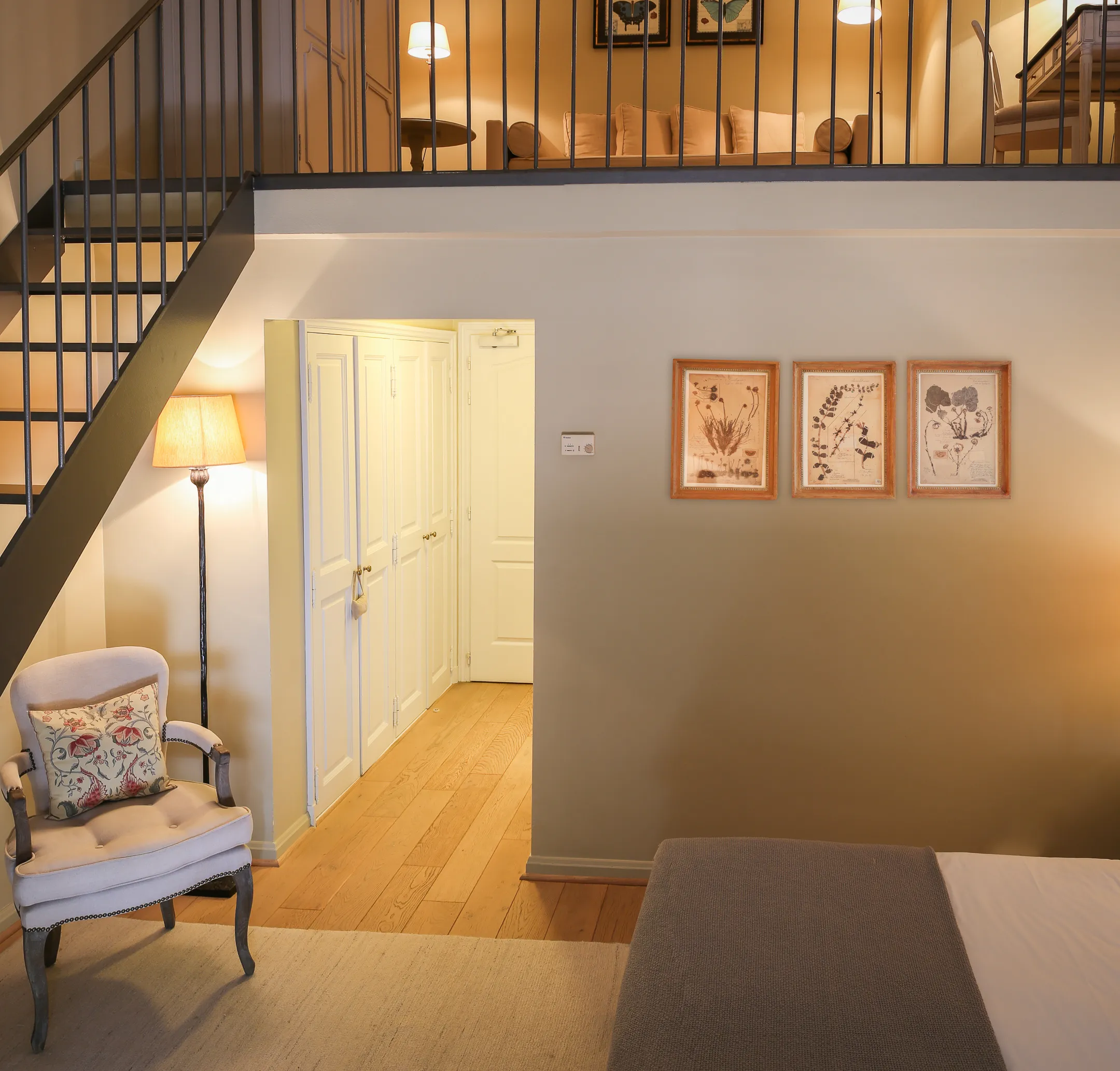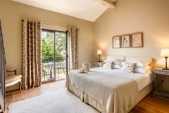 На 2-м этаже: 2 спальни с кроватями queen-size или twin, гардеробная, ванная комната с ванной и душевой кабиной, 2 балкона. Гостиная и спальни расположены на разных этажах и разделены дверями.