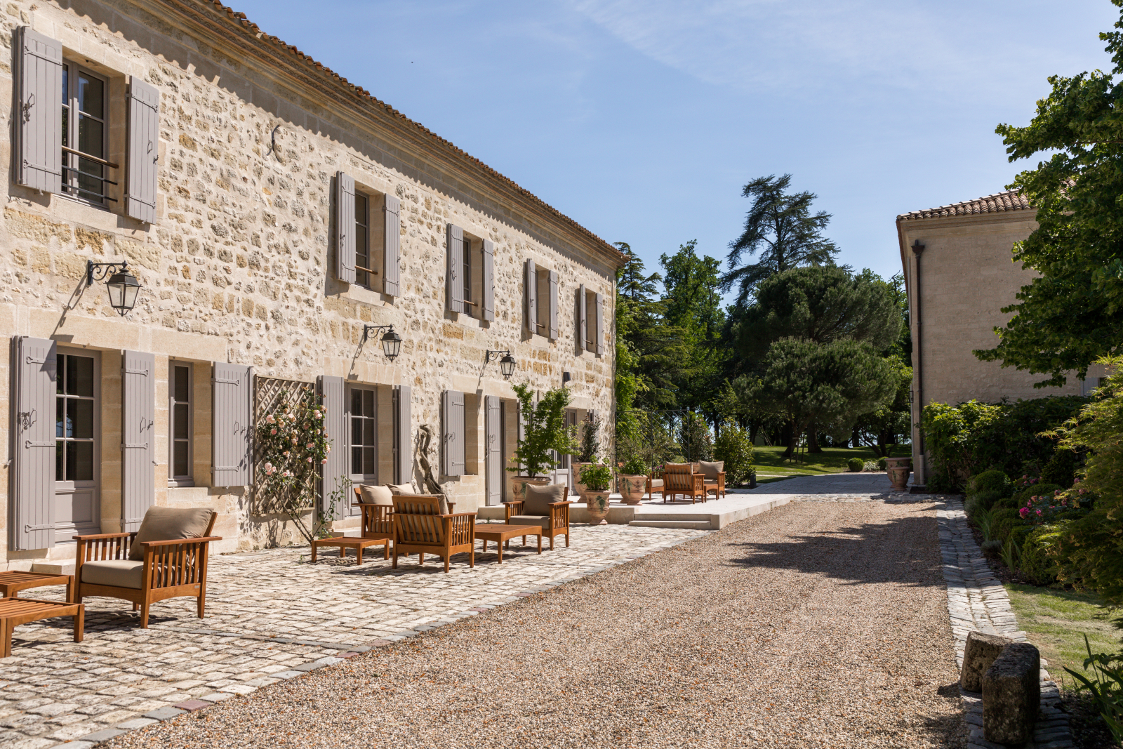 Отель входит в коллекцию Sur-Mesure, Hotels & Homes. Комплекс включает белокаменные постройки XVIII века. Гостям доступны четыре номера в доме Les Clefs (их можно арендовать по отдельности или вместе), отдельно стоящий дом La Maison des Vignes, а также эксклюзивная аренда всего шато площадью 500 кв. м с камином, открытым бассейном и персональным батлером. Интерьеры создают аутентичную атмосферу французского аристократического поместья с характерными чертами: пастельная палитра, деревянные стропила, коллекционная антикварная мебель, традиционный пёстрый текстиль и полы из терракотовой плитки.