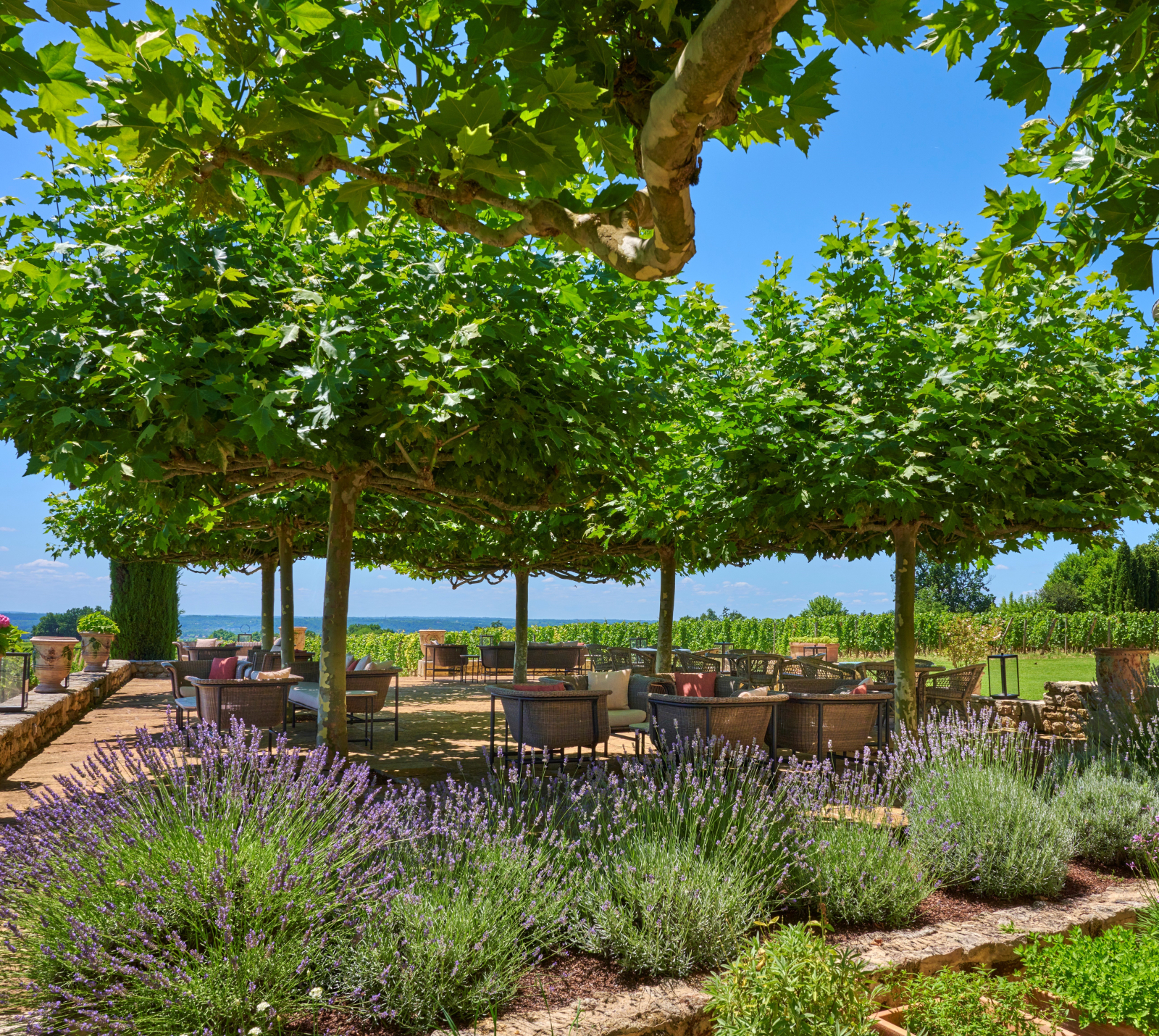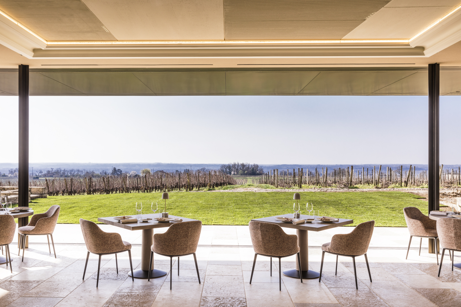 Шато окружают 43 га собственных виноградников. Для гостей организуют экскурсии и дегустации в различных форматах: от пеших прогулок и туров на ретроавтомобиле Land Rover до пикников и углублённого знакомства с процессом производства вина. Ресторан Les Belles Perdrix под руководством шеф-повара Давида Шарье, размещённый в здании, спроектированном архитектором Бруно Муанаром, удостоен красной звезды Michelin (за исключительную кухню) и зелёной звезды (за приверженность устойчивому развитию). Кулинарный опыт дополняет кондитерское искусство патиссье Адриена Салавера, представленное домашней выпечкой.