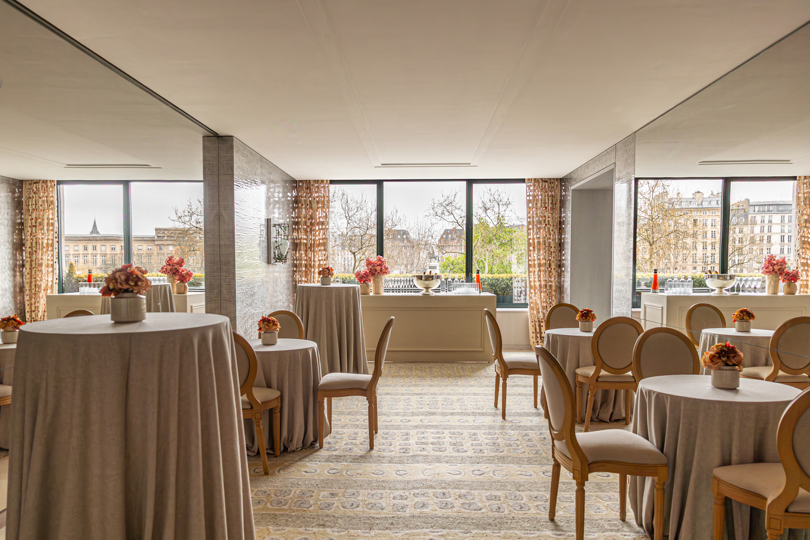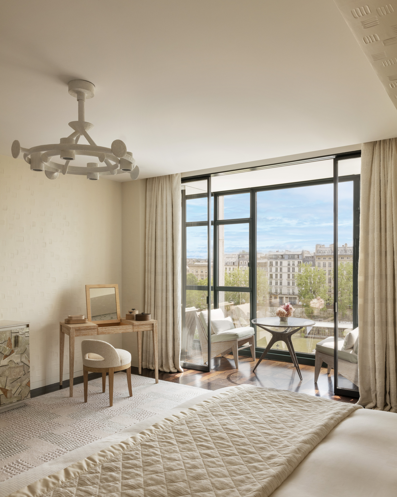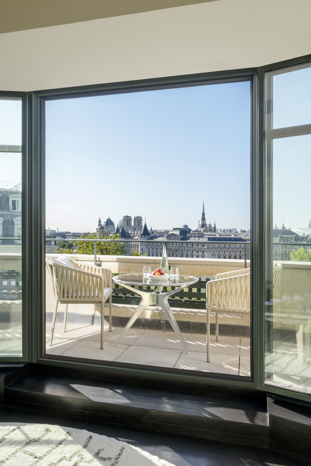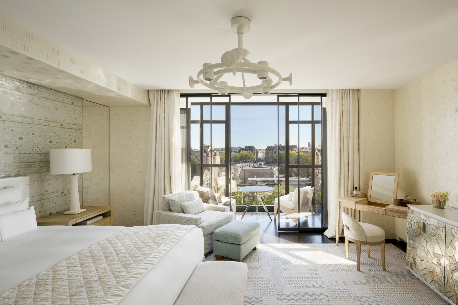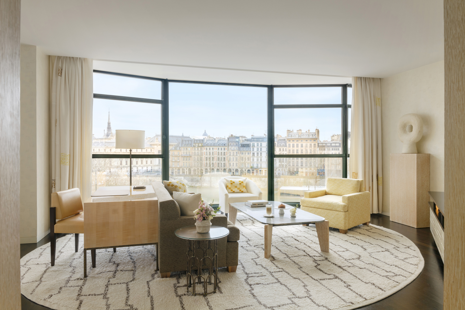 В ходе масштабной реставрации под руководством архитекторов Эдуарда Франсуа и Питера Марино современные технологии и стандарты ультрароскоши были бережно интегрированы в аутентичное архитектурное наследие. В отеле всего 72 номера, включая люксы и апартаменты. Номера в золотисто-бежевой цветовой гамме с панорамным остеклением наполнены светом и обставлены дизайнерской мебелью. Многие из них имеют впечатляющие виды на Сену, Эйфелеву башню и собор Парижской Богоматери. На верхнем этаже находится крупнейший в Париже двухуровневый пентхаус с бассейном, кинотеатром и панорамной террасой. Гостей сопровождают неповторимые ароматы от парфюмера Франсуа Демаши. Доступен сервис персонального батлера.
