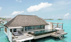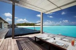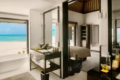 Вилла на воде. Спальня с кроватью king-size, гостиная, гардеробная, ванная комната с ванной и душевой кабиной, душ на открытом воздухе, терраса с обеденной зоной и частным открытым бассейном, прямой спуск к воде. Гостиная и спальня разделены дверью.