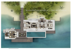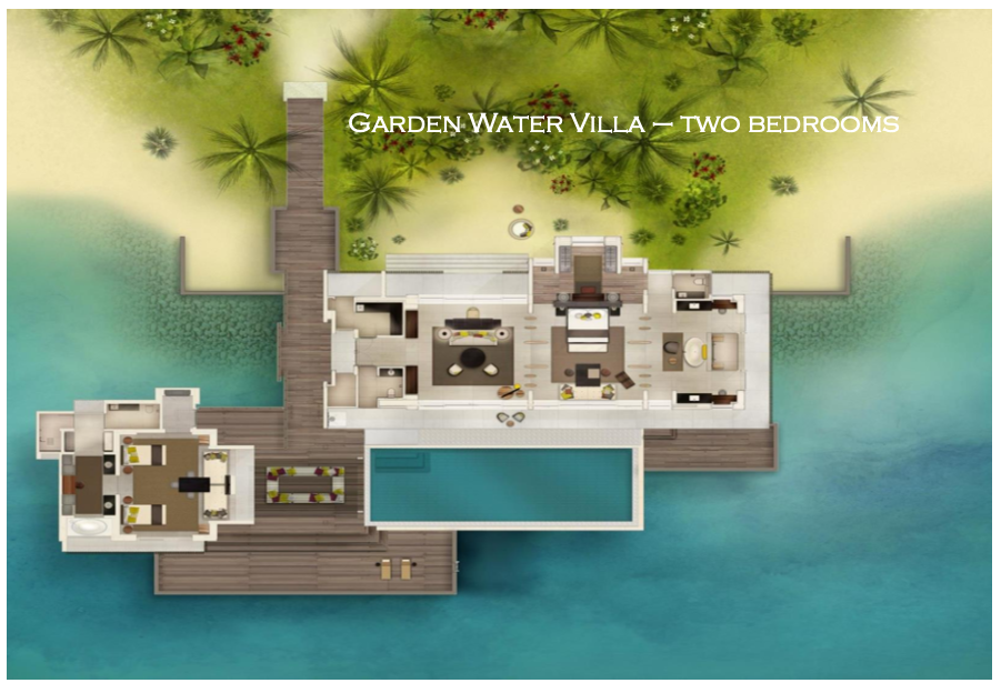 Вилла расположена частично на берегу, частично на воде. 2 спальни с кроватями king-size или кроватями twin, гостиная, гардеробная, 2 ванные комнаты (каждая с ванной и душевой кабиной), душ на открытом воздухе, частный сад с обеденной зоной, терраса с частным открытым бассейном, прямой спуск к воде. Гостиная и спальни разделены дверями.