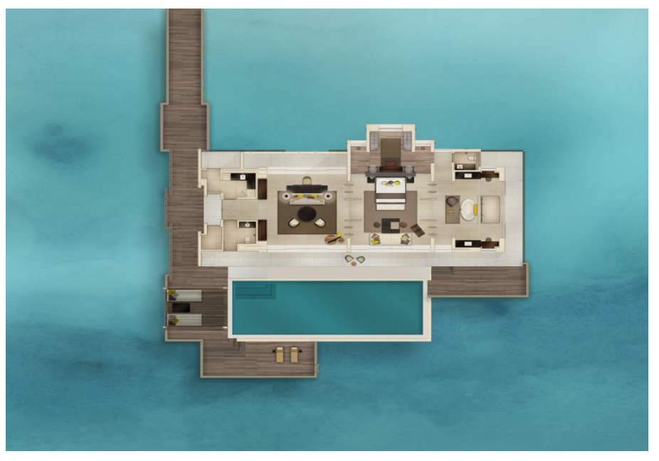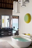 Вилла расположена частично на берегу, частично на воде. Спальня с кроватью king-size, гостиная, гардеробная, ванная комната с ванной и душевой кабиной, душ на открытом воздухе, частный сад с обеденной зоной на открытом воздухе, терраса с частным открытым бассейном, прямой спуск к воде. Гостиная и спальня разделены дверью.