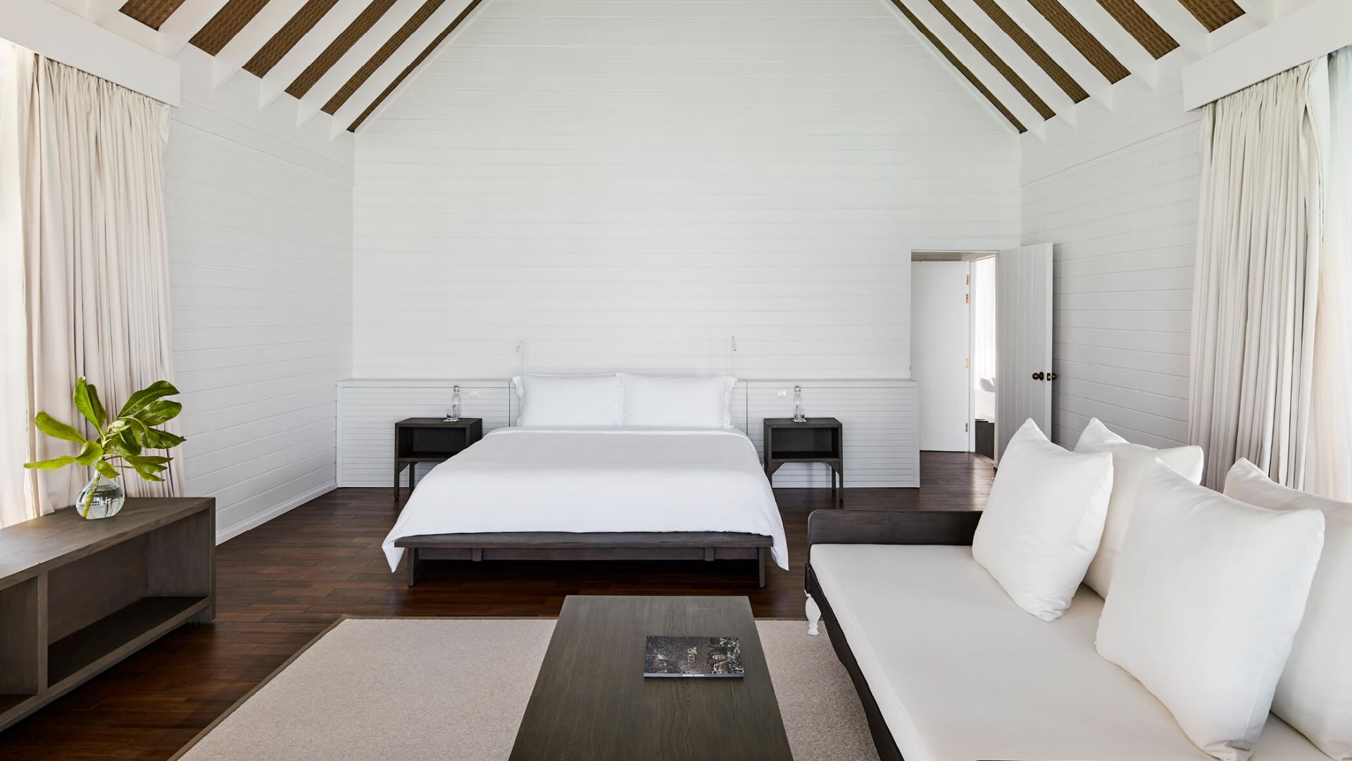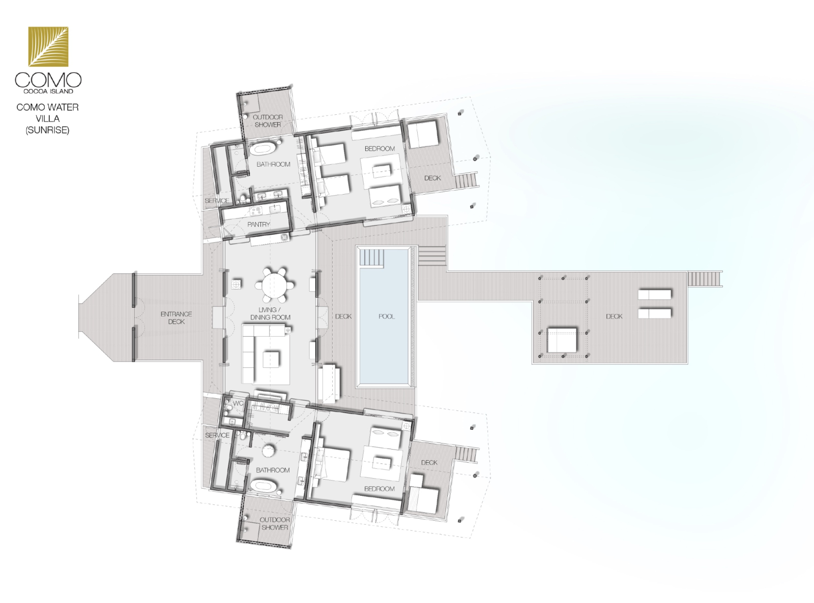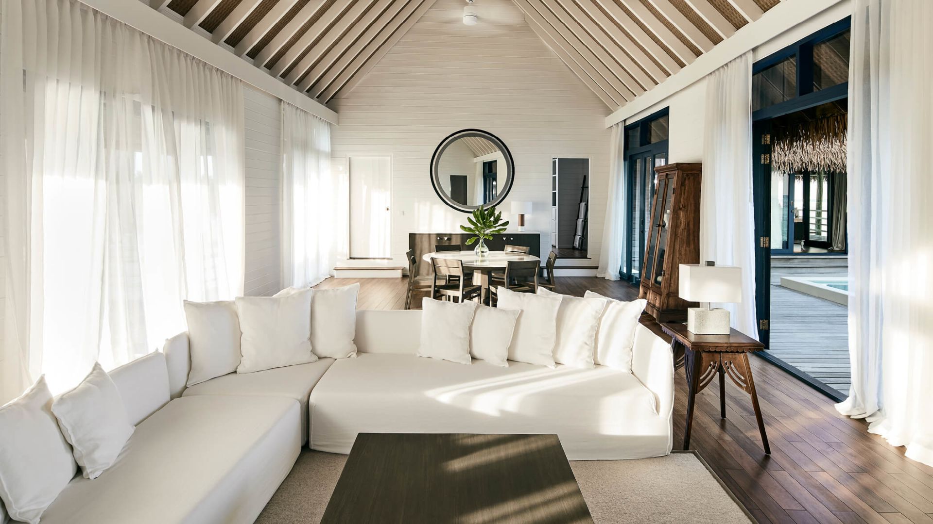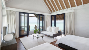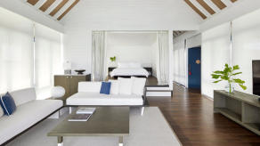 Вилла на воде. 2 спальни (одна – с кроватью king-size и гостиной зоной, другая – с кроватями twin и гостиной зоной), гостиная с обеденной зоной, кухня, гардеробная, 2 ванные комнаты (каждая с ванной и душевой кабиной), гостевой туалет, 2 душа на открытом воздухе, 3 террасы с прямым спуском к воде (одна из них – с бассейном, беседкой и обеденной зоной на открытом воздухе). Гостиная и спальни разделены дверями.