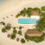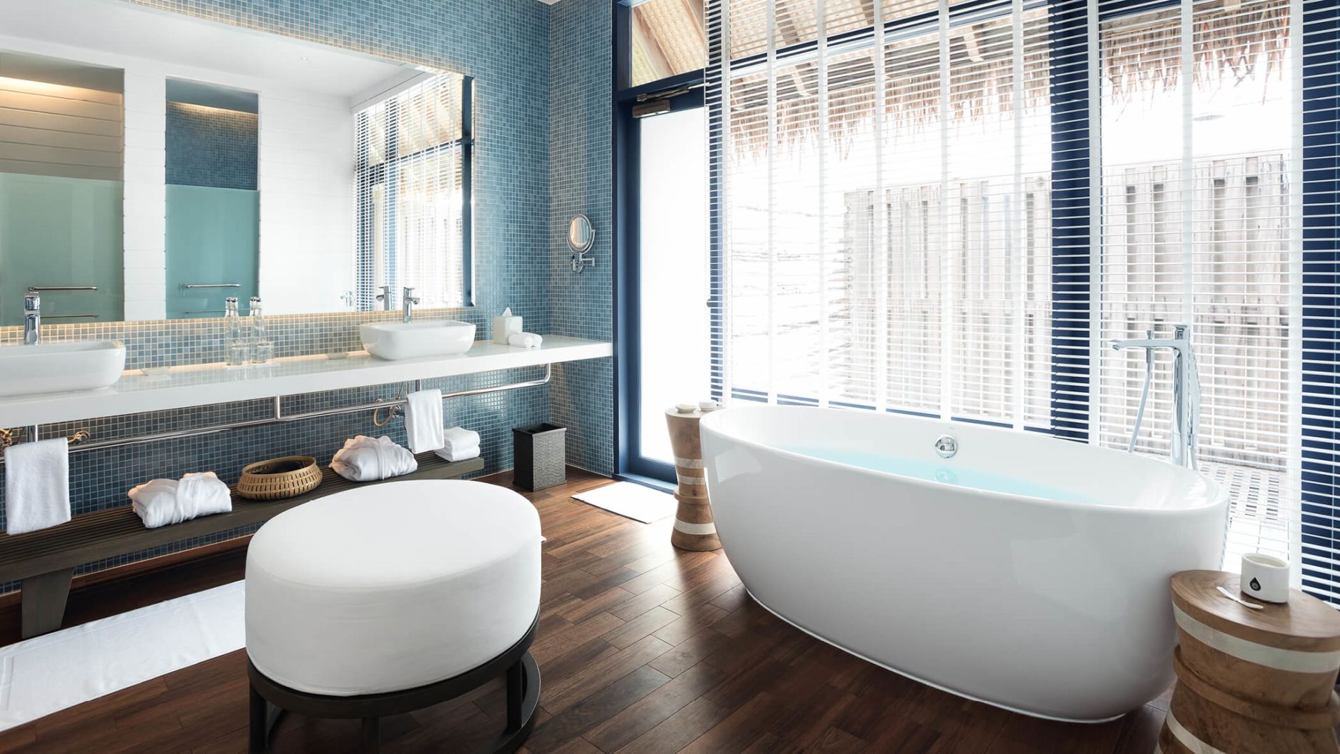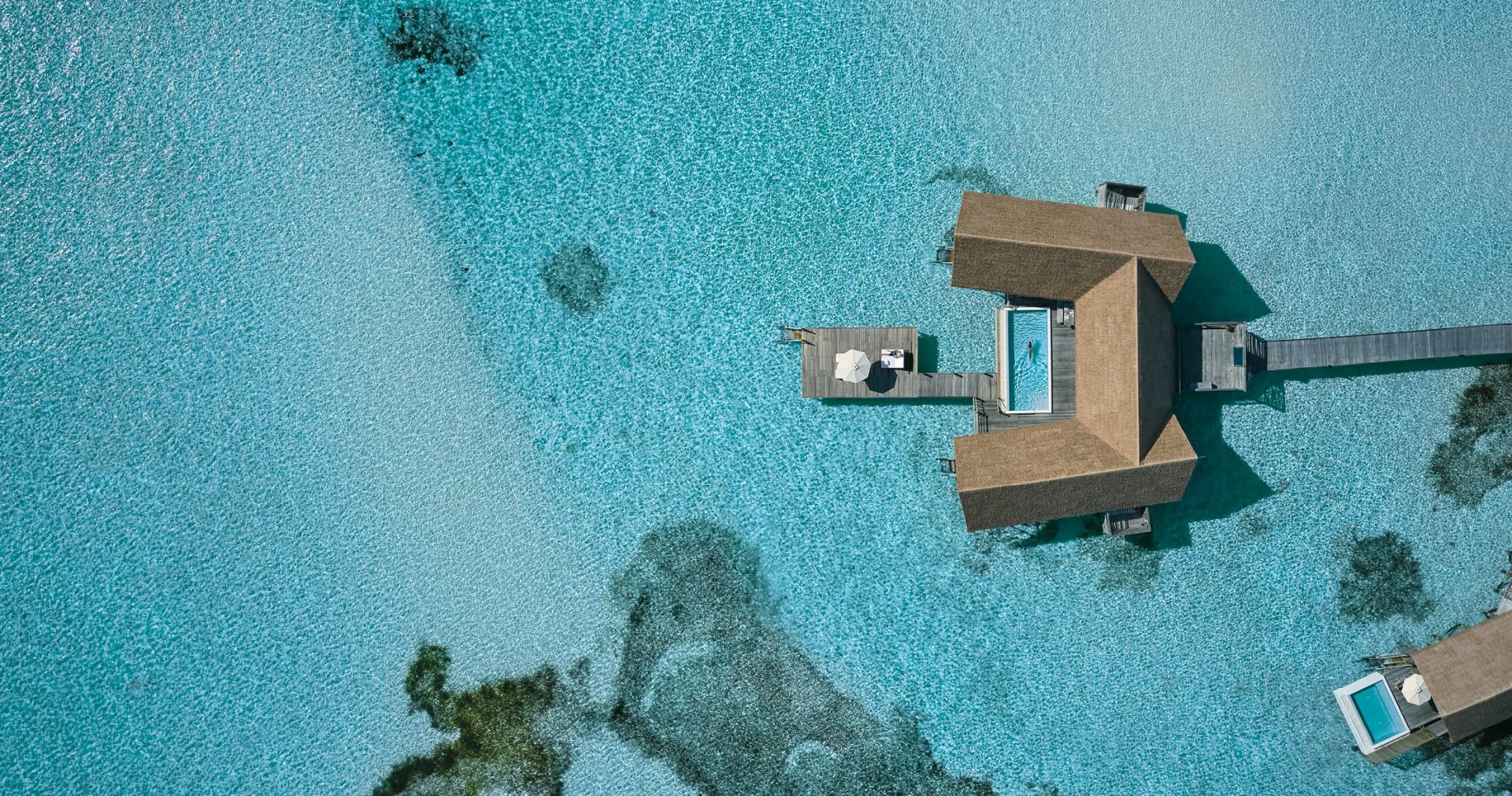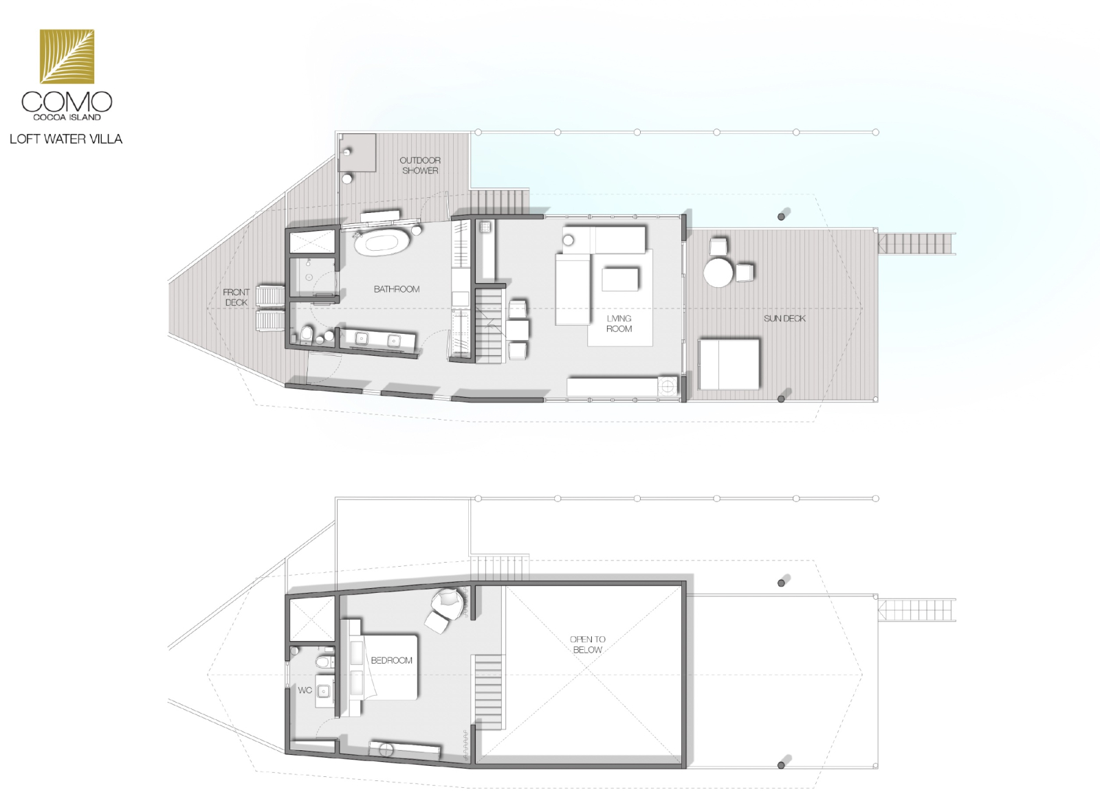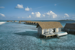 Вилла на воде. 2 спальни (одна – с кроватью king-size и гостиной зоной, другая – с кроватями twin и гостиной зоной), гостиная с обеденной зоной, кухня, гардеробная, 2 ванные комнаты (каждая с ванной и душевой кабиной), гостевой туалет, 2 душа на открытом воздухе, 3 террасы с прямым спуском к воде (одна из них – с бассейном, беседкой и обеденной зоной на открытом воздухе). Гостиная и спальни разделены дверями.