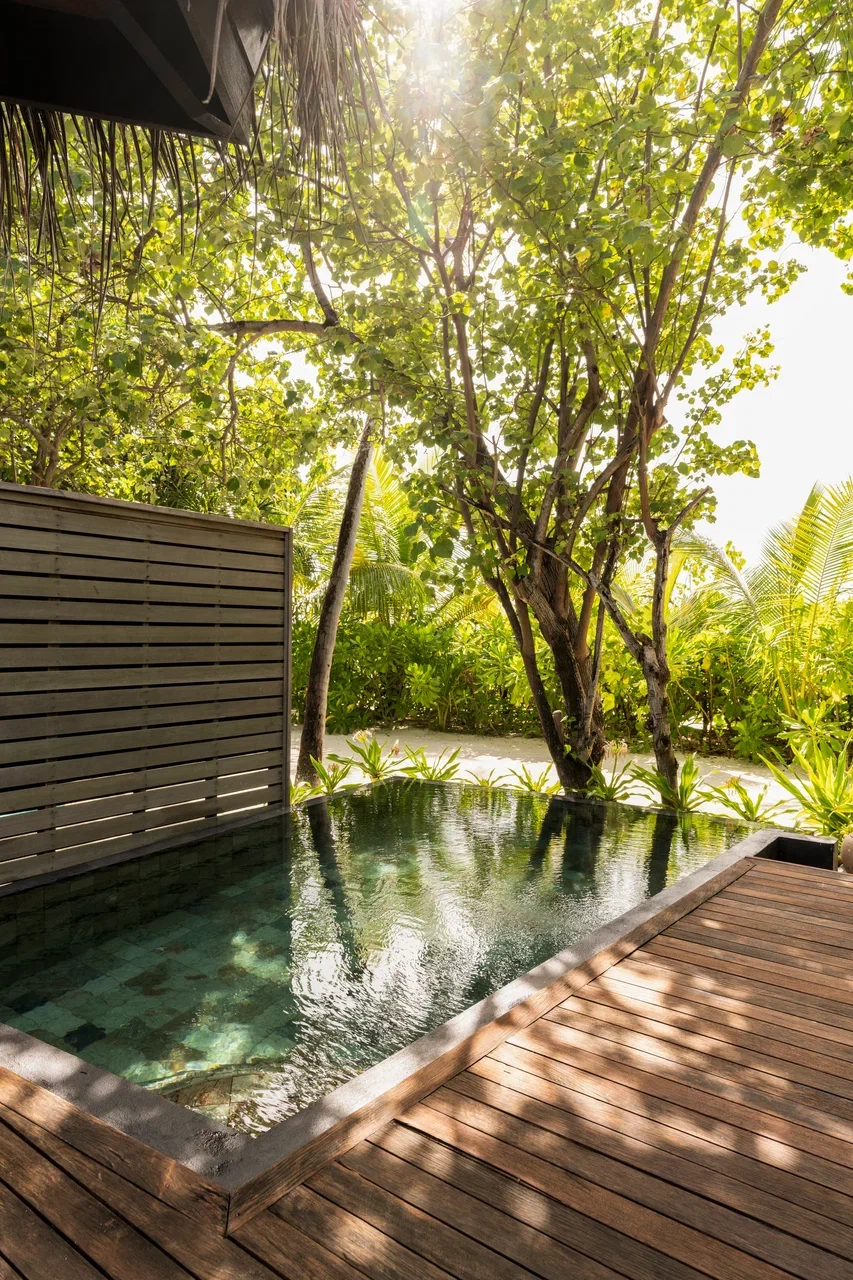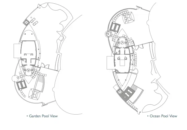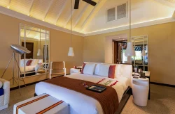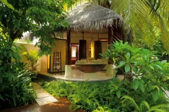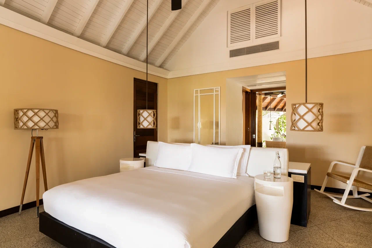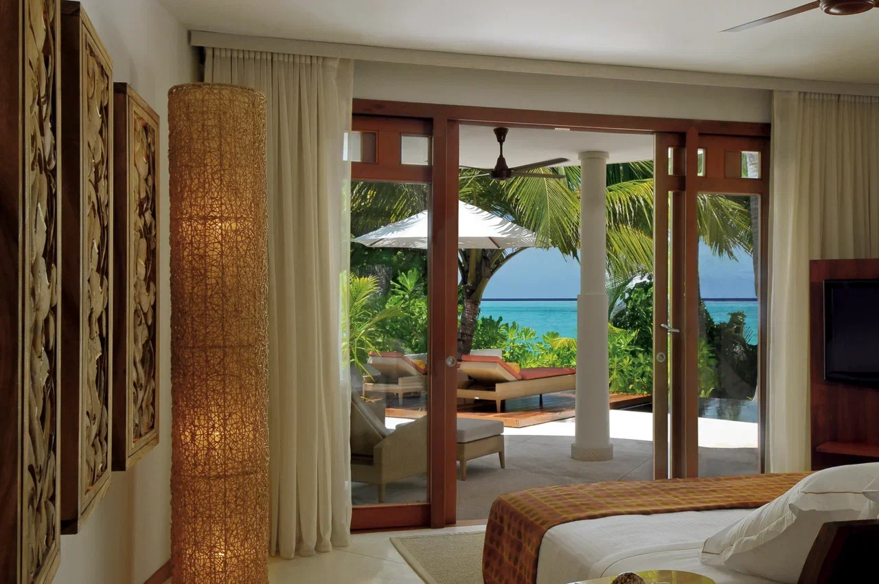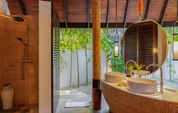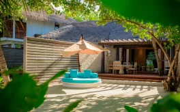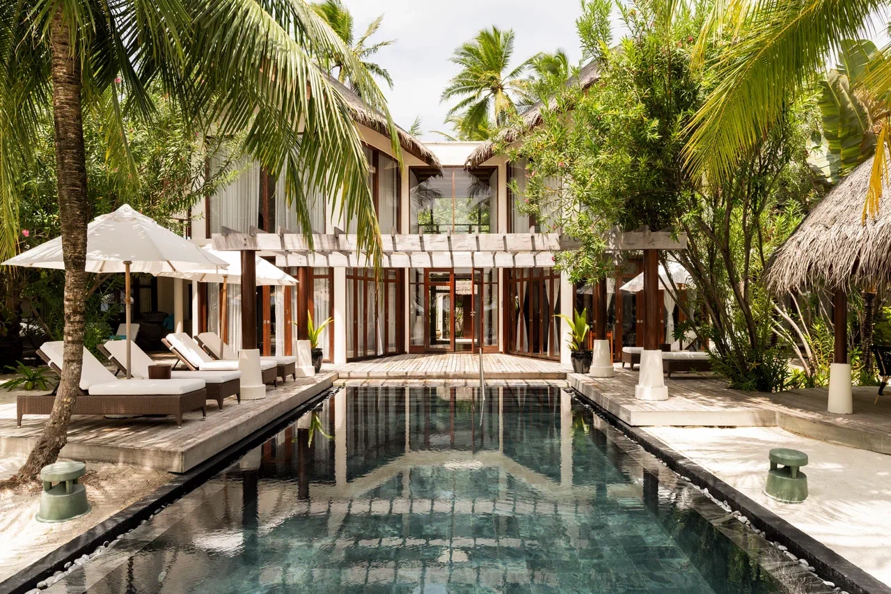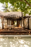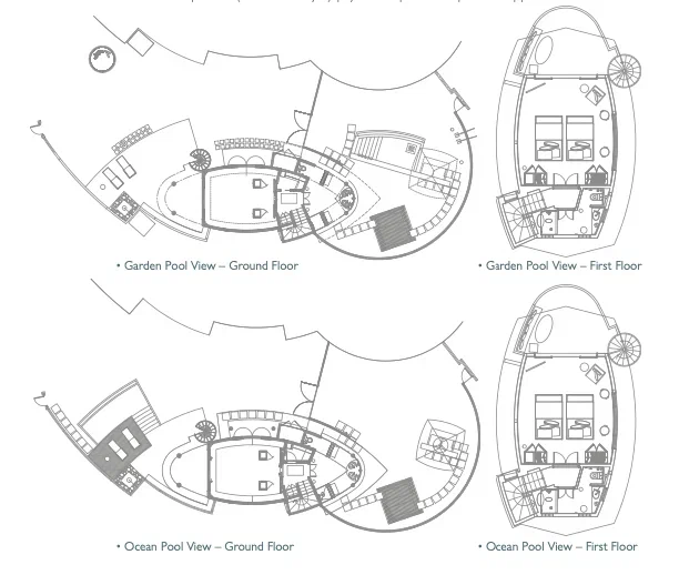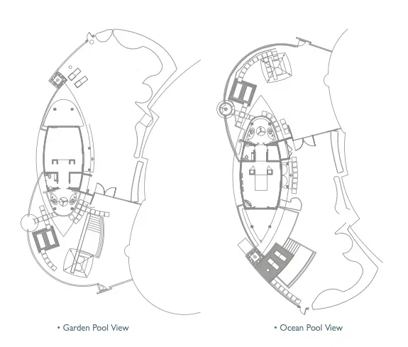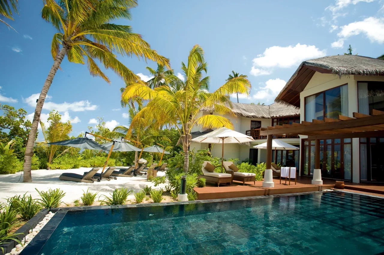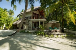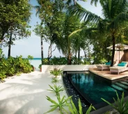 Вилла на берегу. 2 спальни с кроватями king-size, гостиная, 2 ванные комнаты (каждая с душевой кабиной), 2 душа на открытом воздухе, 3 террасы (две – с бассейнами, одна – с обеденной зоной на открытом воздухе). Гостиная и спальни разделены дверями.