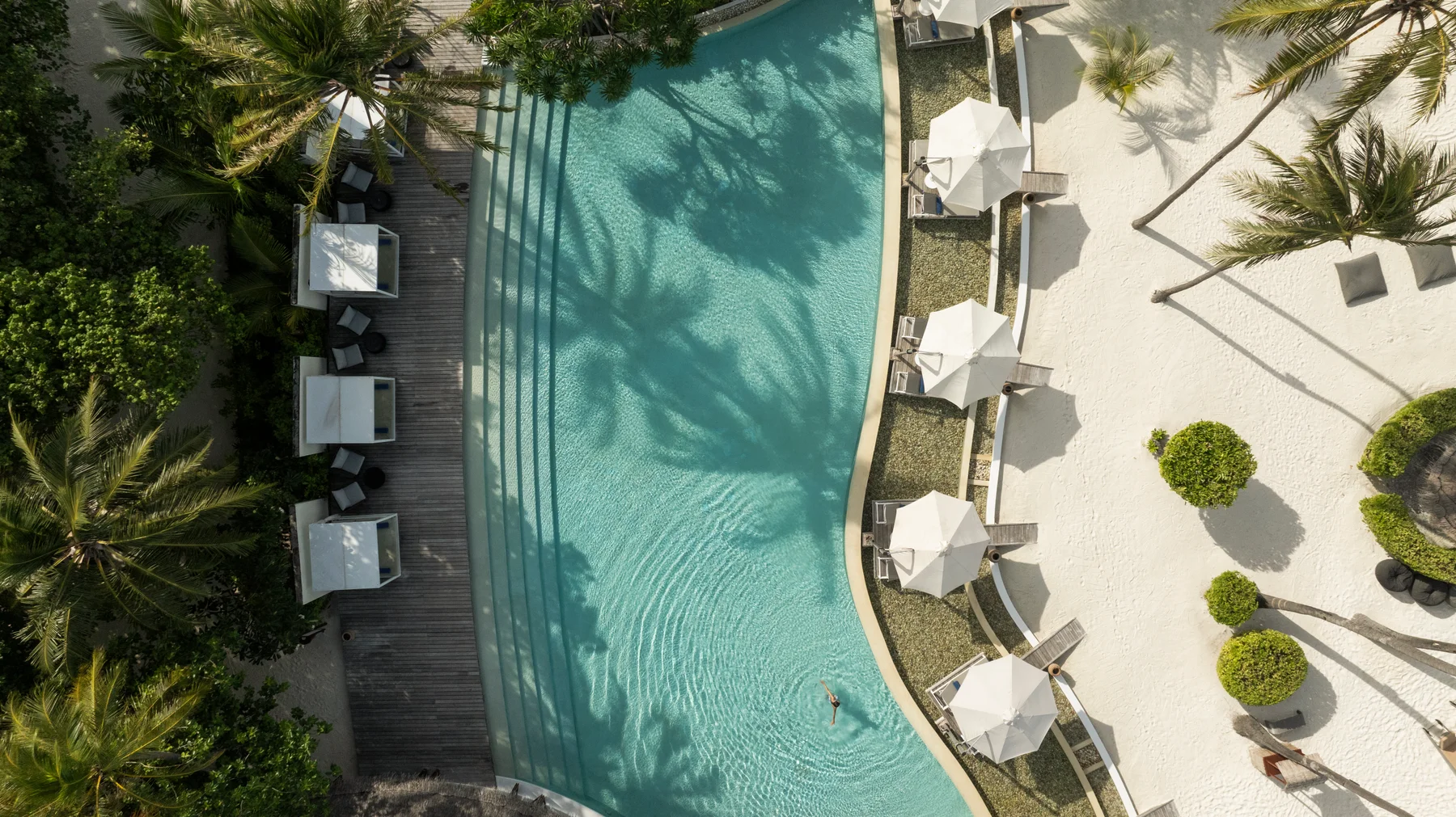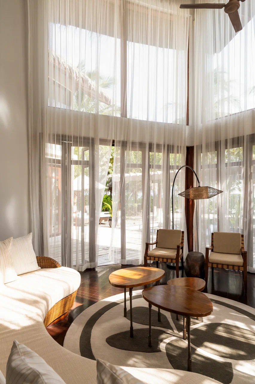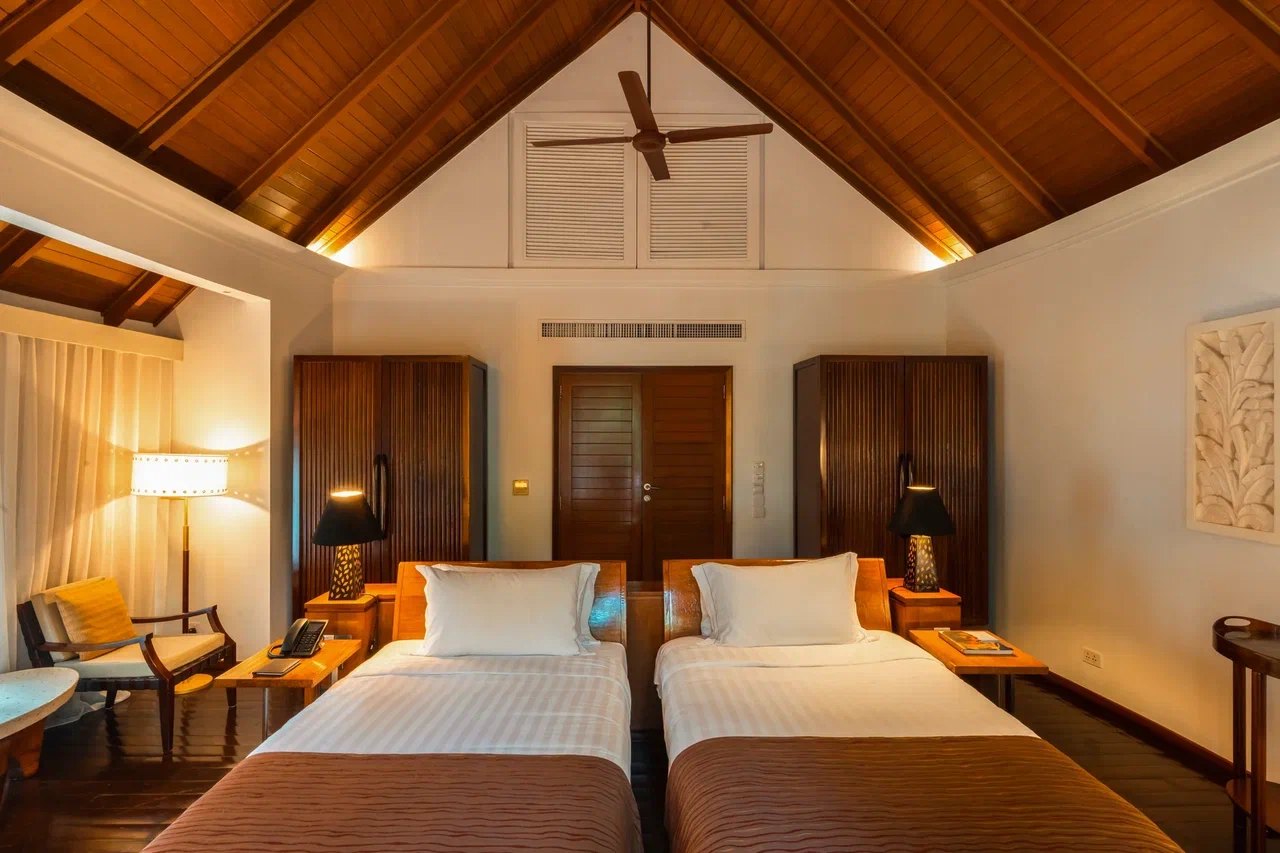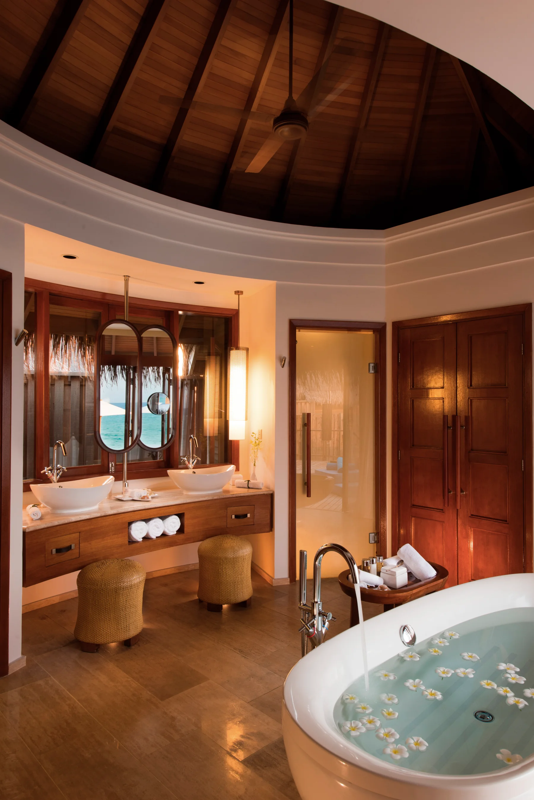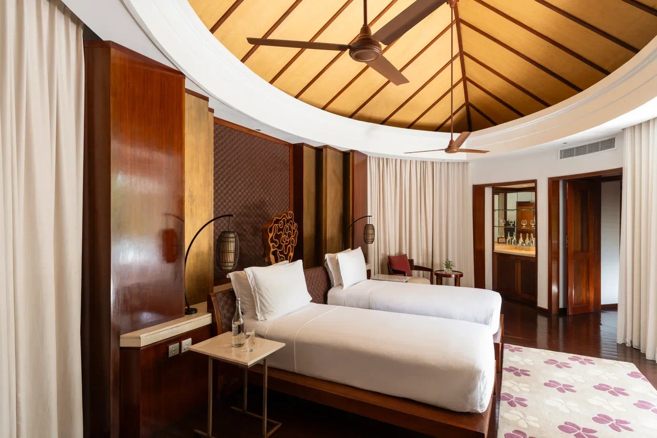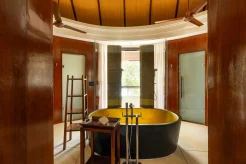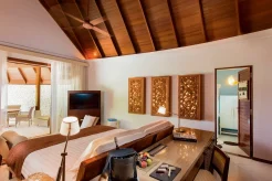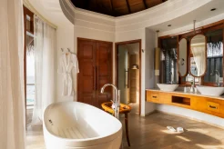 Вилла на берегу. 2 спальни с кроватями king-size, гостиная, 2 ванные комнаты (каждая с душевой кабиной), 2 душа на открытом воздухе, 3 террасы (две – с бассейнами, одна – с обеденной зоной на открытом воздухе). Гостиная и спальни разделены дверями.