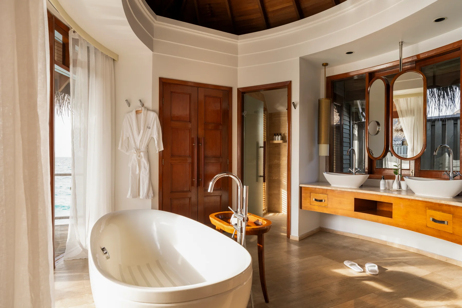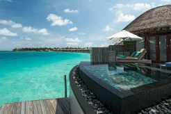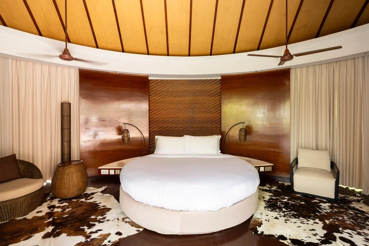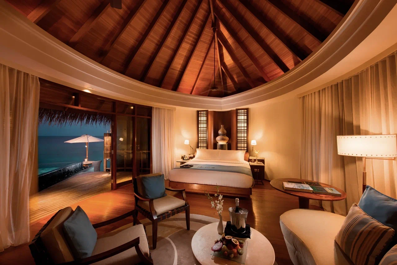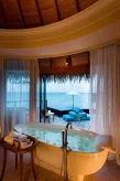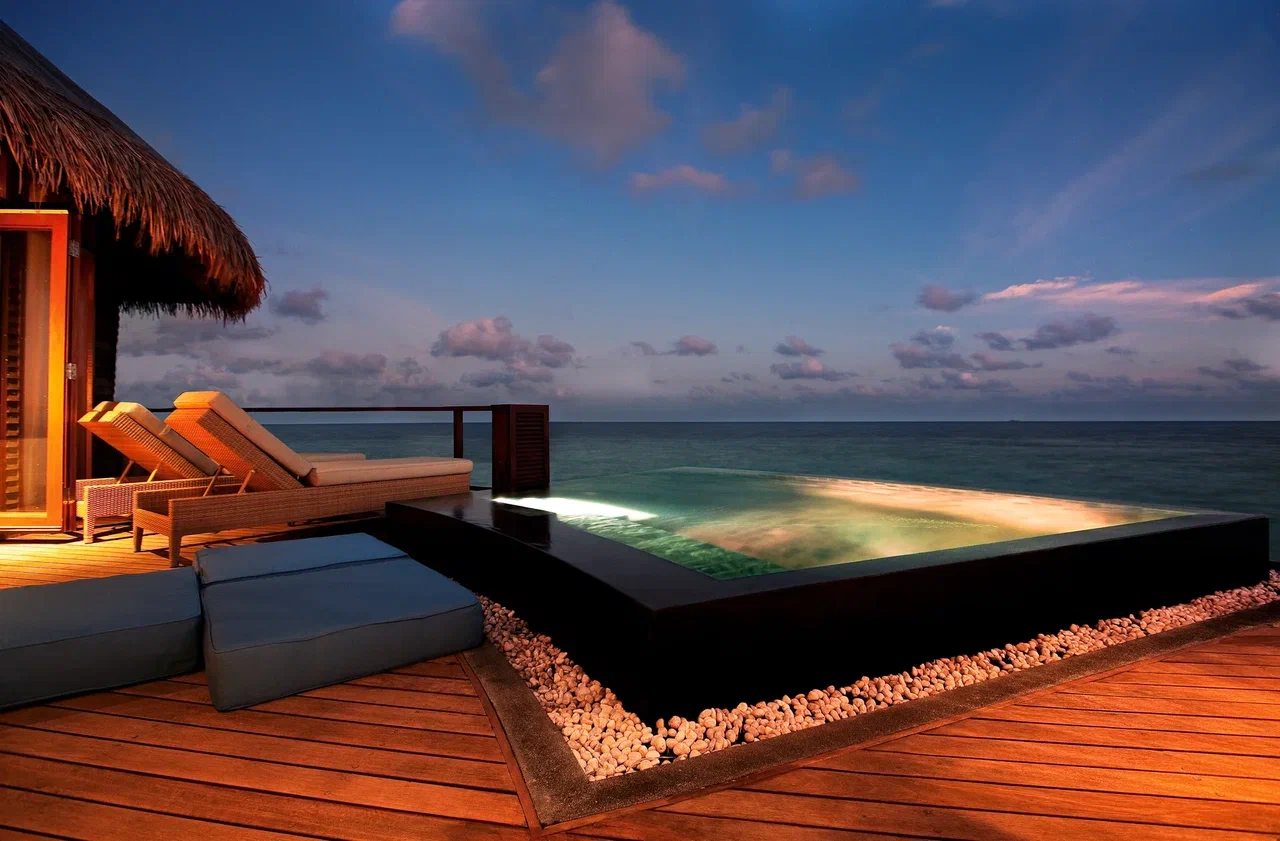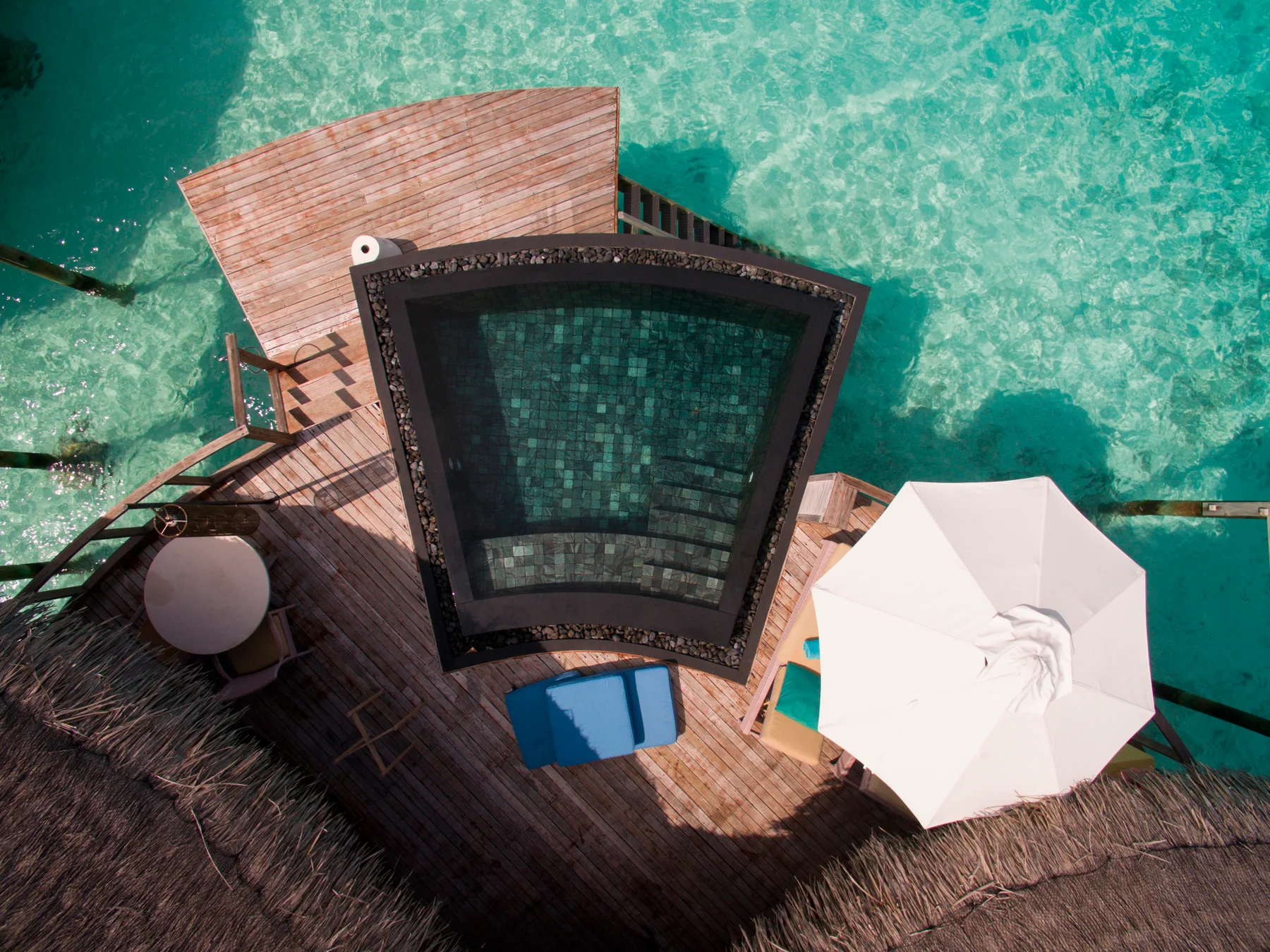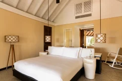 Вилла на воде. Спальня с кроватью king-size, гостиная зона, ванная комната с ванной и душевой кабиной, терраса с бассейном и прямым спуском к воде.