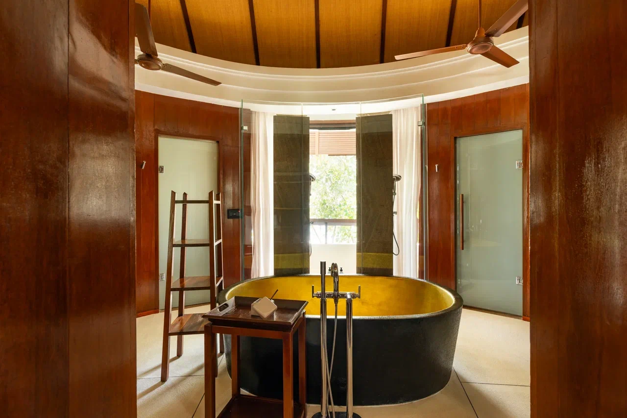 Вилла на берегу. Спальня с кроватью king-size, ванная комната с душевой кабиной, душ на открытом воздухе, терраса с бассейном и обеденной зоной на открытом воздухе.