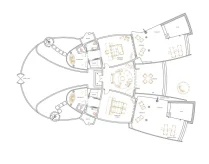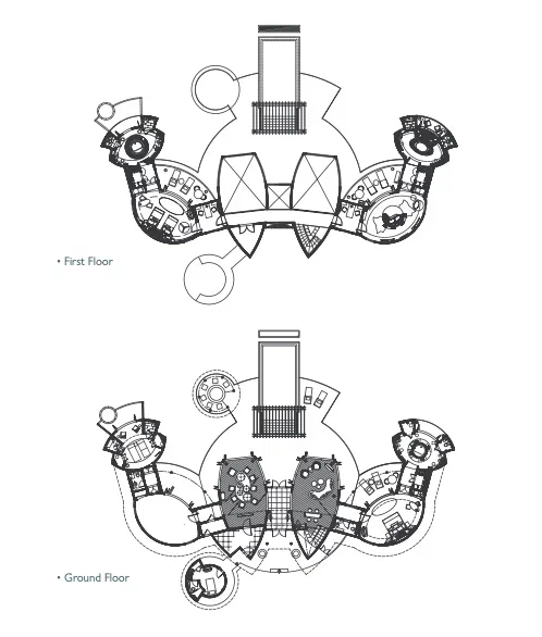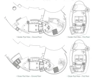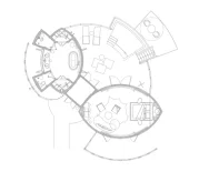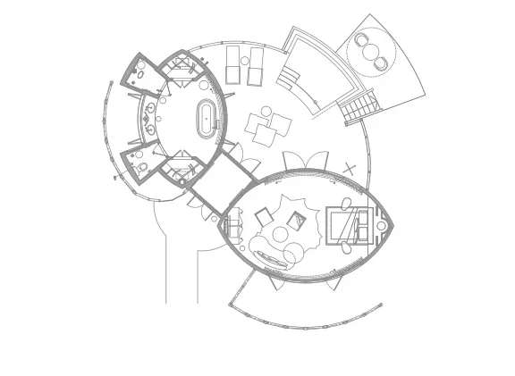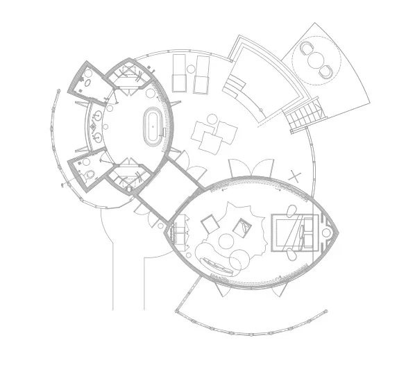 На 1-м этаже: спальня с кроватью king-size, гостиная, гардеробная, столовая, ванная комната с ванной и душевой кабиной, гостевой туалет, тренажёрный зал, комната для спа-процедур, комната для обслуживающего персонала, джакузи на открытом воздухе, терраса с бассейном и беседкой с обеденной зоной. Гостиная и спальня разделены дверью.
