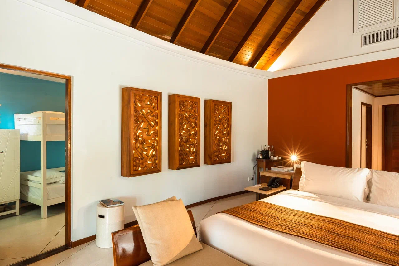 Вилла на берегу. Спальня с кроватью king-size, детская спальня с двухъярусной кроватью, ванная комната с душевой кабиной, душ на открытом воздухе, терраса с бассейном и обеденной зоной на открытом воздухе.