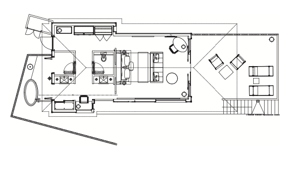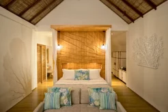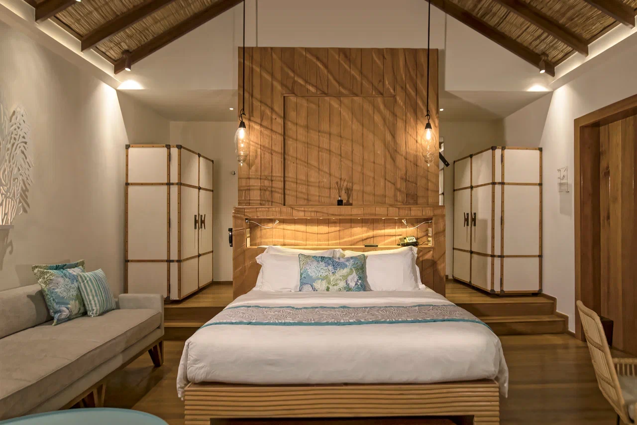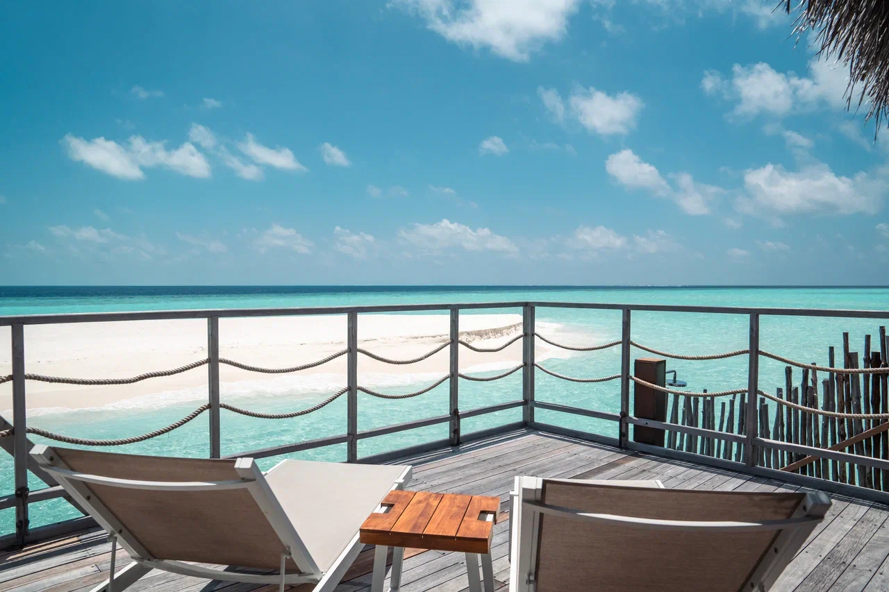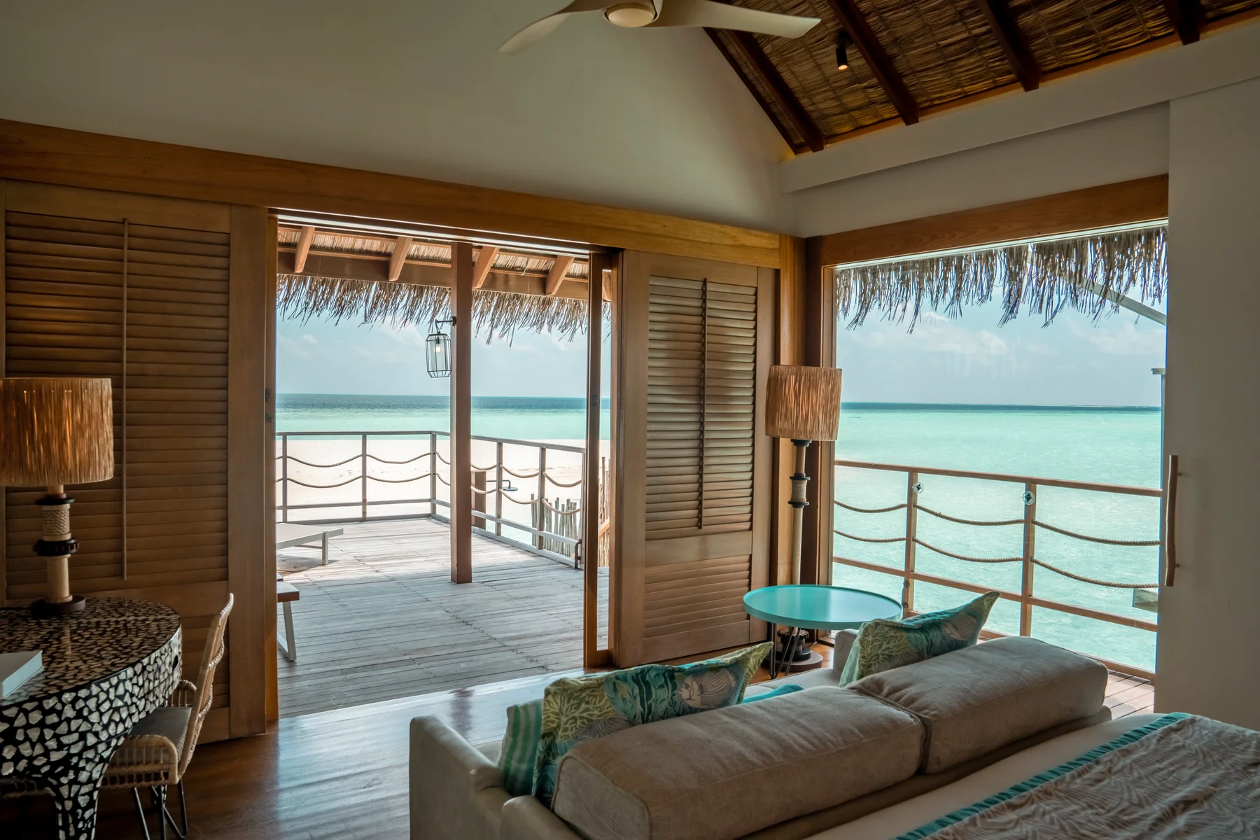 Вилла на воде. Спальня с кроватью king-size и гостиной зоной, ванная комната с душевой кабиной, терраса с прямым спуском к воде.