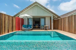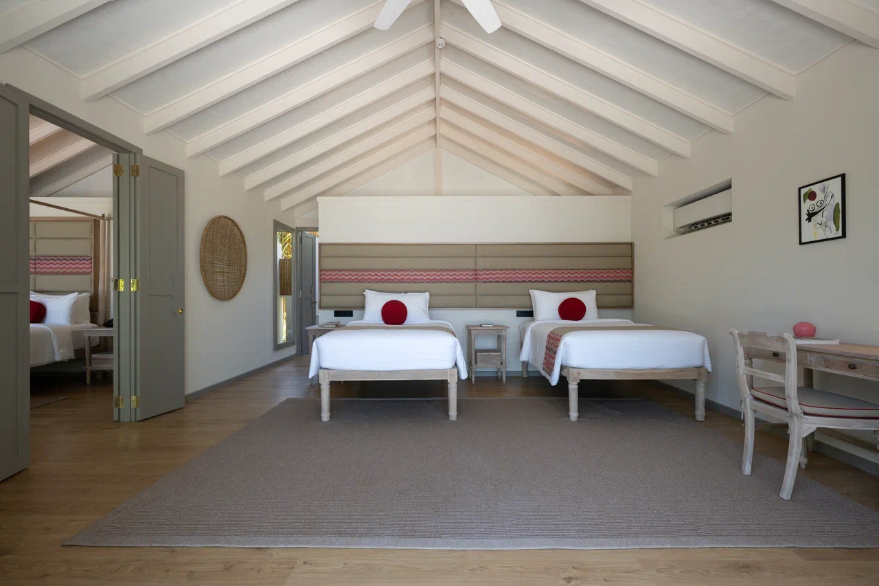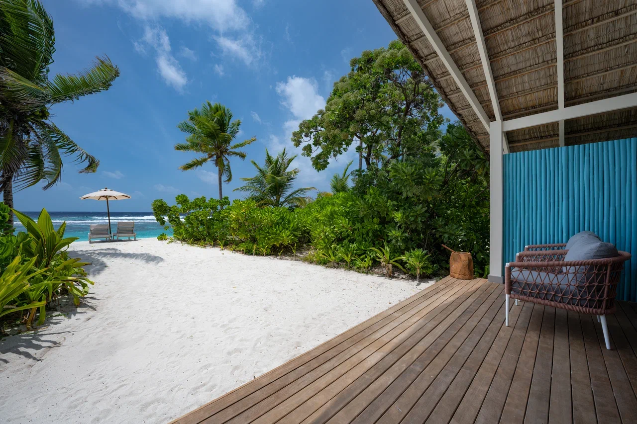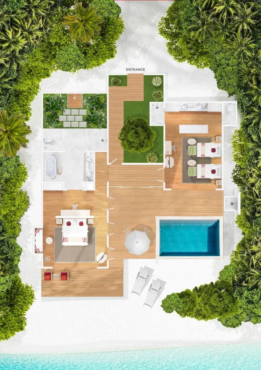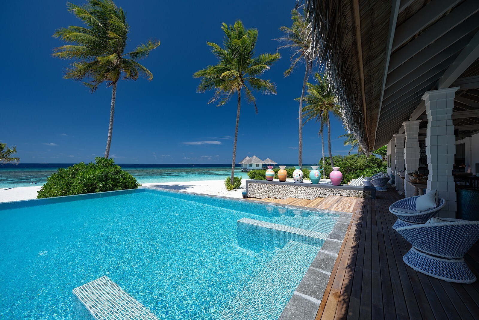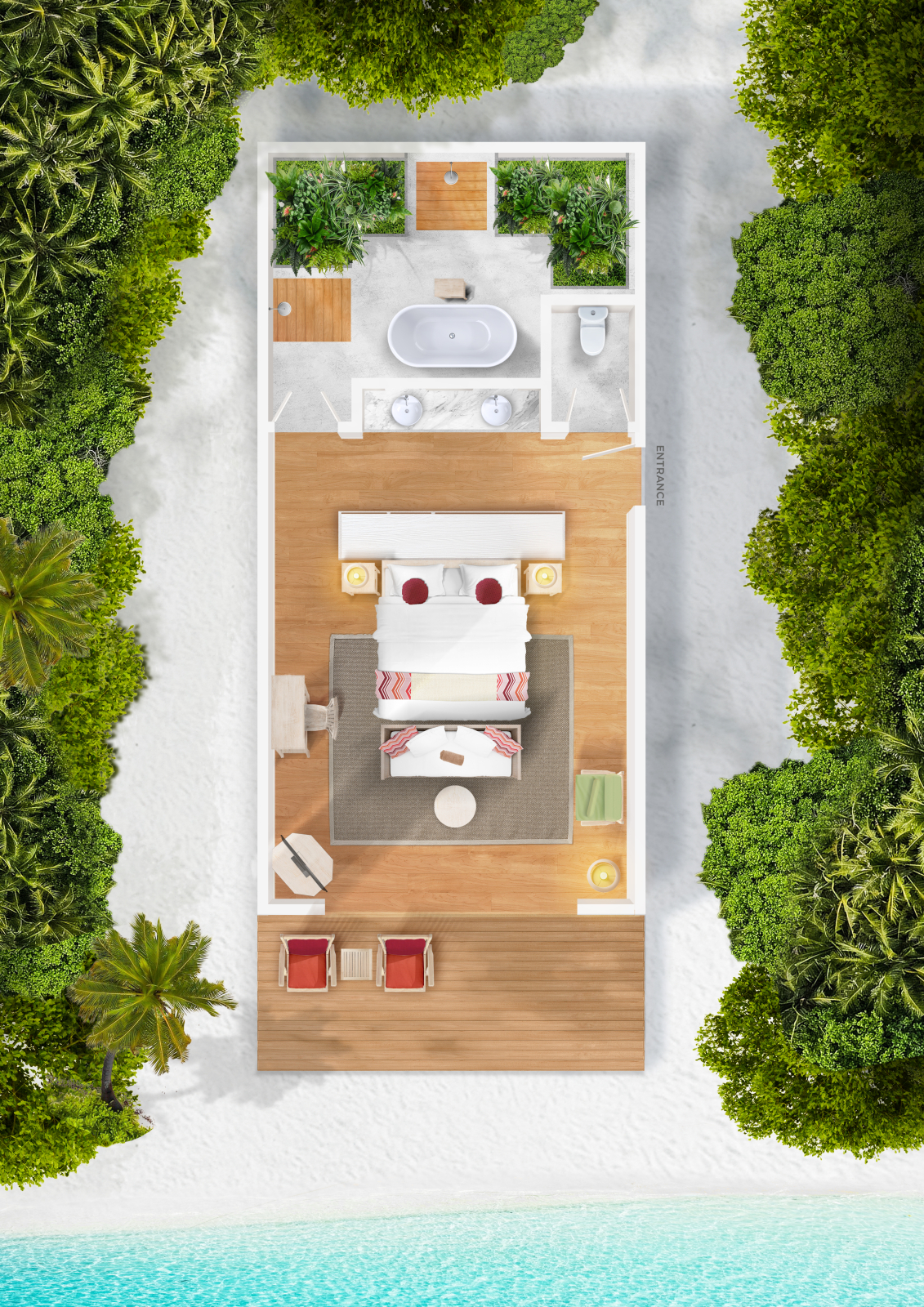 Вилла на берегу. 2 спальни (одна – с кроватью king-size, другая – с кроватями twin), 2 ванные комнаты (одна – с ванной и душевой кабиной, другая – с душевой кабиной), 2 душа на открытом воздухе, терраса с бассейном.