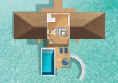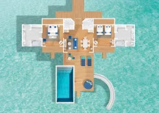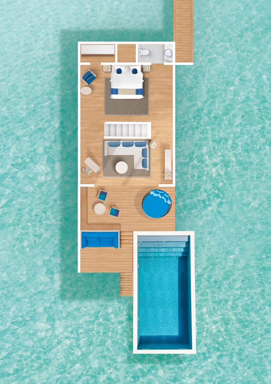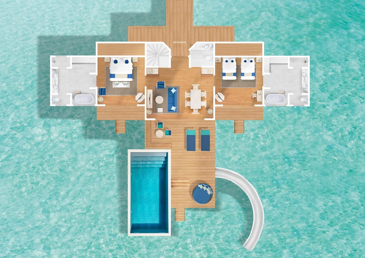 Двухэтажная вилла на воде. 1 спальня, 1 ванная комната, 1 гостевой туалет.