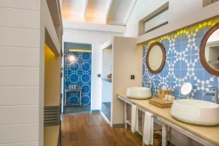 На 1-м этаже: 2 спальни (одна – с кроватью king-size, другая – с кроватями twin), гостиная с обеденной зоной, 2 ванные комнаты (каждая с ванной и душевой кабиной), гостевой туалет, терраса с бассейном, водной горкой и прямым спуском к воде. Гостиная и спальни разделены дверями.