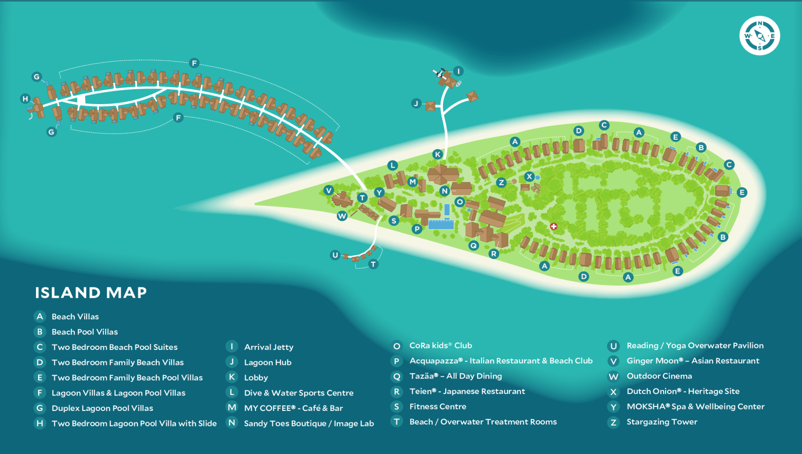 В японском ресторане Teien готовят блюда в формате тэппанъяки и кусияки на гриле. В итальянском заведении Acquapazza вечернюю атмосферу дополняют диджей-сеты. Кофе для ресторанов и баров обжаривают непосредственно на острове. Спа-центр Moksha Spa & Wellbeing специализируется на расслабляющих и восстановительных процедурах для лица и тела на базе натуральных масел и продуктов собственной линии Moksha. Также в программу входят йога и саундхилинг; спа-кабинеты расположены в саду и на воде. Курорт известен своим музеем мальдивской культуры Dutch Onion: в нём представлено более 400 артефактов, а также 120-летний мальдивский дом и храмовый резервуар, найденный в ходе археологических раскопок. Размещение предлагается исключительно по системе premium all inclusive.