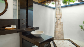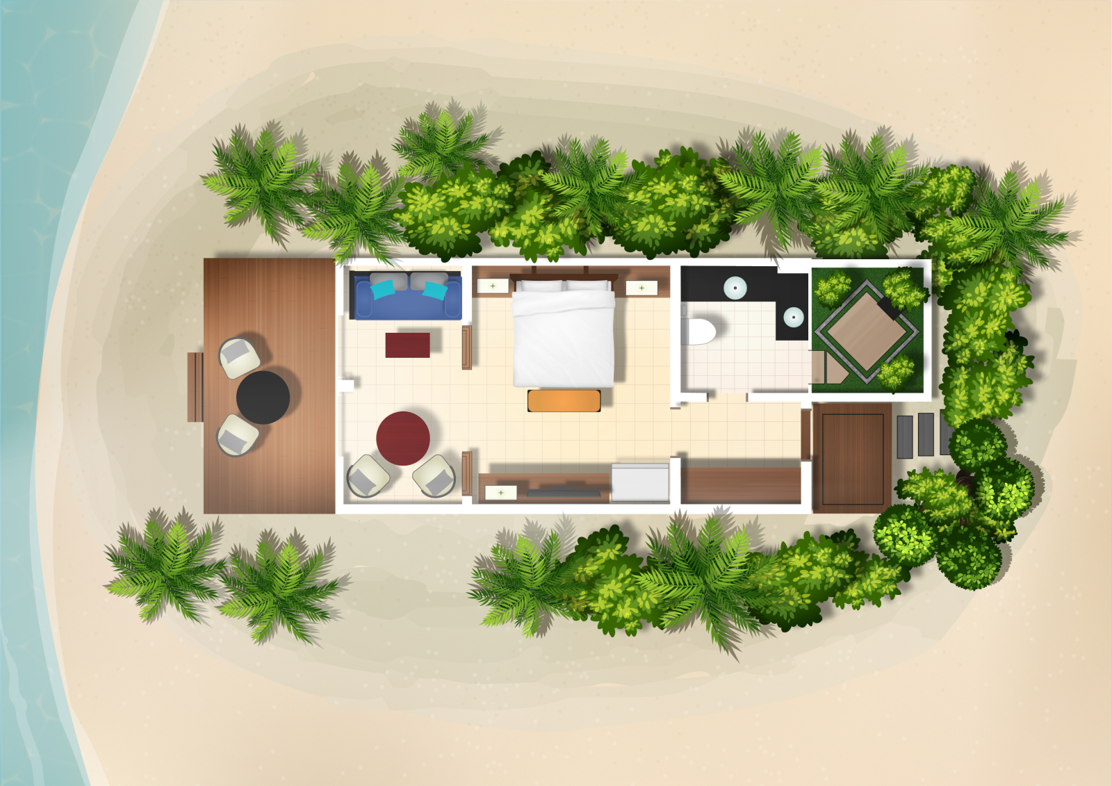 Вилла на берегу. Спальня с кроватью king-size, гостиная зона, ванная комната с душем с эффектом дождевого тумана на открытом воздухе, терраса.