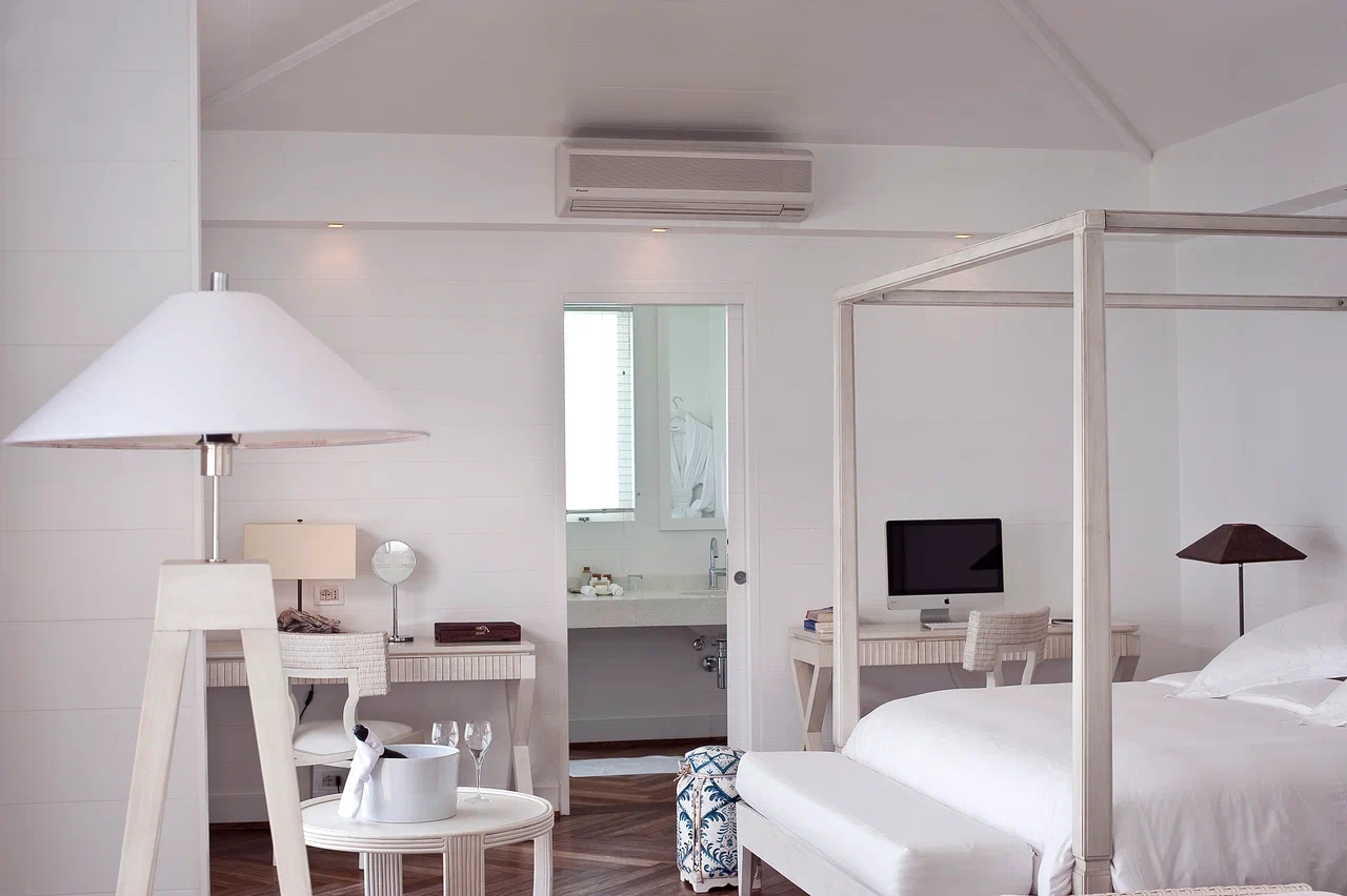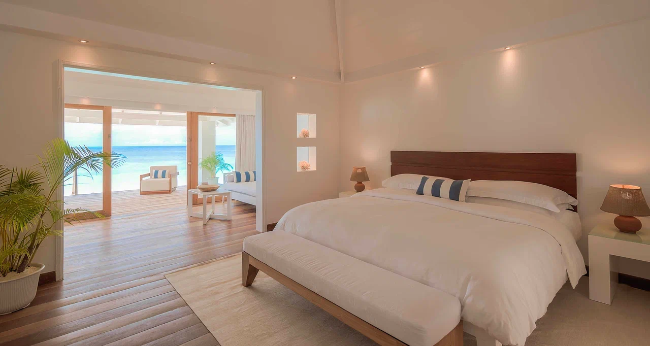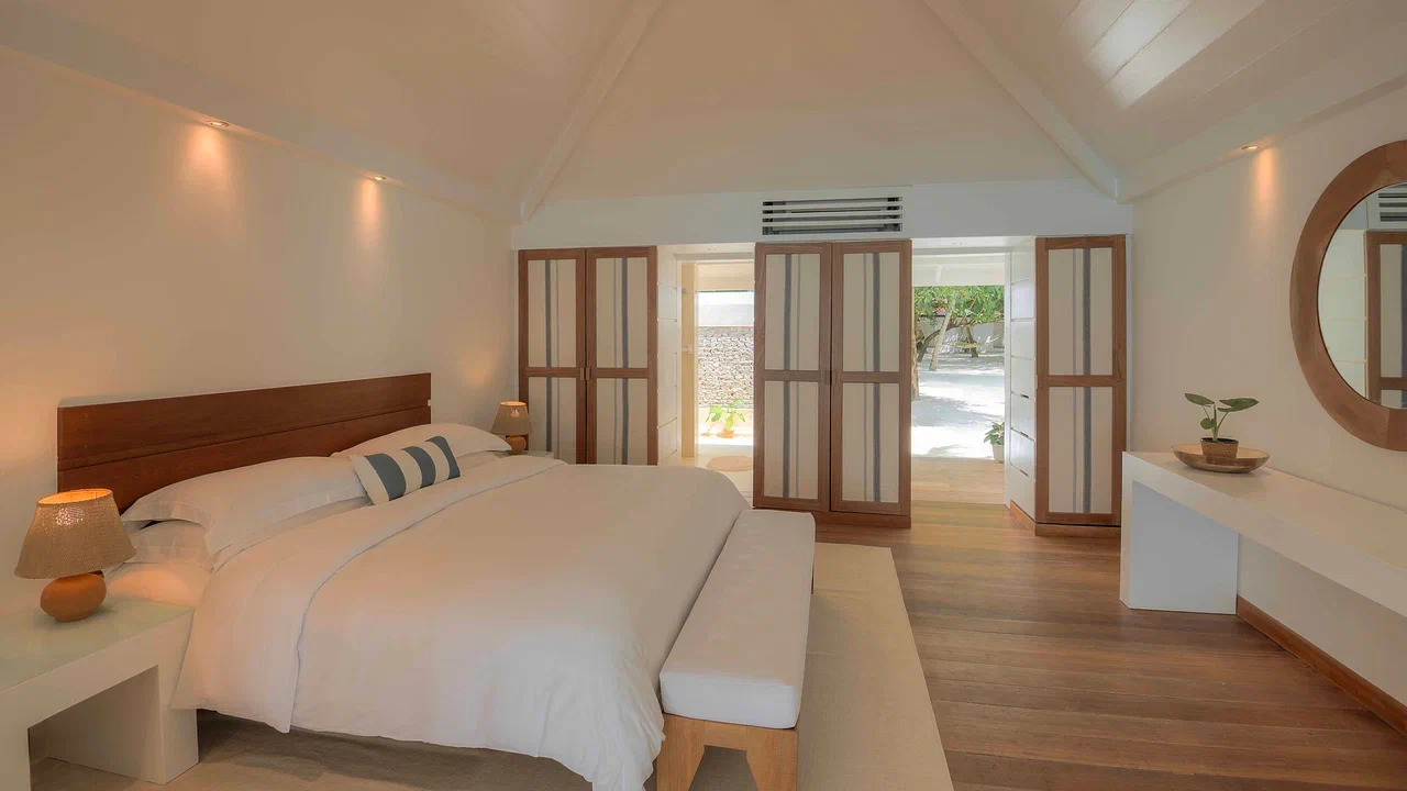 Вилла на берегу. Спальня с кроватью king-size, ванная комната с душем на открытом воздухе, терраса.