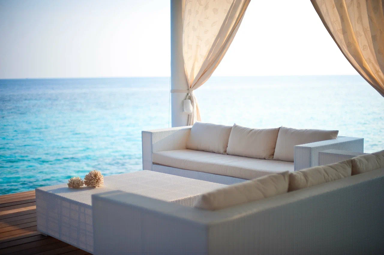 Вилла на воде. Спальня с кроватью king-size, гостиная зона, ванная комната с душевой кабиной, терраса с обеденной зоной, гамаком над водой и прямым спуском к воде.
